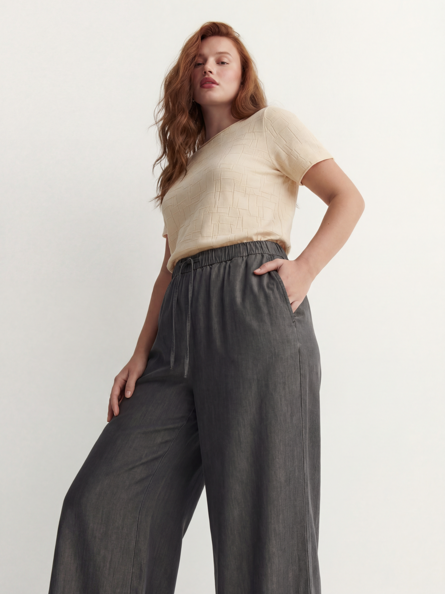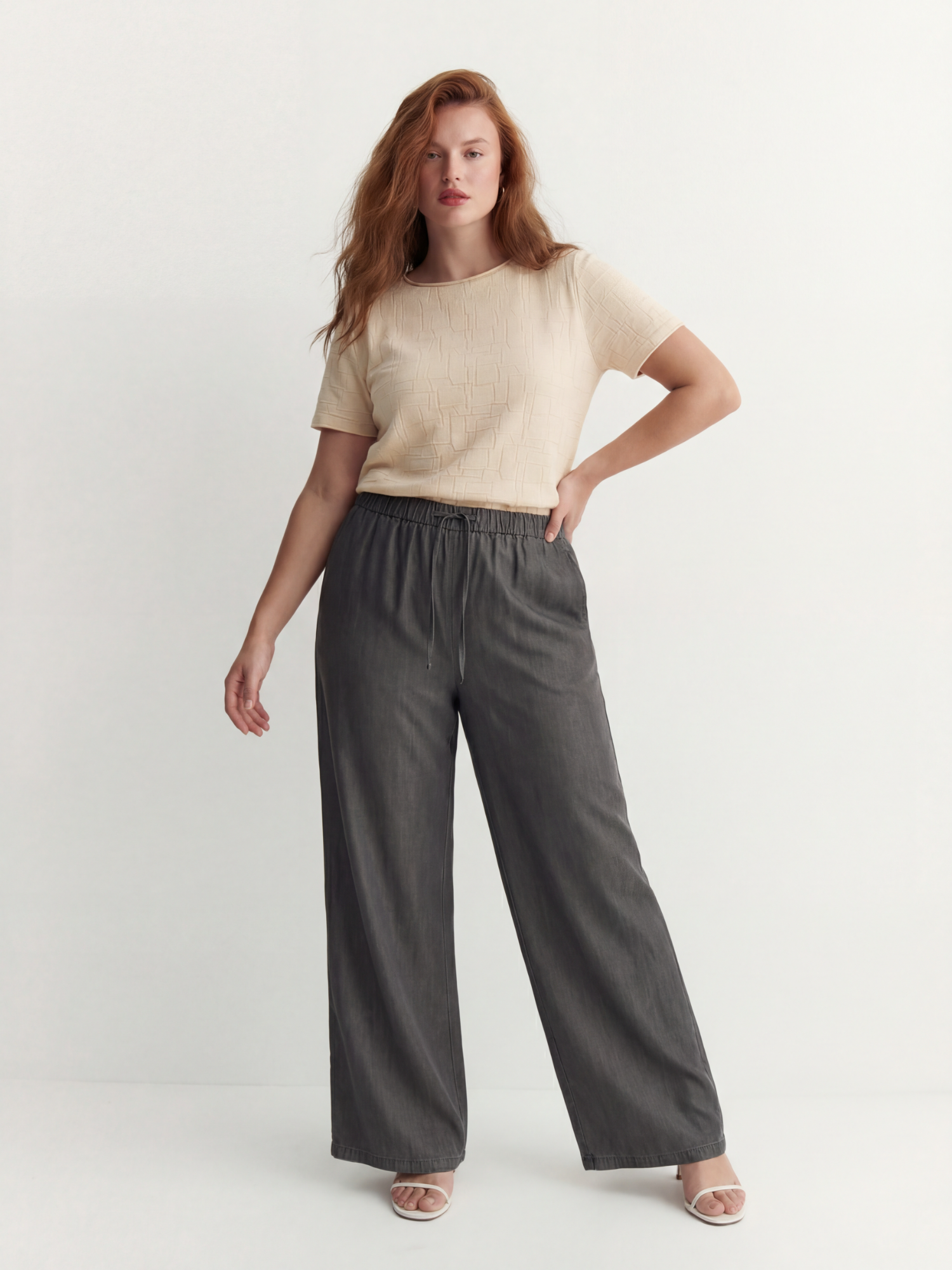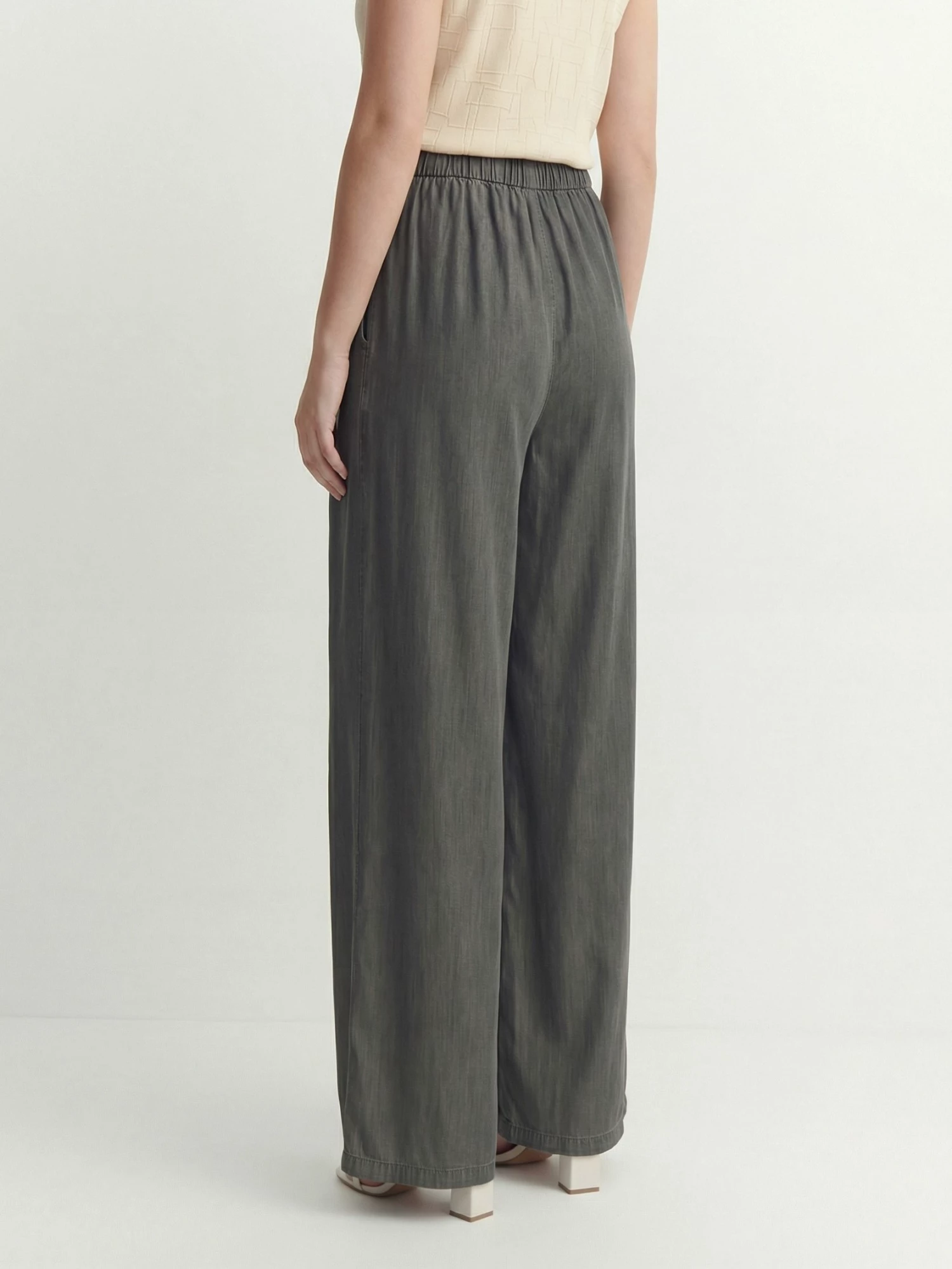Прямые широкие брюки в цвете темно-серого денима. Полотно на основе вискозы отличается мягкостью и драпируемостью, создавая плавные линии и подчеркивая женственный силуэт.