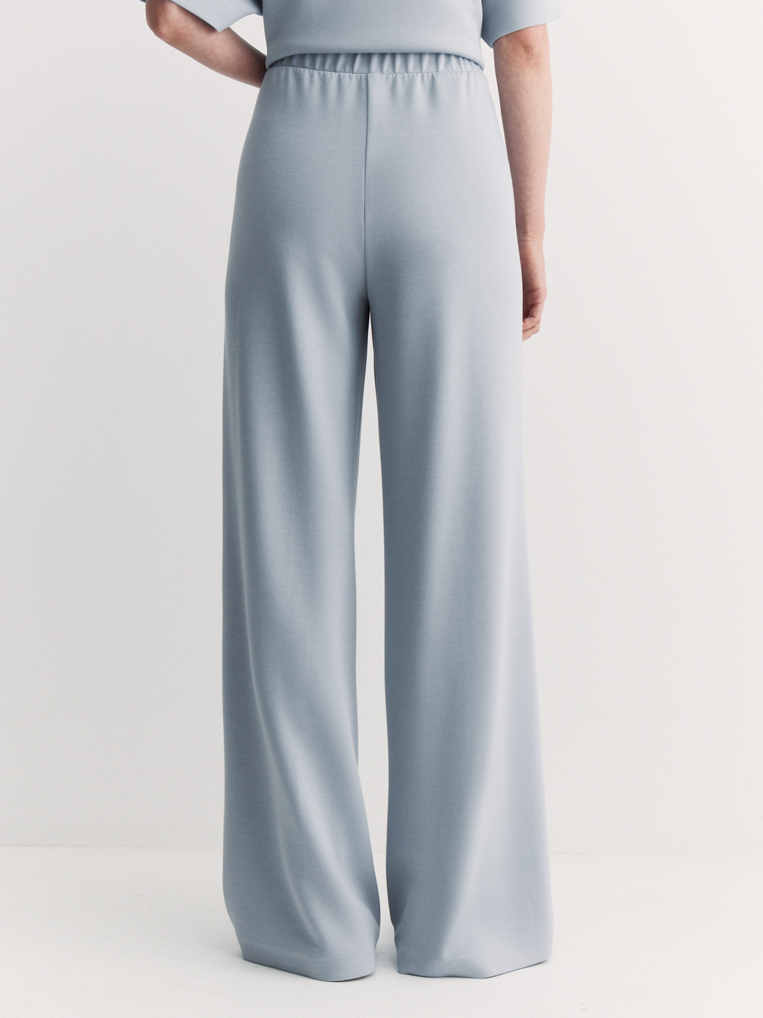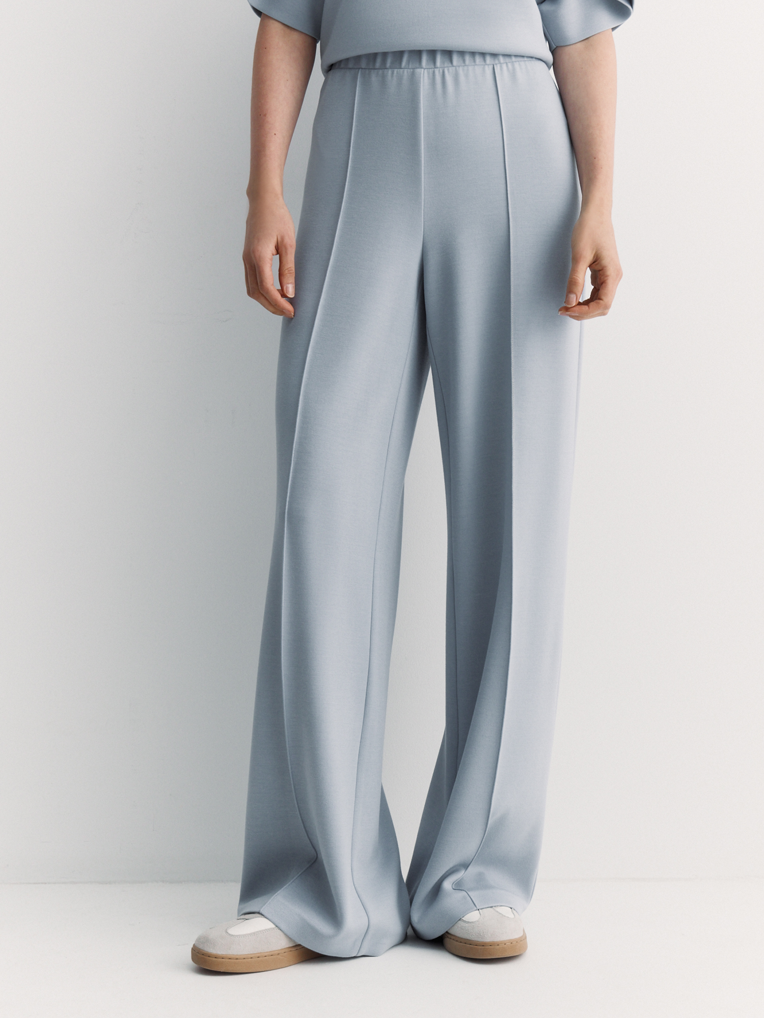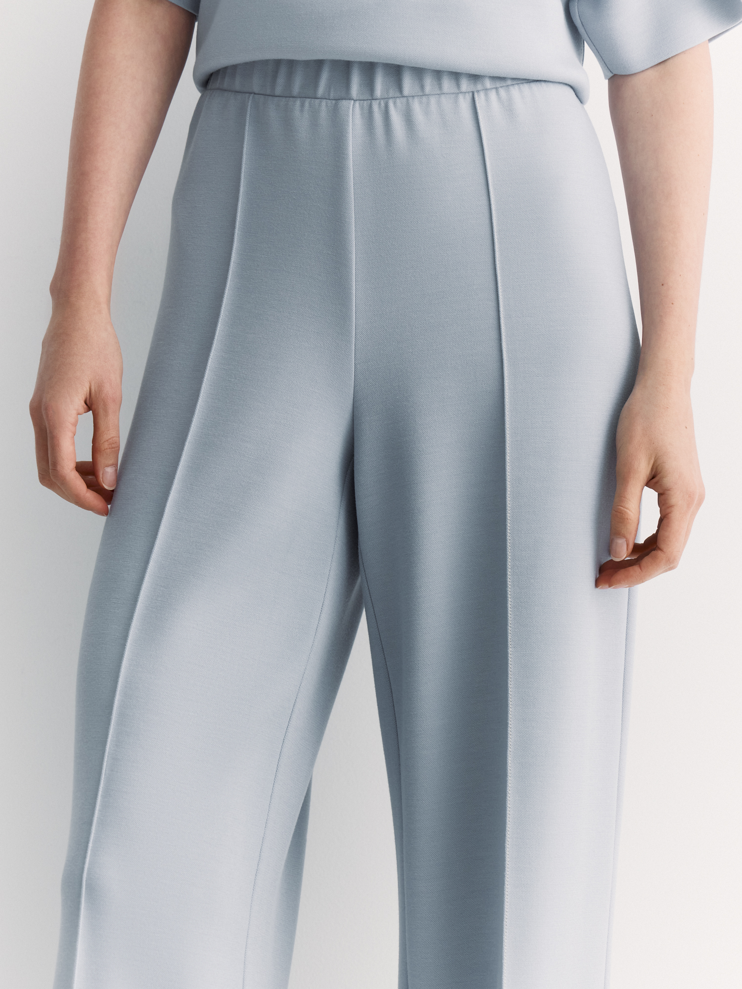 Брюки отличаются минималистичным дизайном, удобным кроем и акцентом на комфорте. Неопрен с ромбовидным переплетением «пике» прочный, гибкий и тактильно приятный. Вискоза обеспечивает мягкость и способность дышать, полиэстер добавляет износостойкость и легкость в уходе, а спандекс придает эластичность.