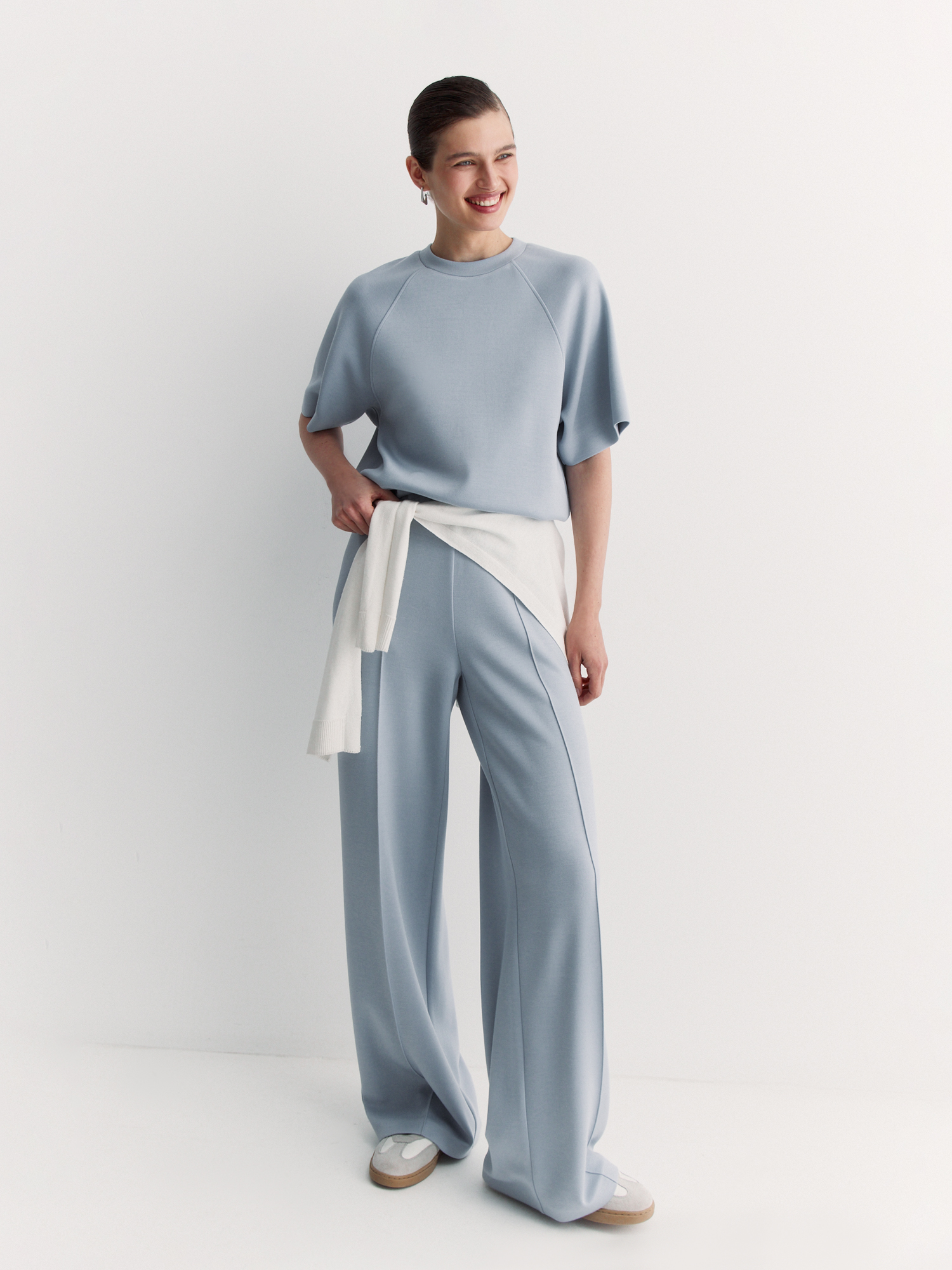 Такие брюки в нежном голубом цвете подходят для создания как расслабленных, так и стильных образов, идеально сочетаются со свитшотом BS0039K1.