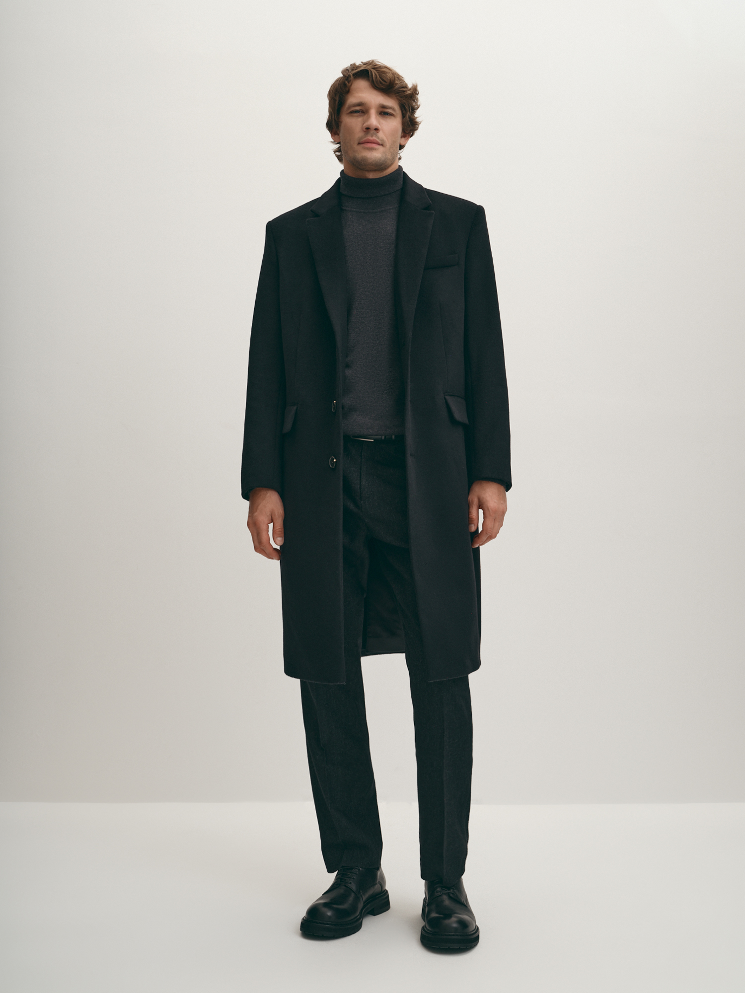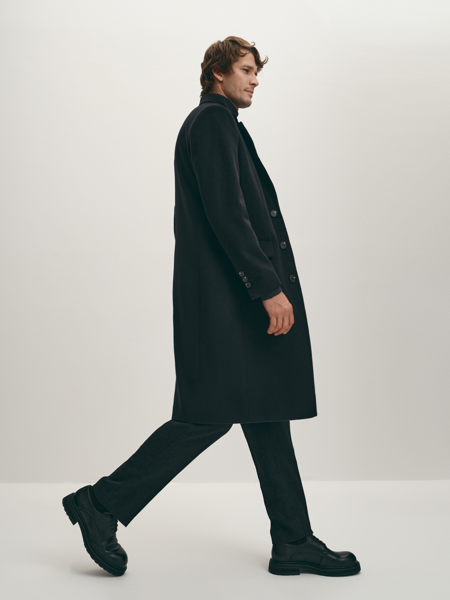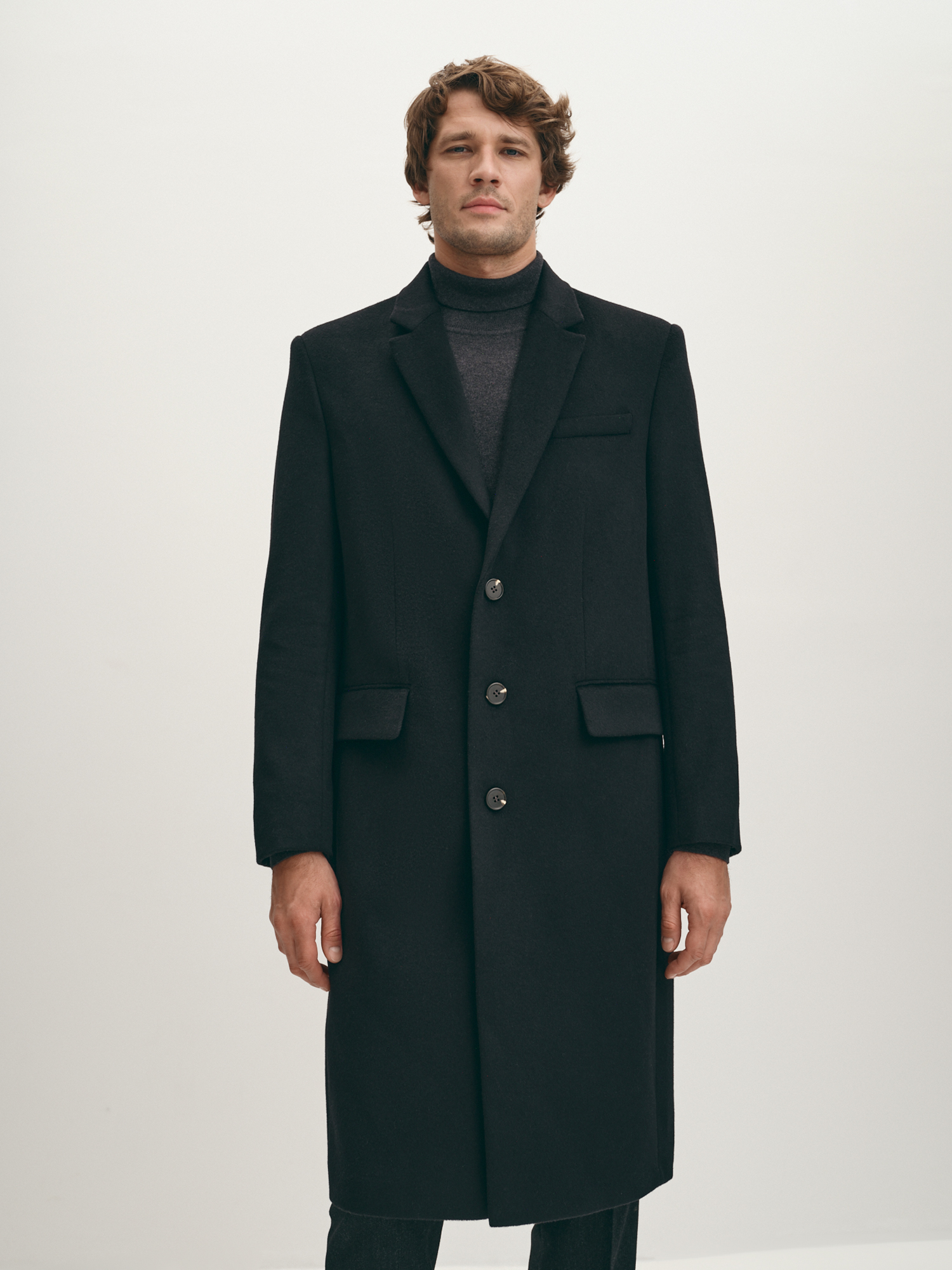 Стильное однобортное осеннее шерстяное пальто на поливискозной подкладке может также подойти для европейской зимы, евростиль. Черное комфортное базовое пальто с английским воротником, втачным рукавом, длиной до колен. Боковые карманы с клапанами и нагрудный с листочкой функциональны, а высокая шлица обеспечивает комфортный шаг. Если подобрать размер пальто на один-два больше, можно формировать актуальный силуэт оверсайз, он предполагает ношение вещей большого размера, это удобно и стильно.