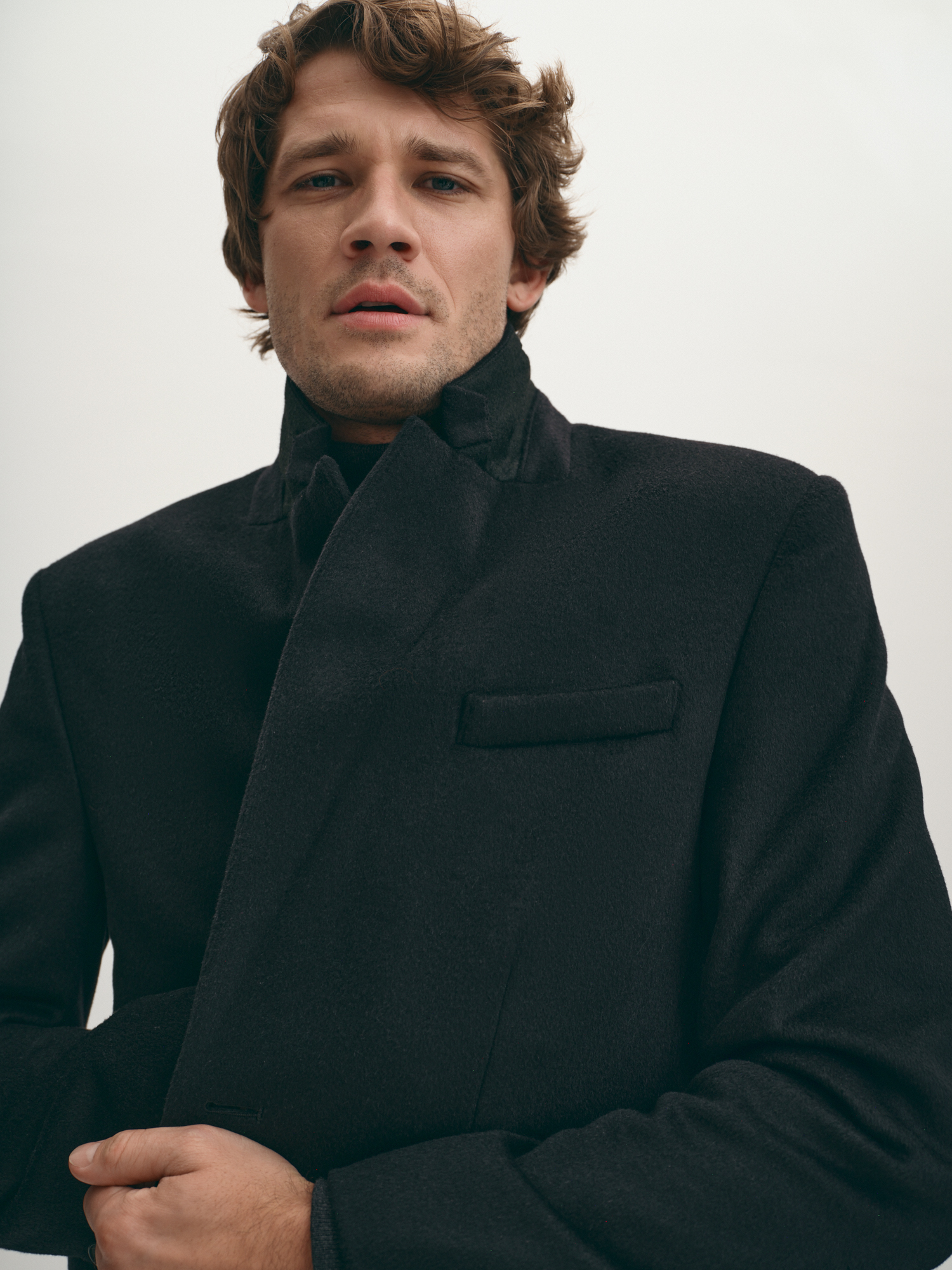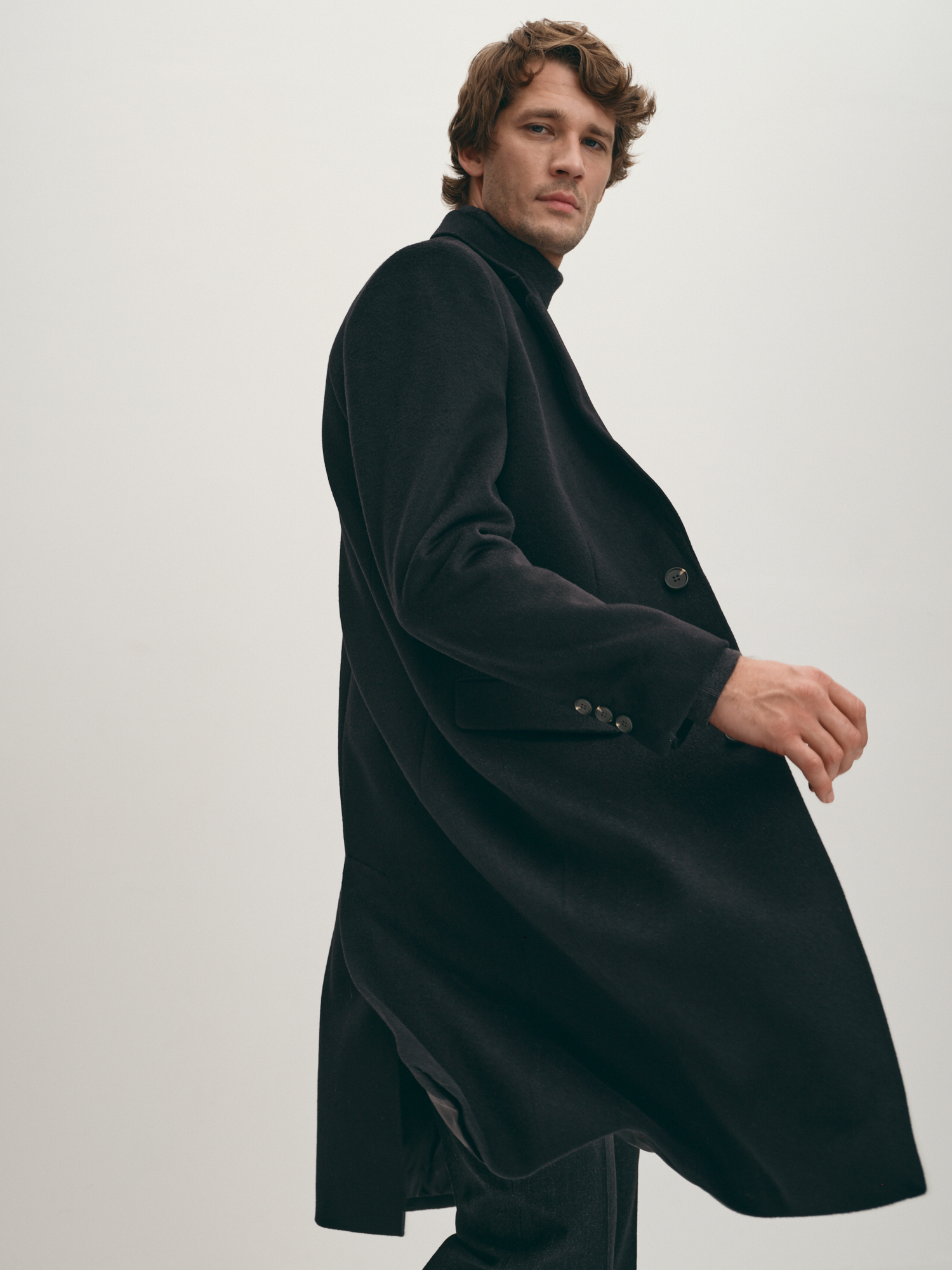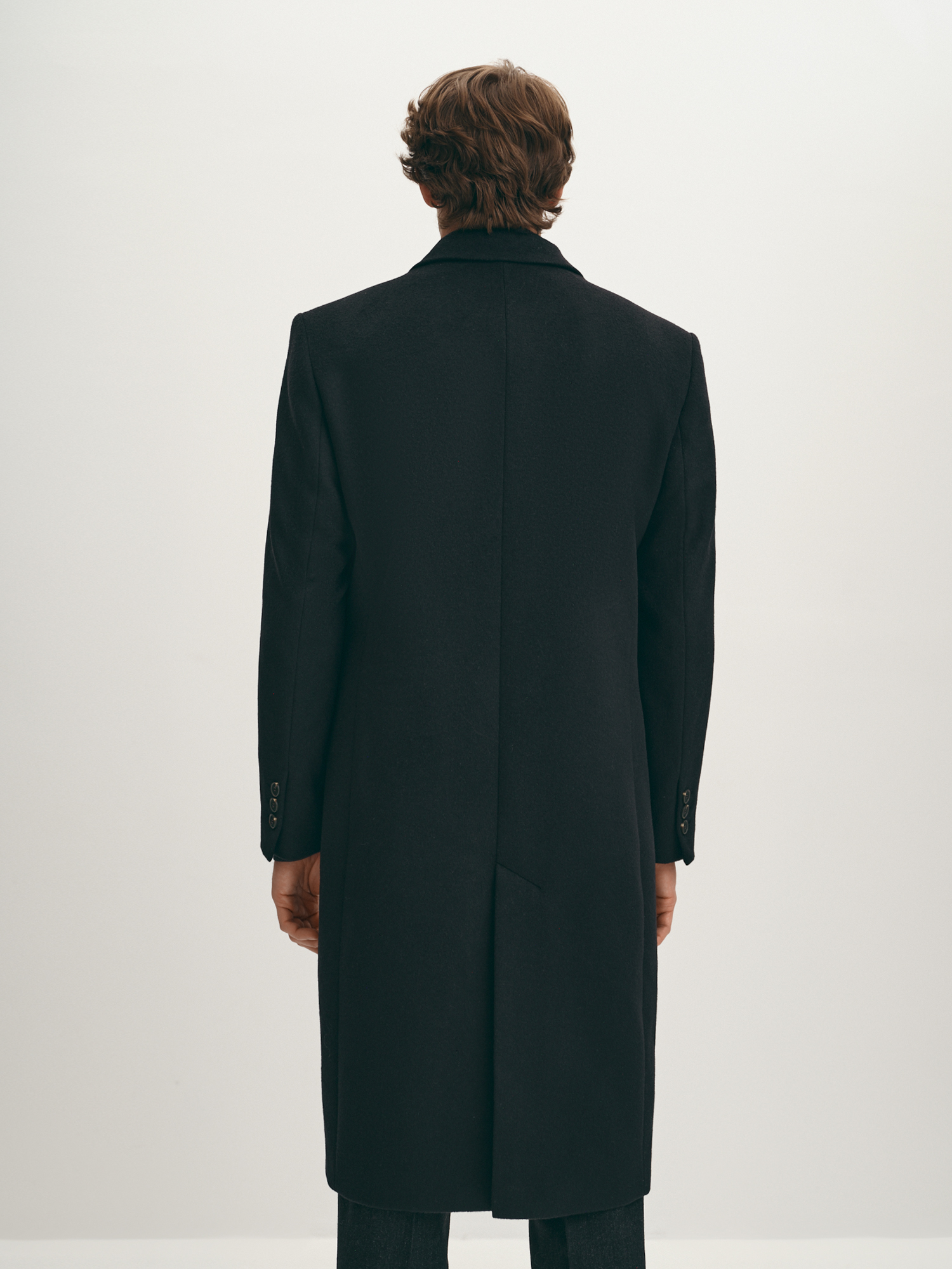 Стильное однобортное осеннее шерстяное пальто на поливискозной подкладке может также подойти для европейской зимы, евростиль. Черное комфортное базовое пальто с английским воротником, втачным рукавом, длиной до колен. Боковые карманы с клапанами и нагрудный с листочкой функциональны, а высокая шлица обеспечивает комфортный шаг. Если подобрать размер пальто на один-два больше, можно формировать актуальный силуэт оверсайз, он предполагает ношение вещей большого размера, это удобно и стильно.