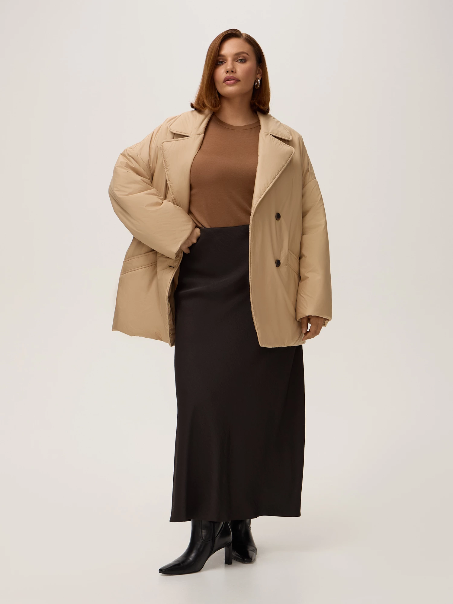 Прямой силуэт, пиджачный воротник с закруглёнными углами и двубортная застёжка дисциплинируют образ, а спущенное плечо смягчает его. Практичные карманы с листочками и съёмный пояс позволяют менять образ — от делового до повседневного.