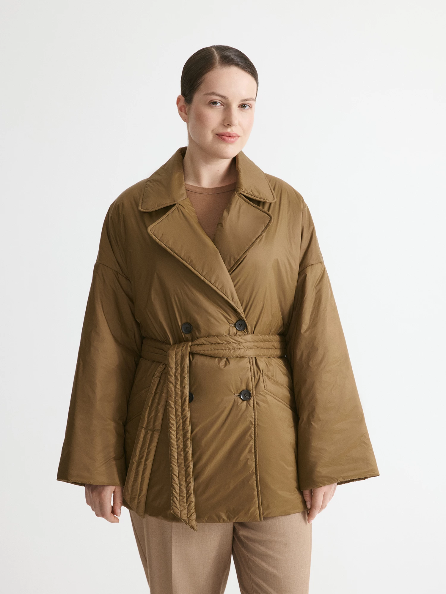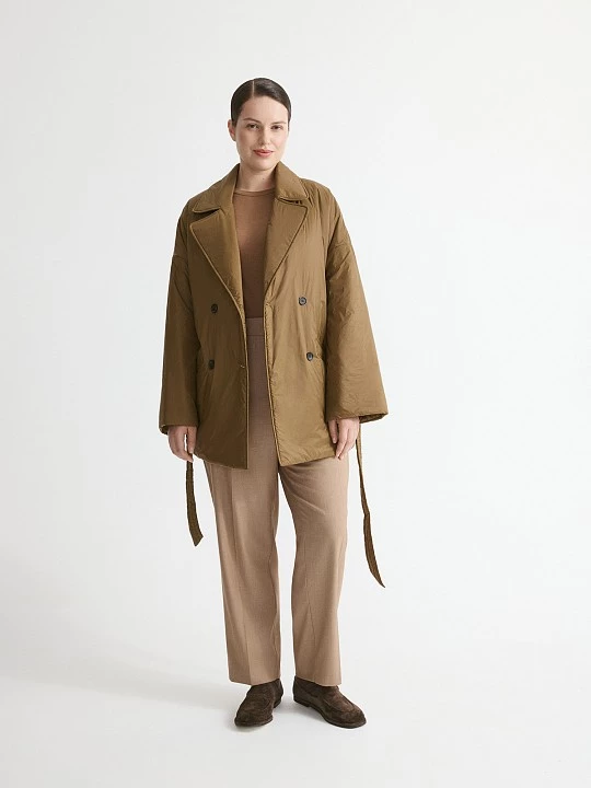 Двубортная куртка в табачном цвете - отличный спутник в прохладную погоду. Модель из прочного нейлона с синтепоновым утеплителем по-классически элегантна и по-современному комфортна.