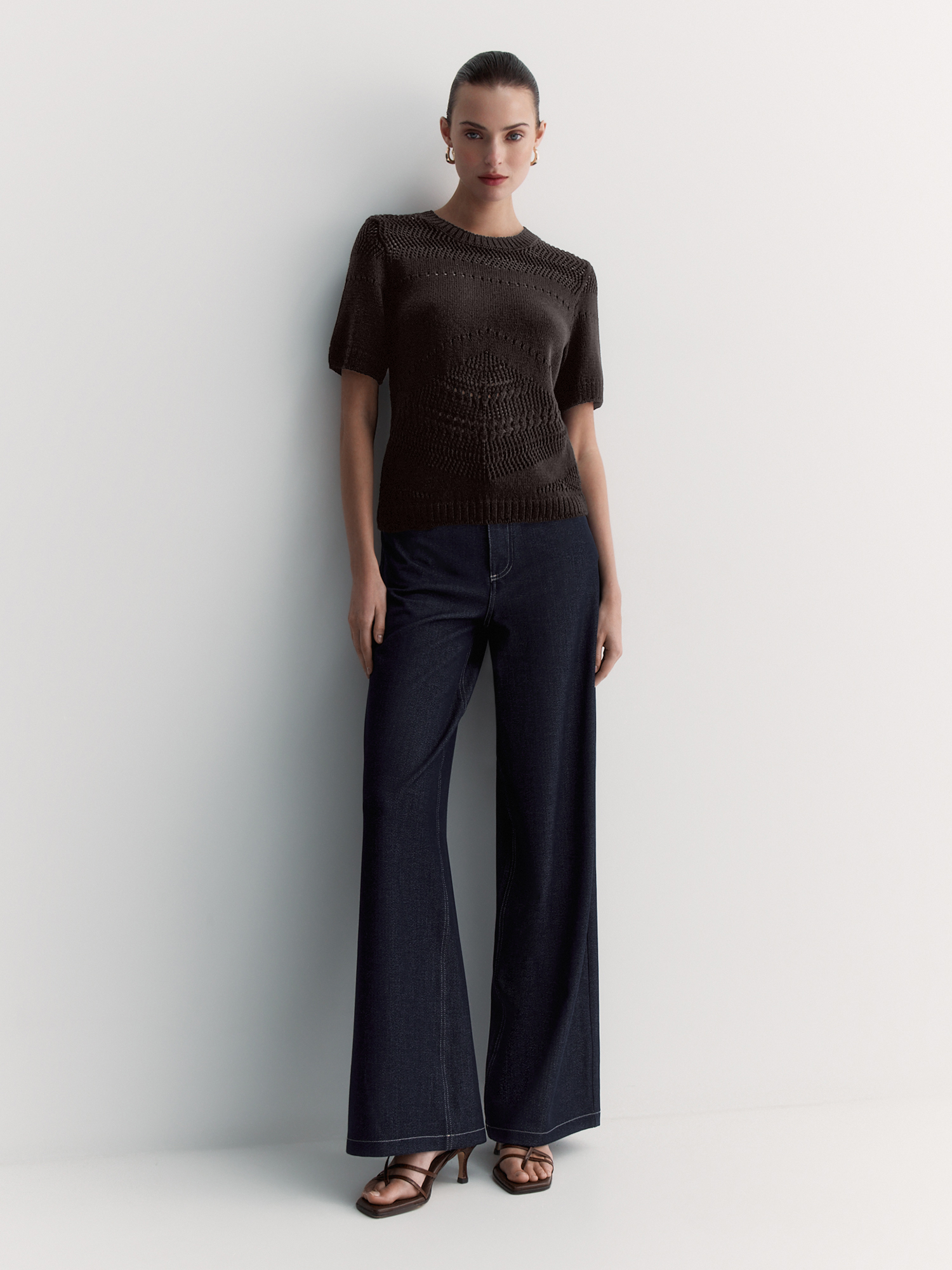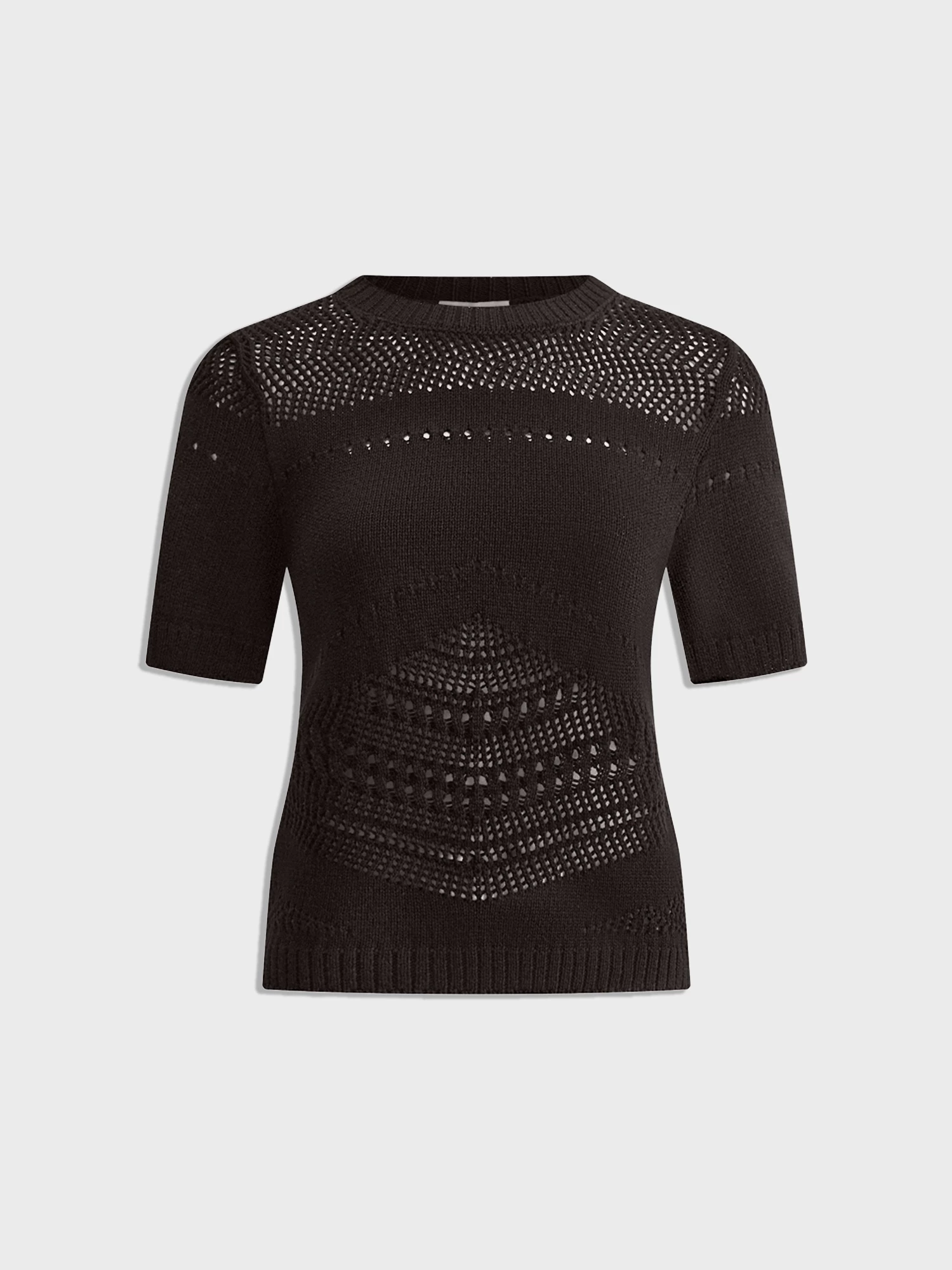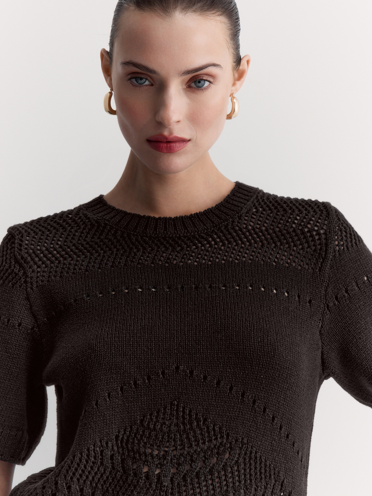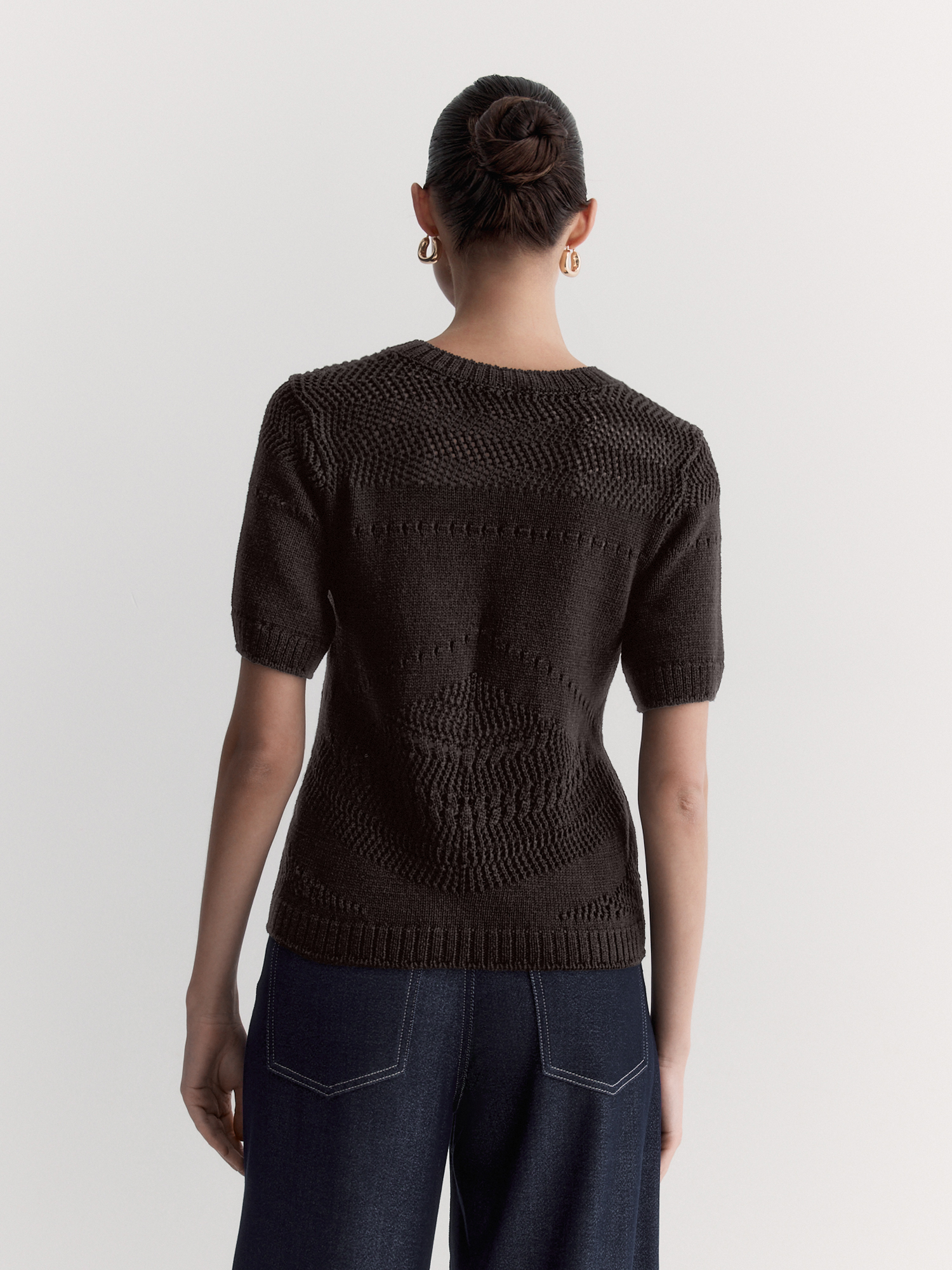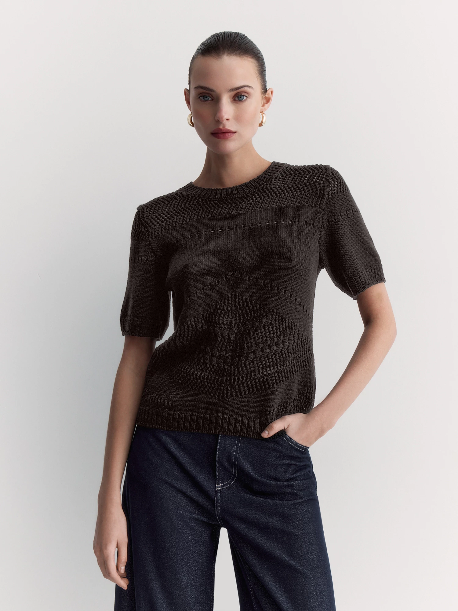 Ажурный джемпер с коротким рукавом – идеальный вариант для создания женственных образов. Связан из мягкой хлопковой пряжи насыщенного оттенка горького шоколада, которая приятна к телу и обеспечивает комфорт.