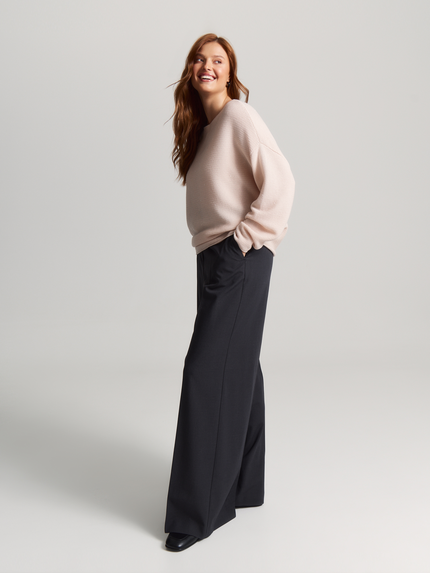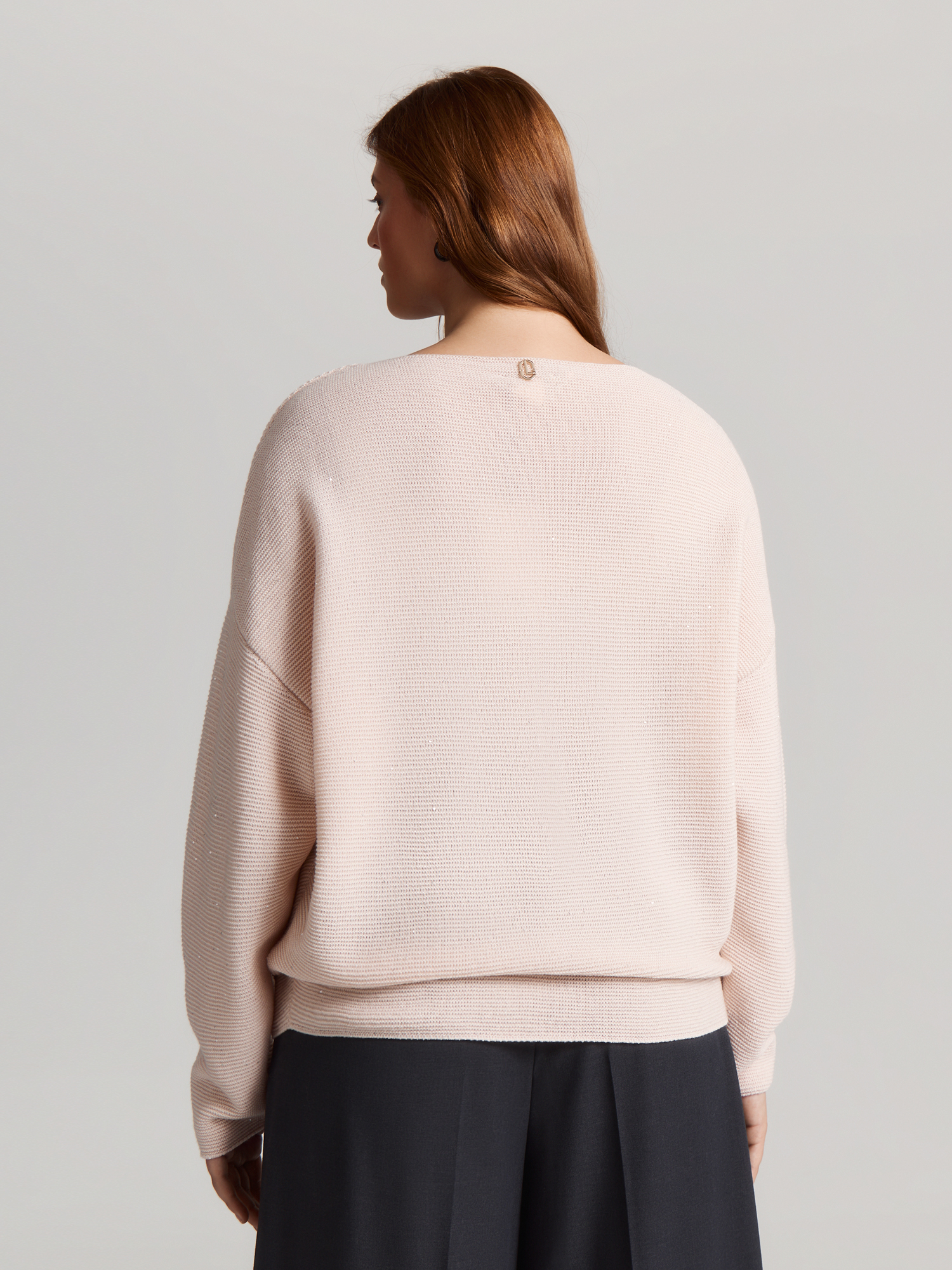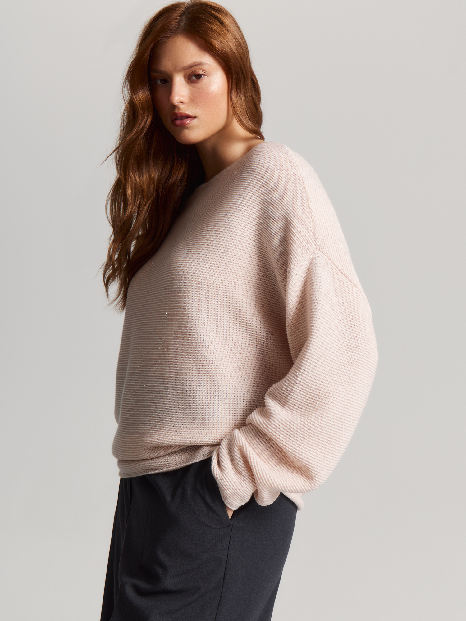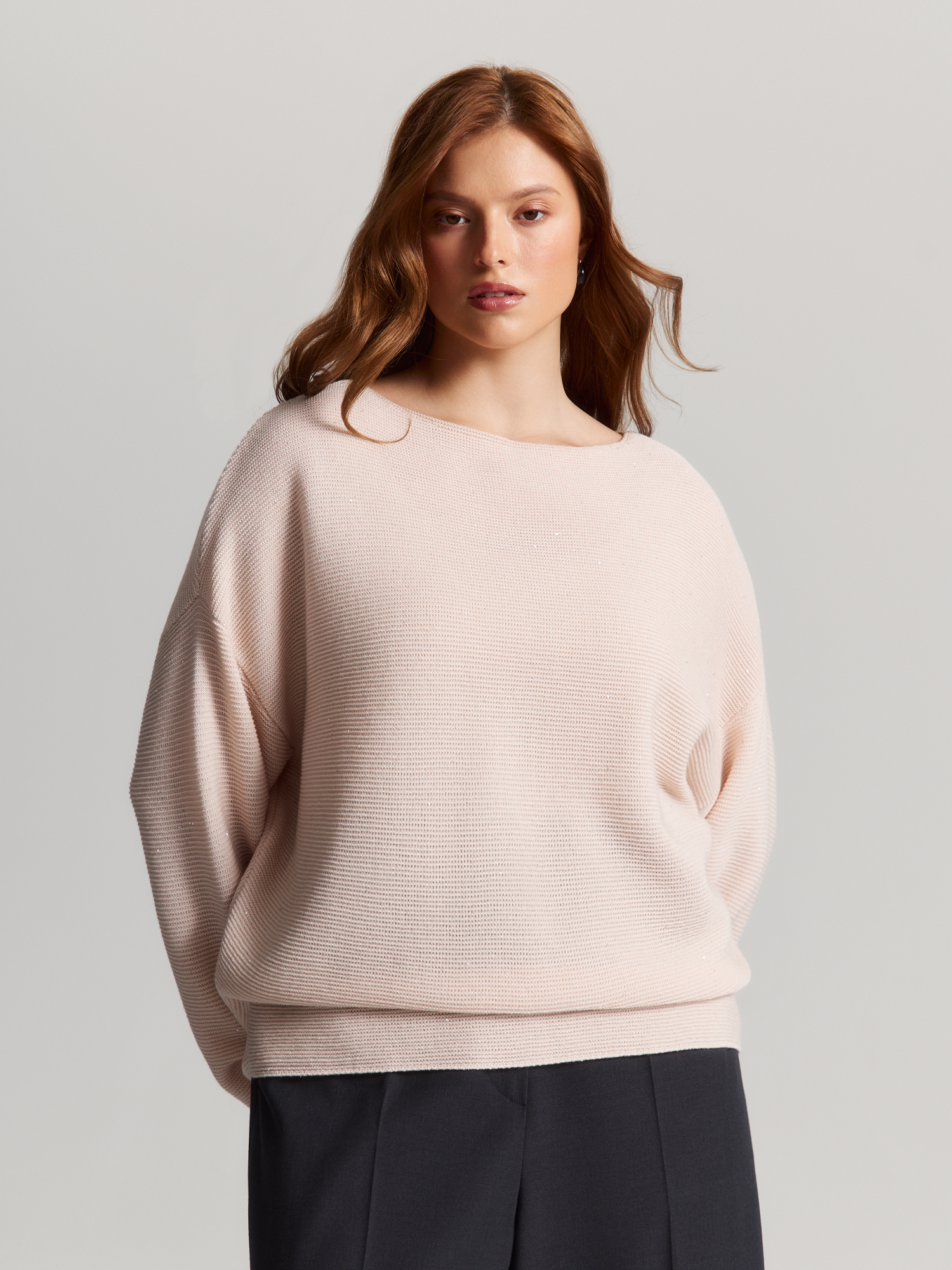 Джемпер среднего объема из мягкой пряжи подарит уют в холодный сезон. Он создан с заботой о природе, ведь в составе переработанные волокна. Шерсть мериноса способствует хорошей терморегуляции и приятна к телу. Микро-пайетки добавляют деликатный блеск и совсем не колются.