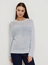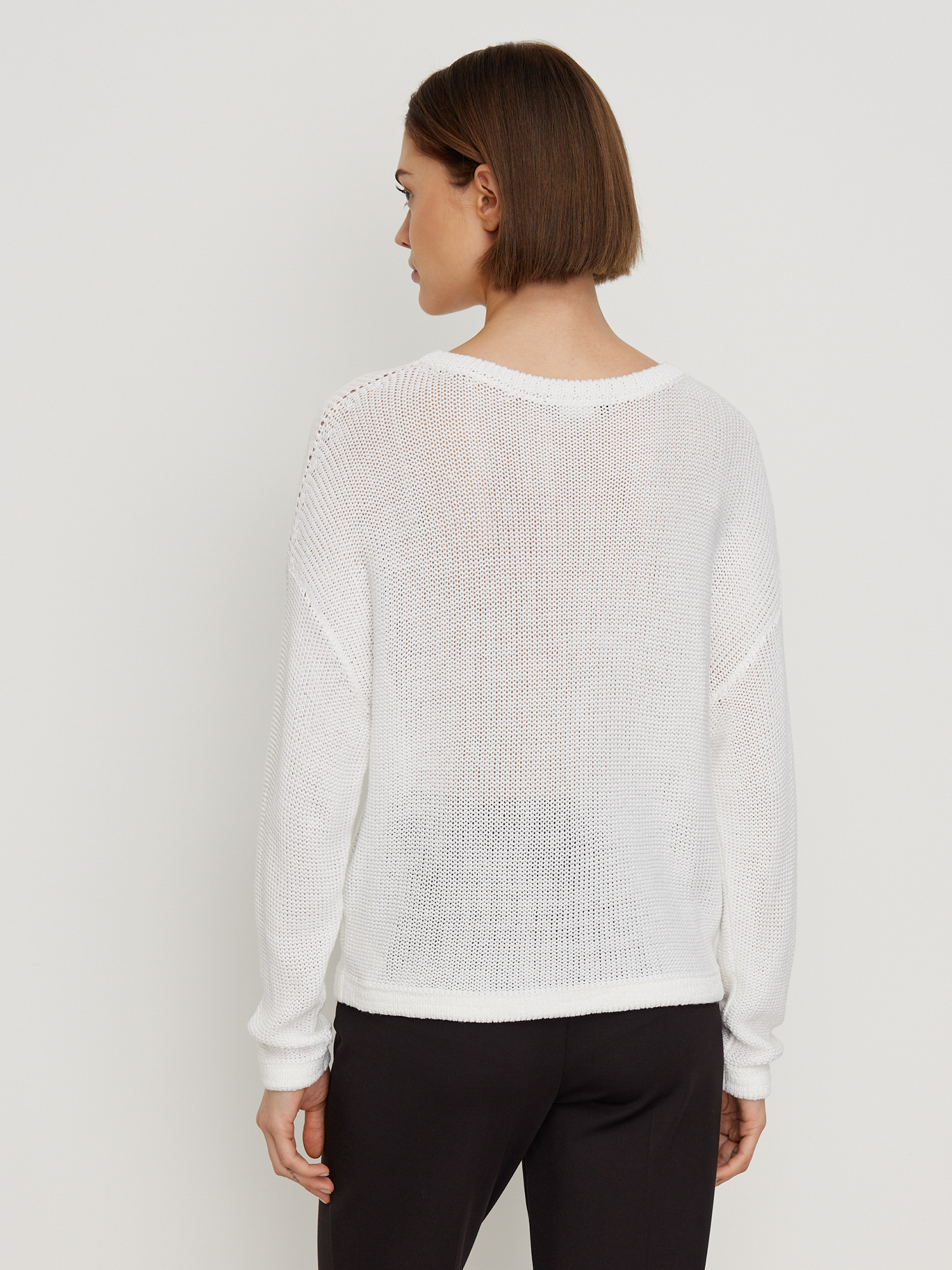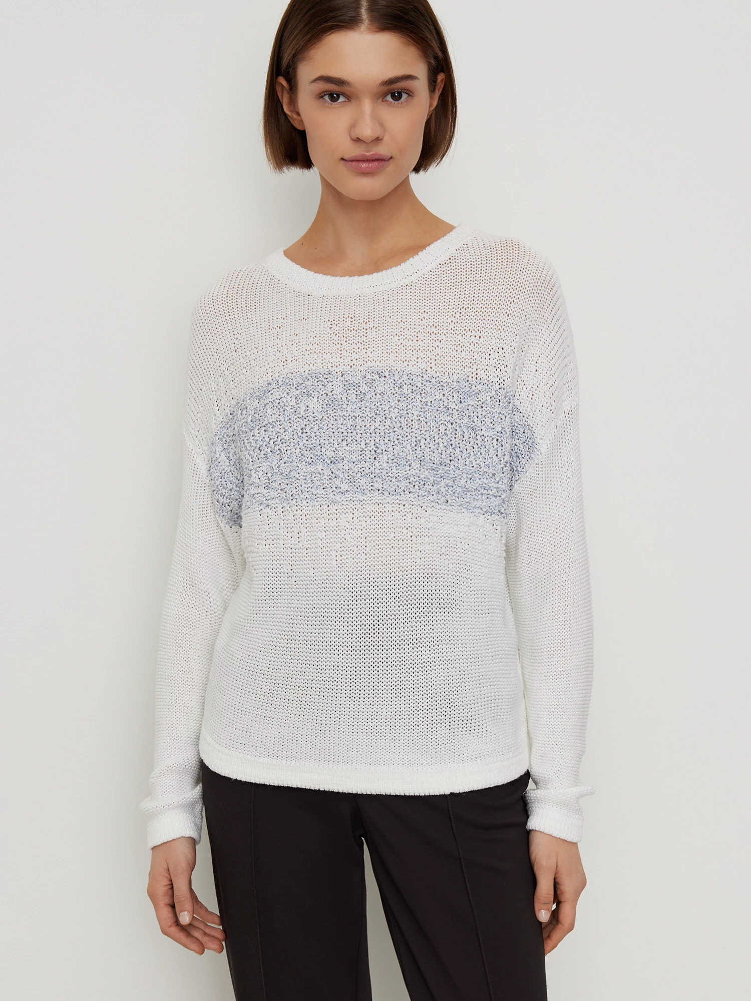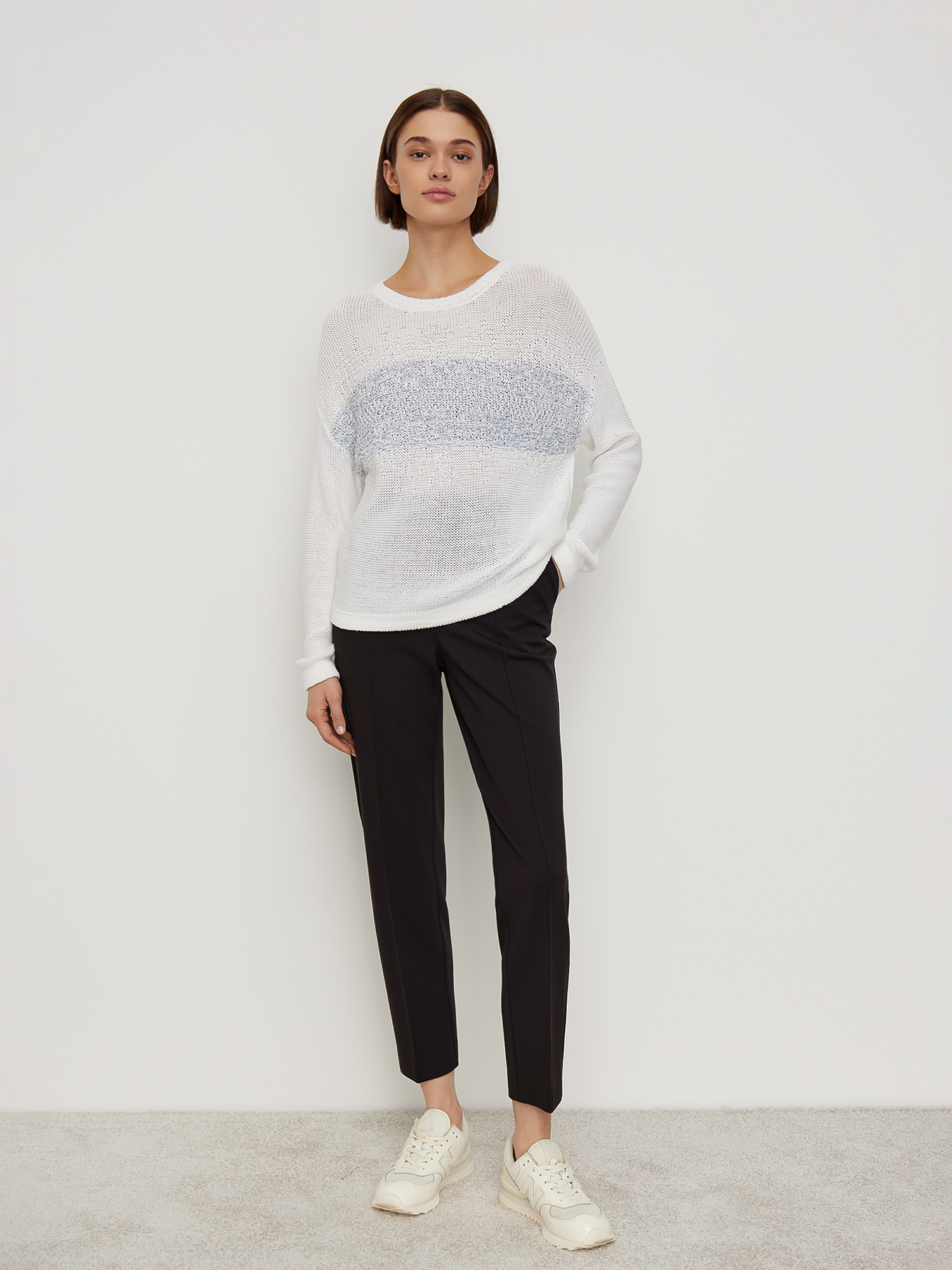 Джемпер из мягкого вязаного трикотажа белого цвета. Модель с круглой горловиной, спущенной линией плеча и длинными рукавами. Вязаное полотно струящееся, приятное к телу, силуэт прямой. Контрастная полоска на груди имитирует вставку из твидовой ткани. Оригинальный женственный джемпер, дополненный джинсами - идеальный лук в стиле кэжуал.