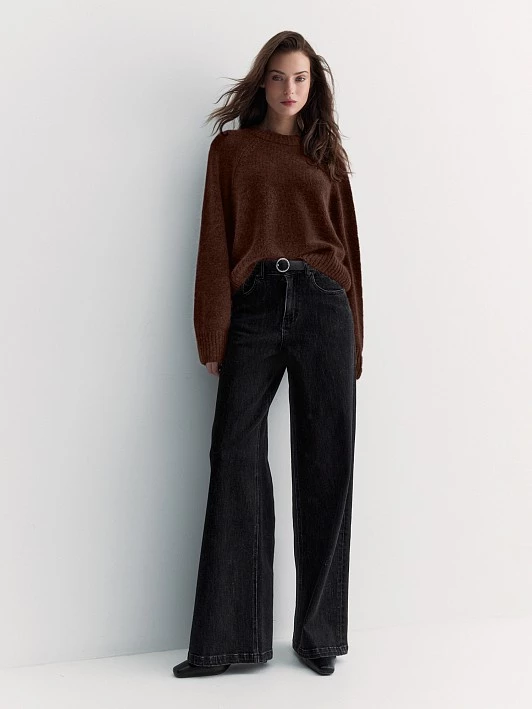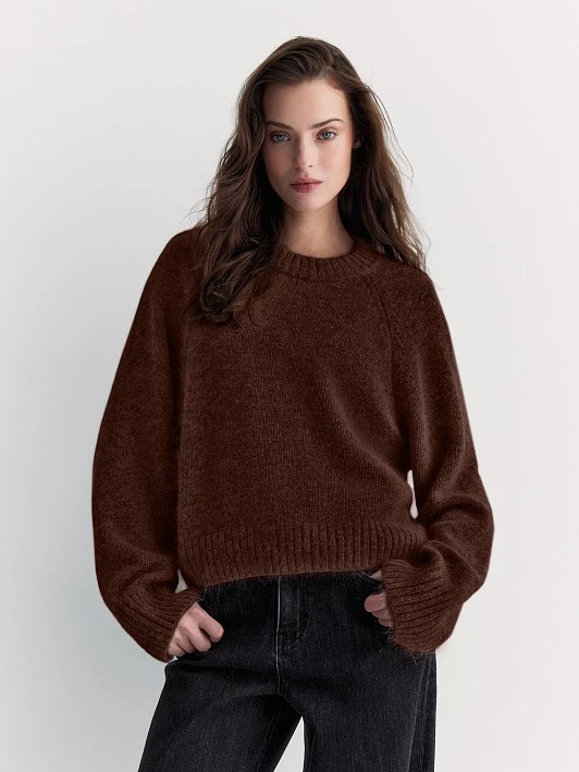 Укороченный джемпер аккуратного силуэта связан из нежной пряжи с ангорой и овечьей шерстью. Он очень мягкий, тёплый, с хорошей терморегуляцией. Выполнили модель с круглой горловиной и рукавом-реглан - удобно сидит и не сковывает движения.