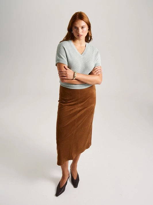 Минималистичный джемпер с коротким рукавом гармоничен в своей лаконичности, где уникальное фактурное переплетение и акцент на текстуре вязаного полотна играют ключевую роль. Итальянская меланжевая пряжа из тактильно приятной вискозы и прочных поливолокон обеспечивает легкость, мягкость и комфорт при носке. Вискоза дарит приятные тактильные ощущения, а полиэстер добавляет износостойкость и прочность. Приятный серо-зеленый цвет — оттенок-хамелеон, который в зависимости от сочетаний может становиться более серым или зеленым. Это расширяет вариативность использования джемпера, делая его универсальным для различных цветовых сочетаний. Короткий рукав обеспечивает комфорт и свободу движений, а вязаная резинка по низу создает аккуратную посадку с напуском, подчеркивая силуэт. Фактурное переплетение добавляет текстуру, делая джемпер визуально и тактильно привлекательным. Этот прием подчеркивает высокое качество исполнения и дизайнерский подход, добавляя изделию уникальности. Изготовление деталей джемпера на японской плосковязальной машине Shima Seiki и соединение на кеттельном оборудовании с использованием ручного труда обеспечивают высокую точность и премиальное качество. Внимание к каждому процессу делает джемпер долговечным и уникальным, подчеркивая его исключительность и плюсы полного цикла собственного производства. Джемпер из вискозной итальянской пряжи — сочетание стиля, комфорта и качества, он станет одним из акцентов гардероба.