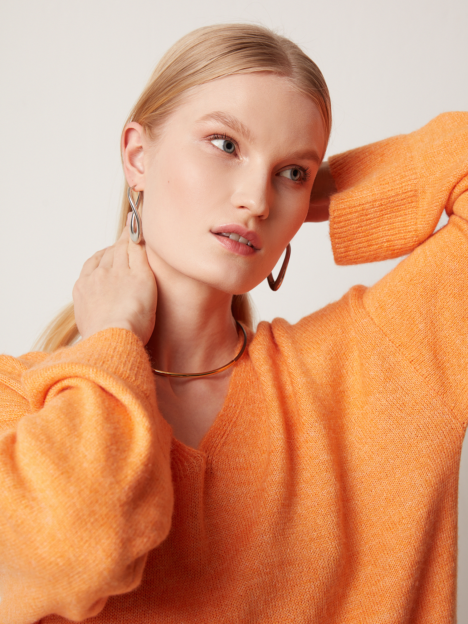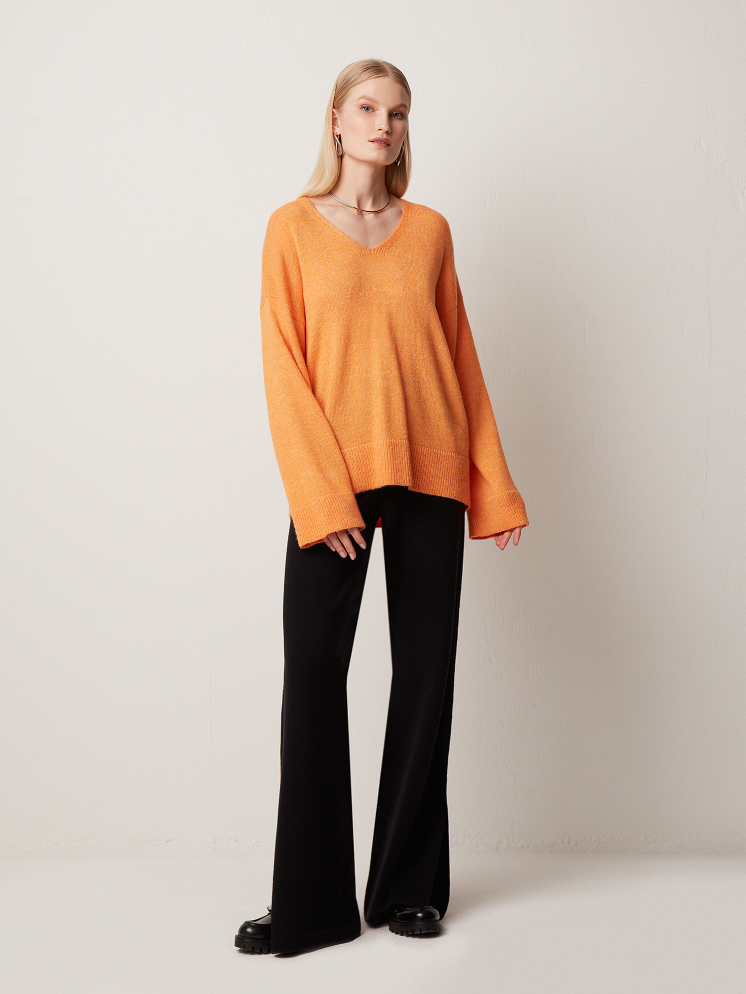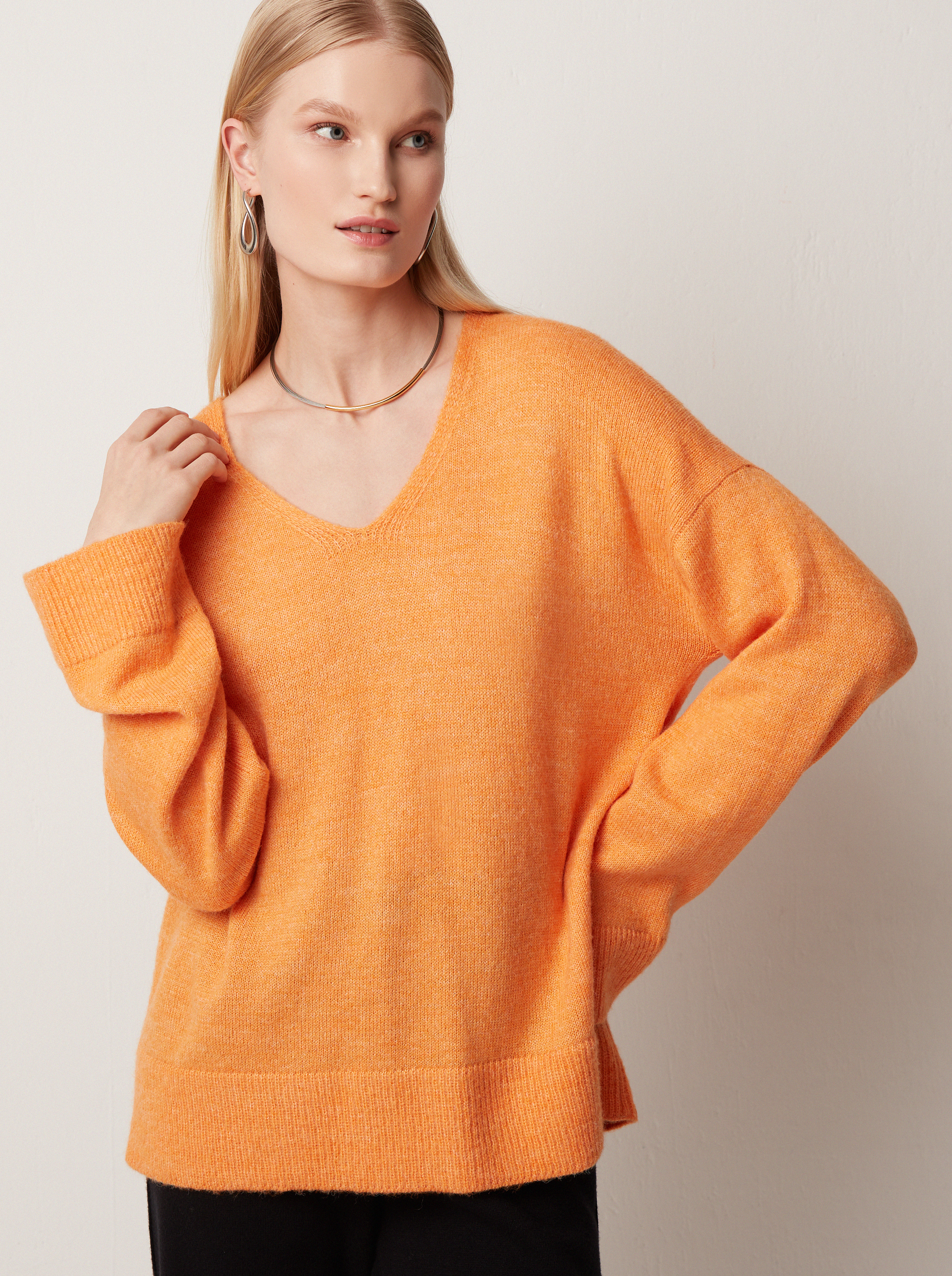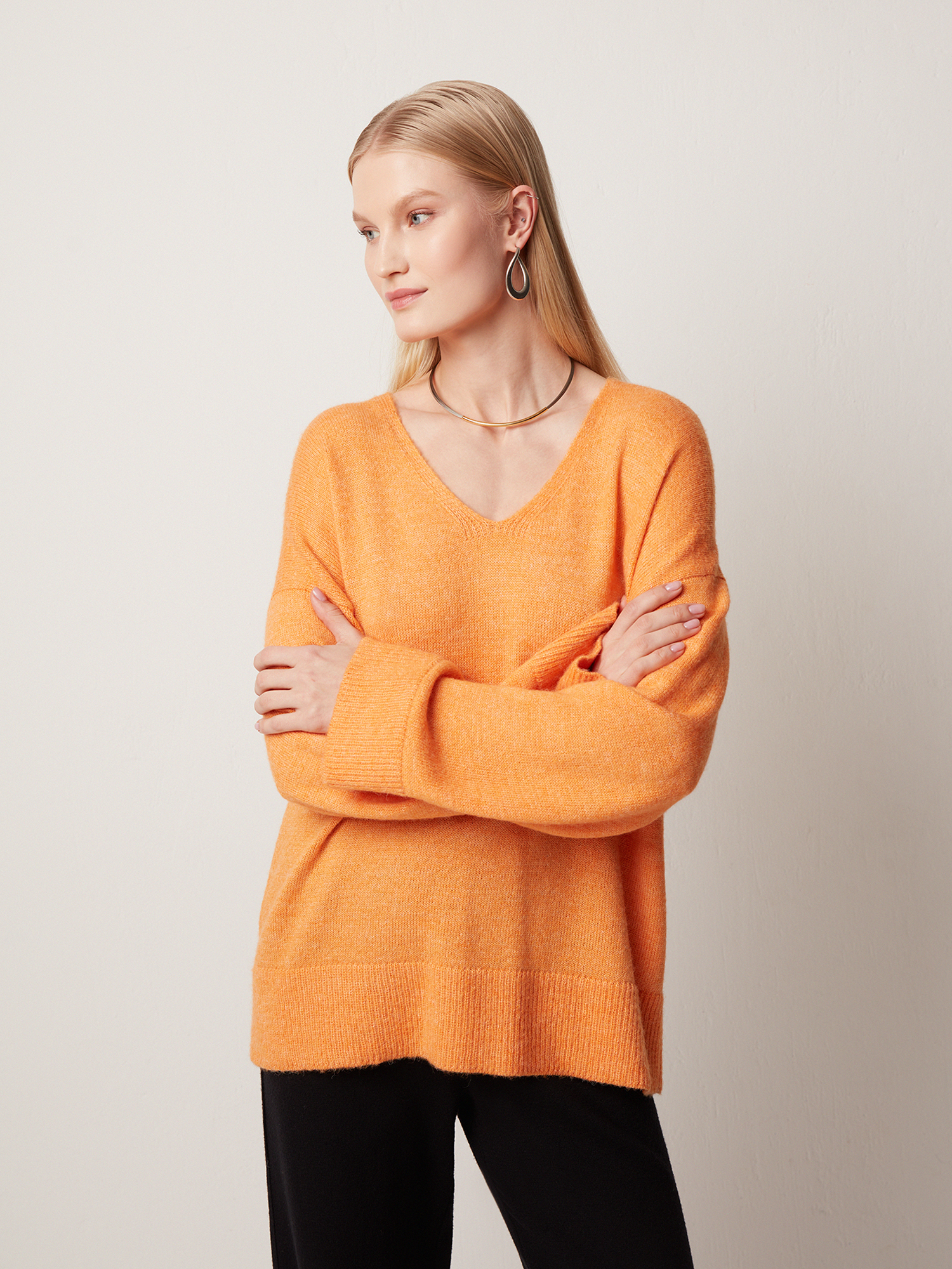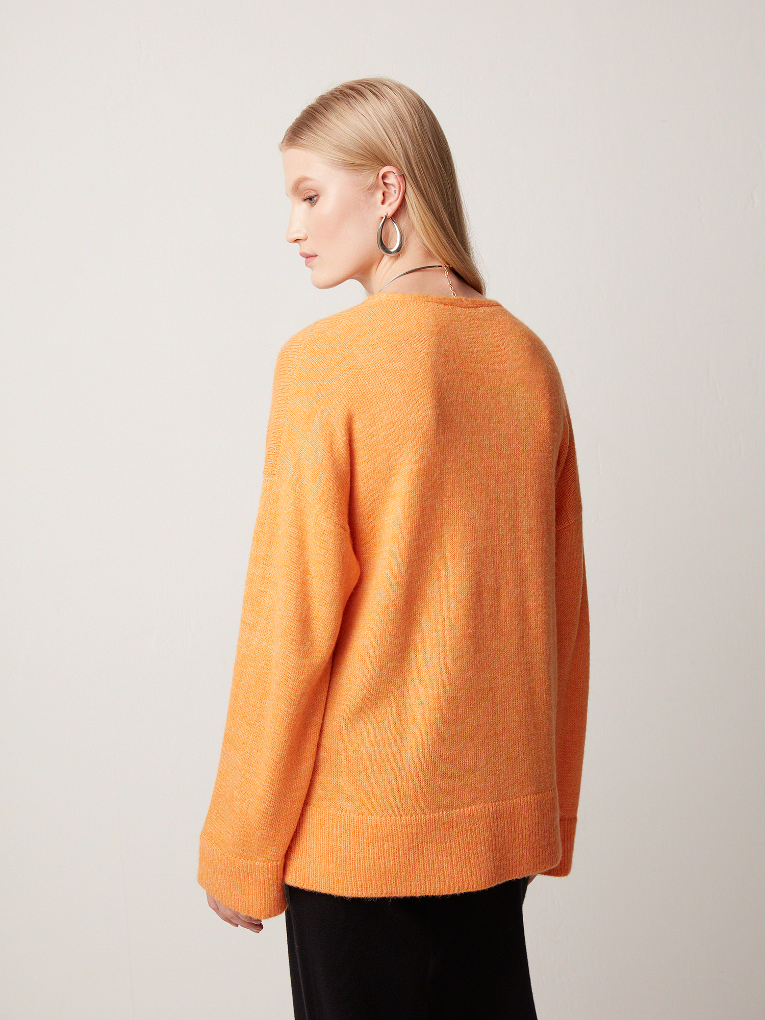 Уютный вязаный джемпер отранжевого оттенка. Выполнен из фирменной пряжи с добавлением натуральной овечьей шерсти. Модель прямого силуэта, увеличенного объёма, с V-образной горловиной, спущенной линий плеча. Образ можно дополнить джинсами, брюками или юбкой.