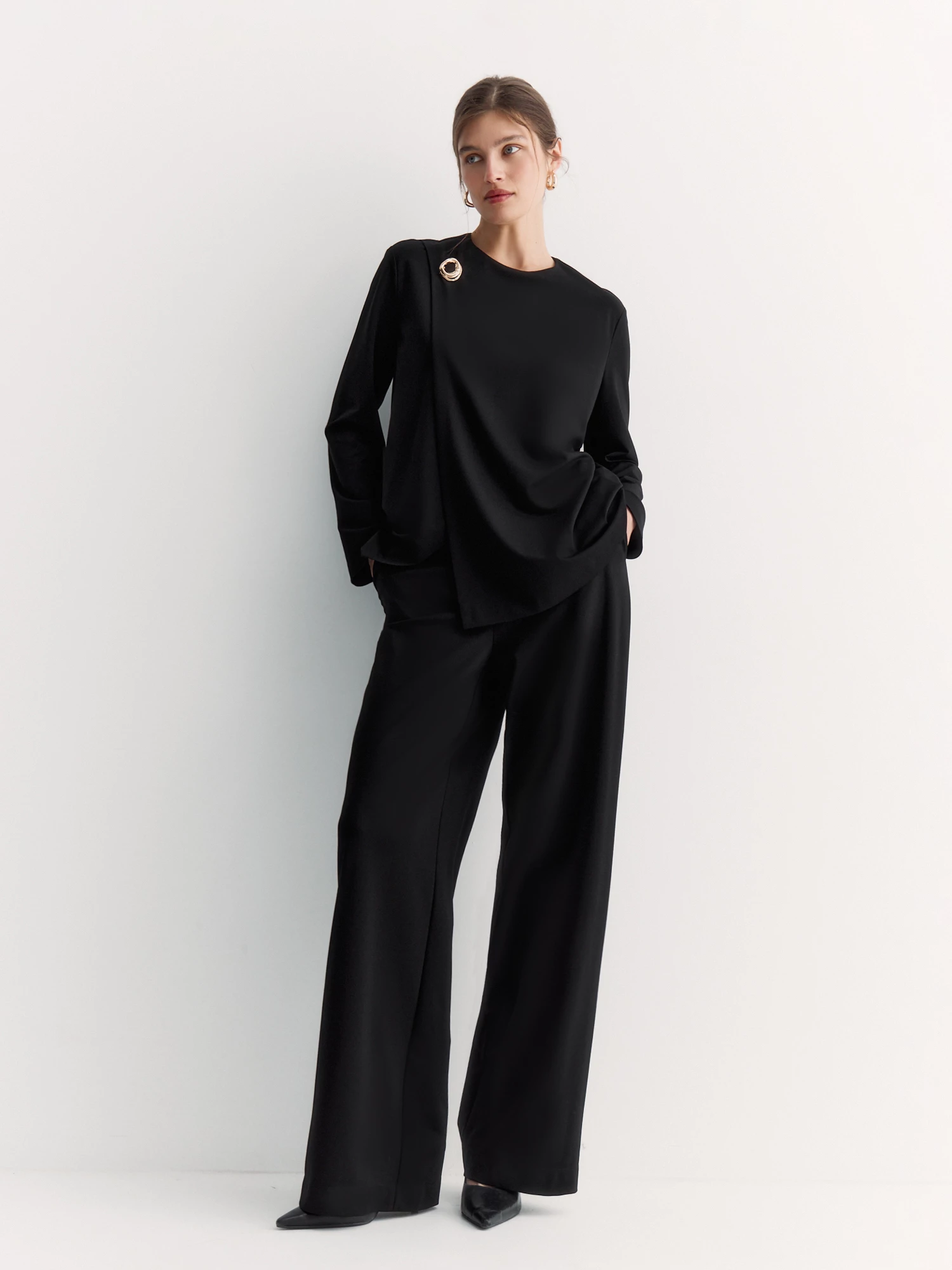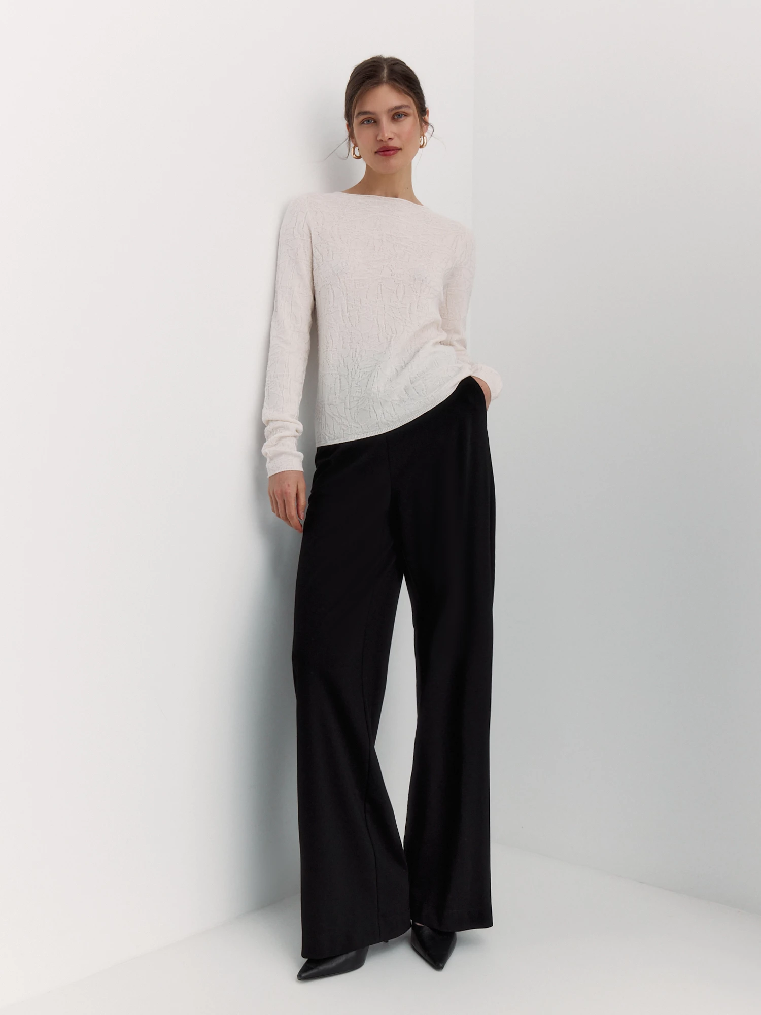 Прямой силуэт и длинные рукава делают джемпер универсальным: его можно носить с юбками, брюками или джинсами. Удобный крой не сковывает движения, а благородный узор добавляет образу ненавязчивую элегантность.