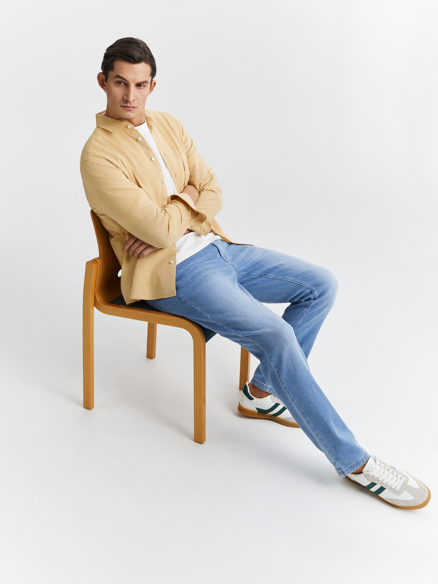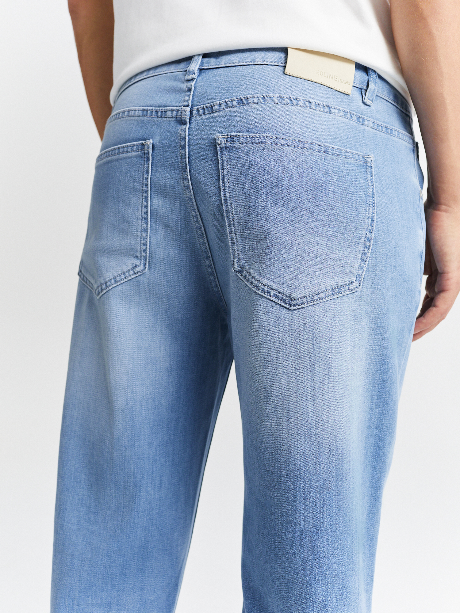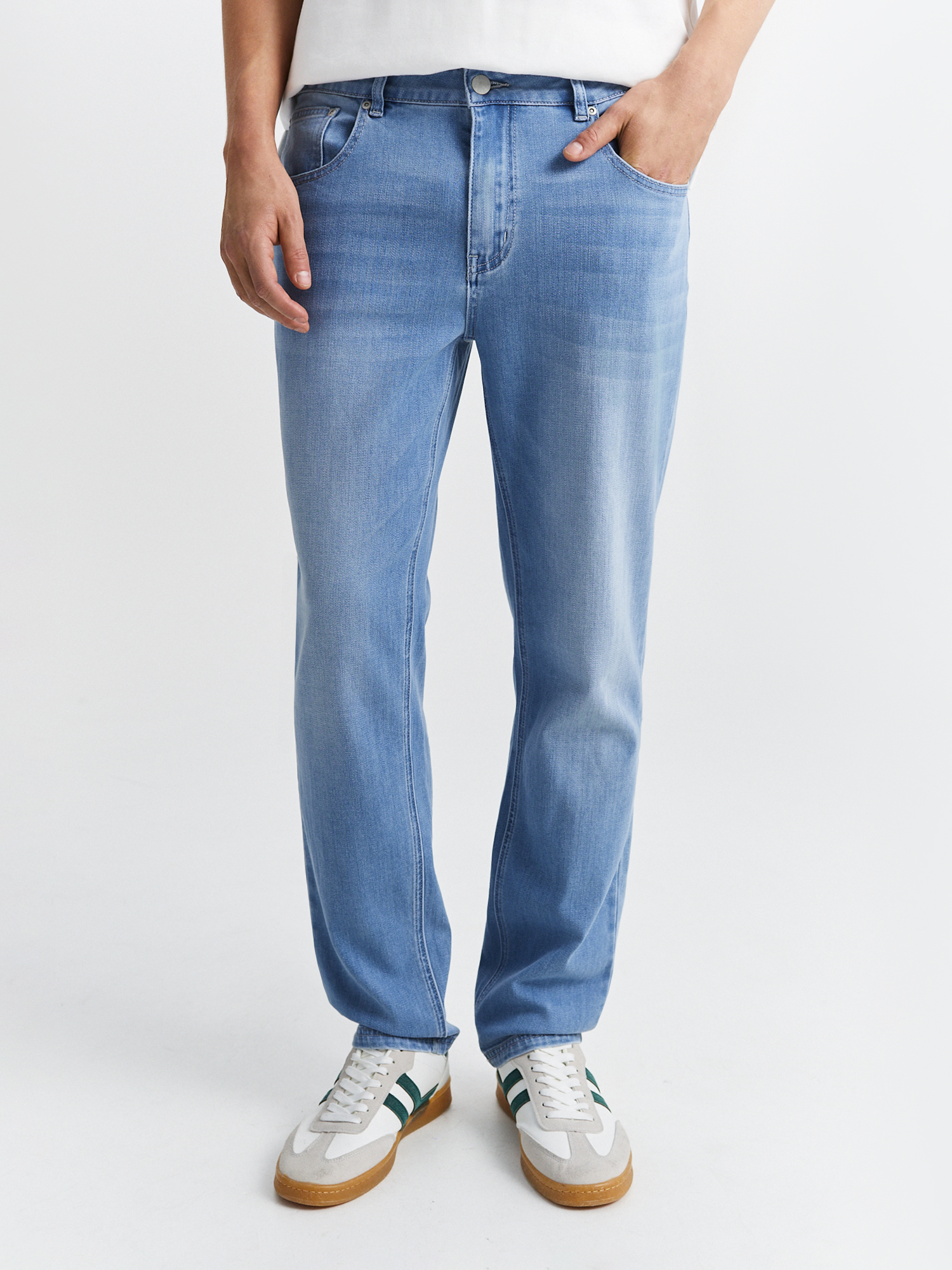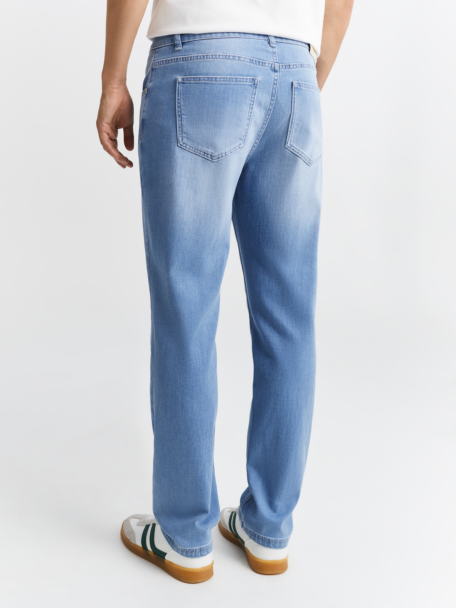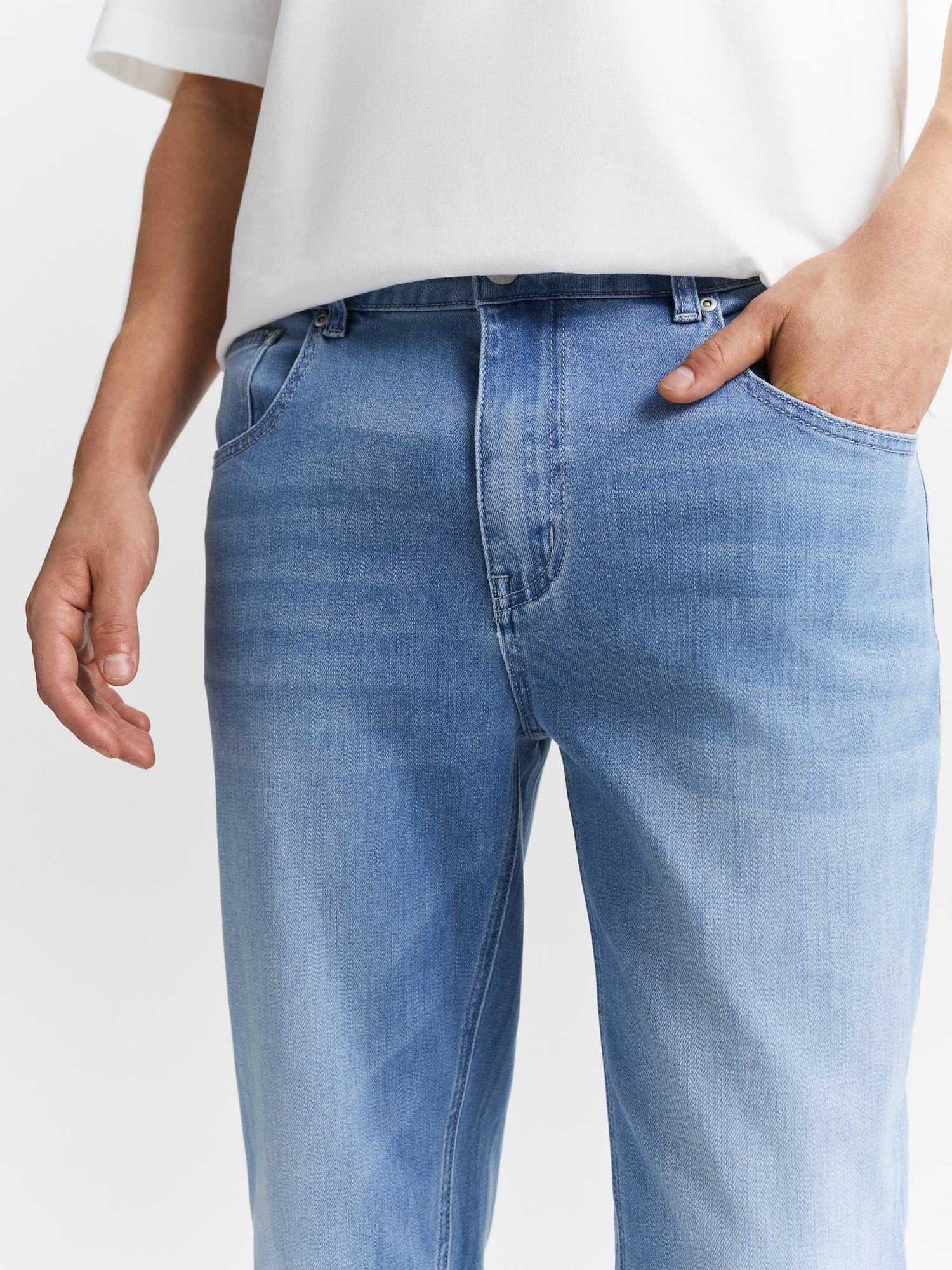 Голубые джинсы полуприлегающего силуэта с деликатными потёртостями выполнены из мягкого смесового материала на основе хлопка с добавлением тенселя. Джинсы с пятью карманами отлично садятся по фигуре и не стесняют движений. Органично впишутся в базовый гардероб и станут универсальным решением для повседневного образа. Идеально сочетаются с футболками, рубашками и пиджаками.
