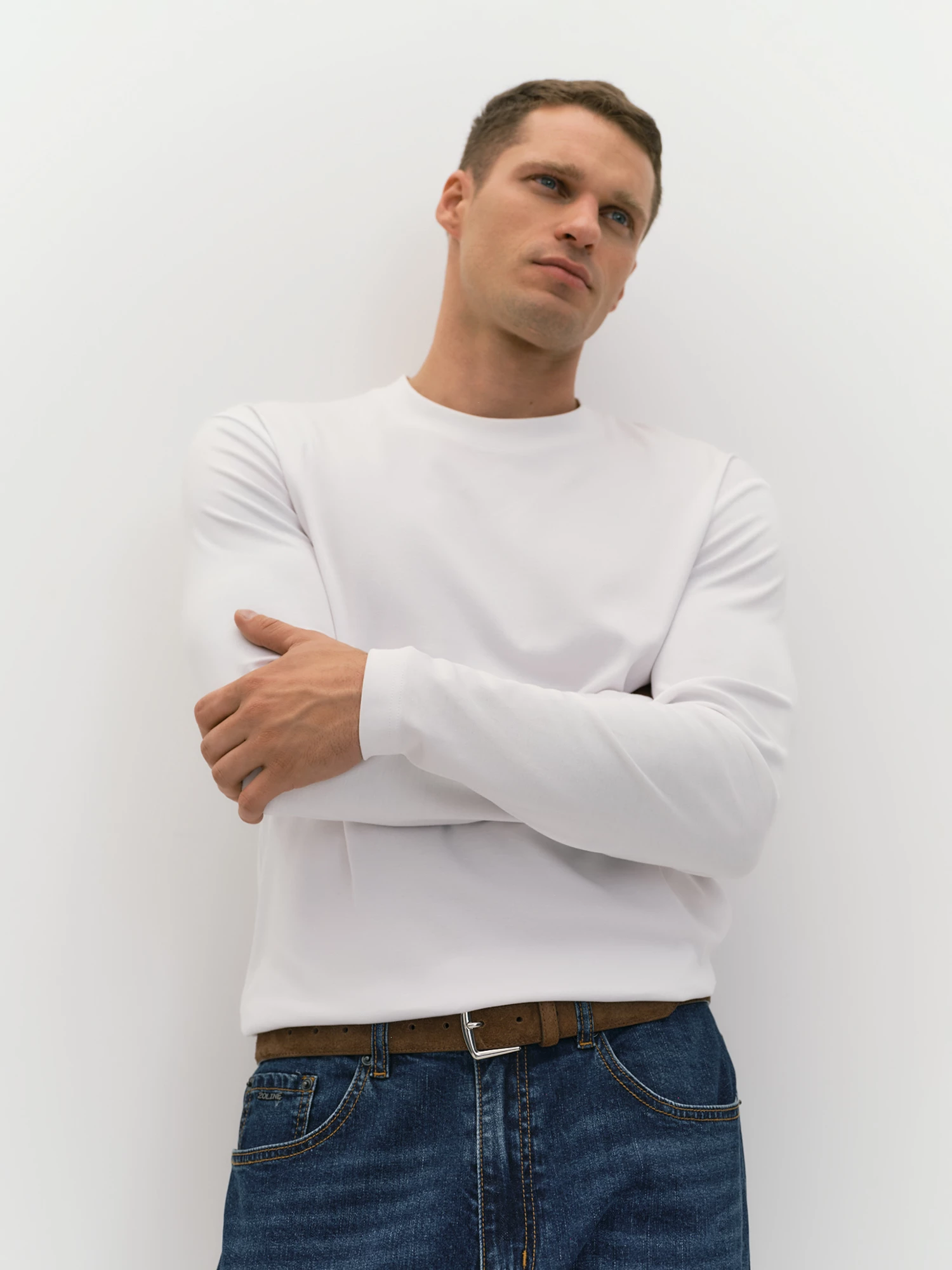 Джинсы-пятикарманники силуэта regular — это классическая модель стандартной средней ширины, идеальный выбор для повседневной носки и неформальных мероприятий. Джинсы выполнены из хлопкового денима с добавлением эластана. Хлопок обеспечивает натуральность, воздухопроницаемость и комфорт, а эластан придает ткани пластичность и формоустойчивость, улучшая посадку и обеспечивая свободу движений. Это делает джинсы удобными для повседневной носки и активного образа жизни. Светло-синий цвет джинсов универсален и освежает образ. Пять карманов добавляют функциональности, позволяя удобно хранить мелкие предметы. Брендированный патч на поясе и фирменная нашивка на маленьком кармане подчеркивают принадлежность к бренду и добавляют стильный акцент. Легкие потертости создают эффект винтажности, добавляют джинсам стиль и уникальность, создавая впечатление, что они имеют свою историю. Это придает образу легкость и неформальность, делая джинсы идеальными для создания расслабленных и модных луков. Такой деним — идеальное сочетание стиля, функциональности и комфорта.