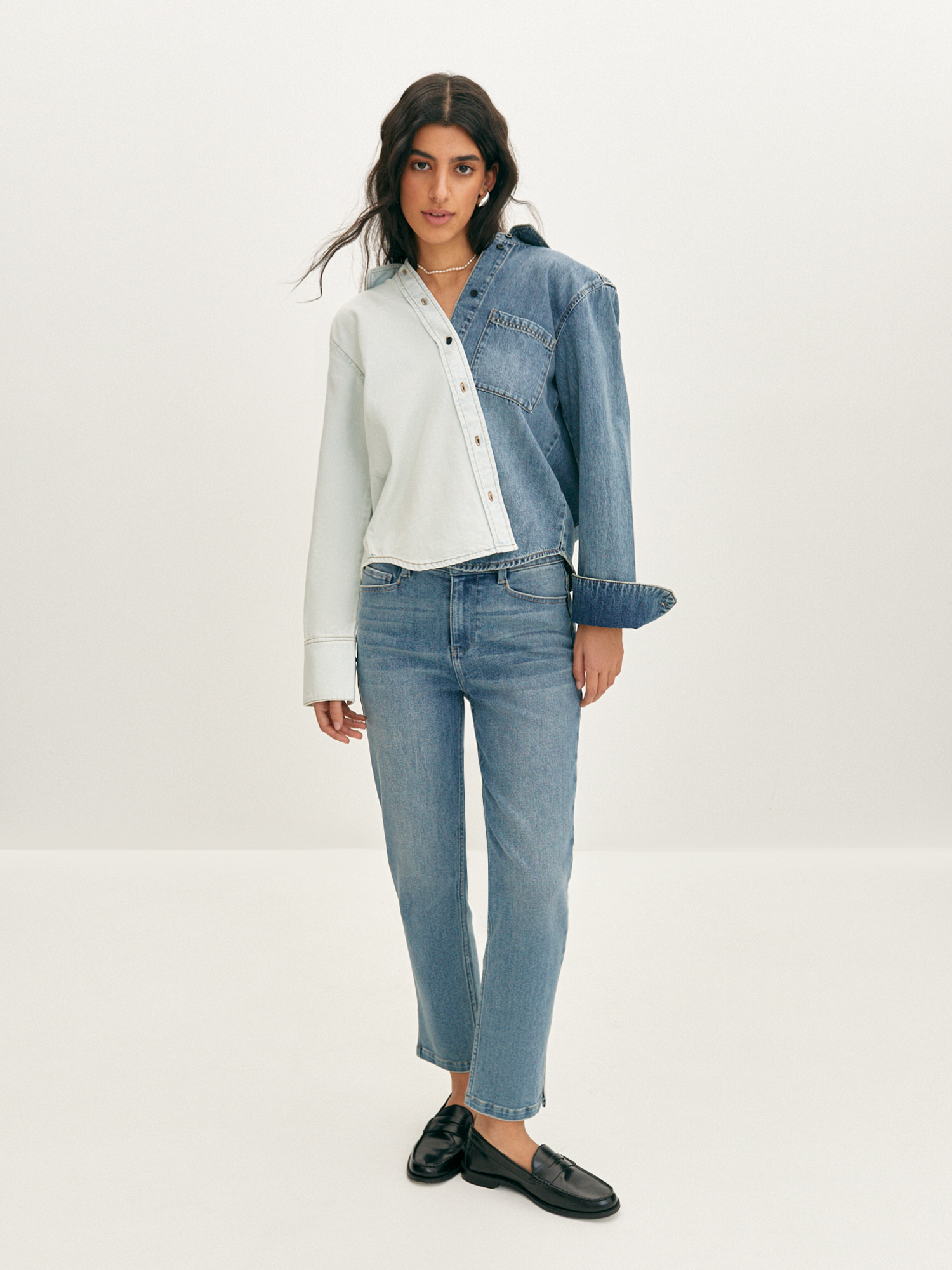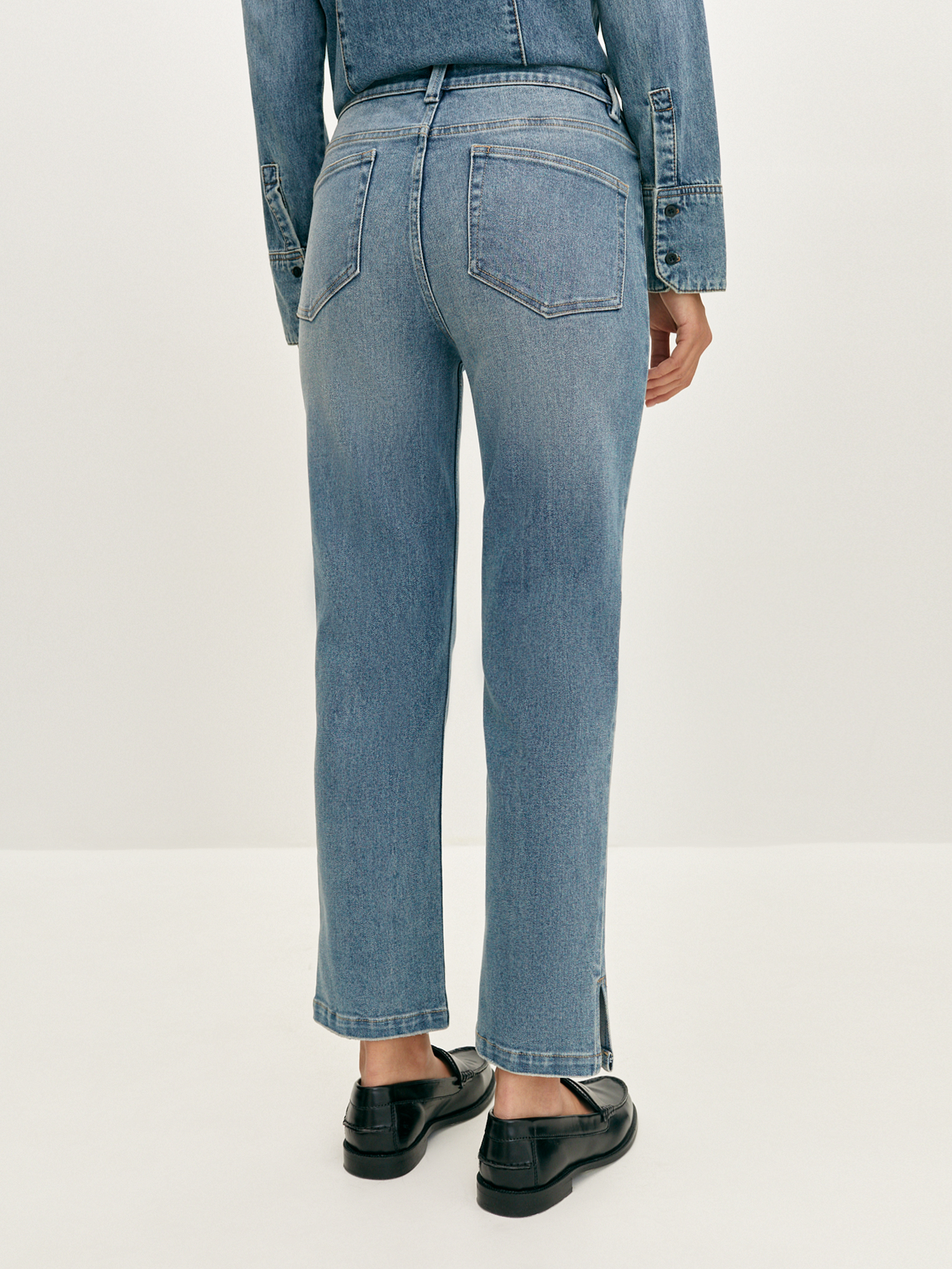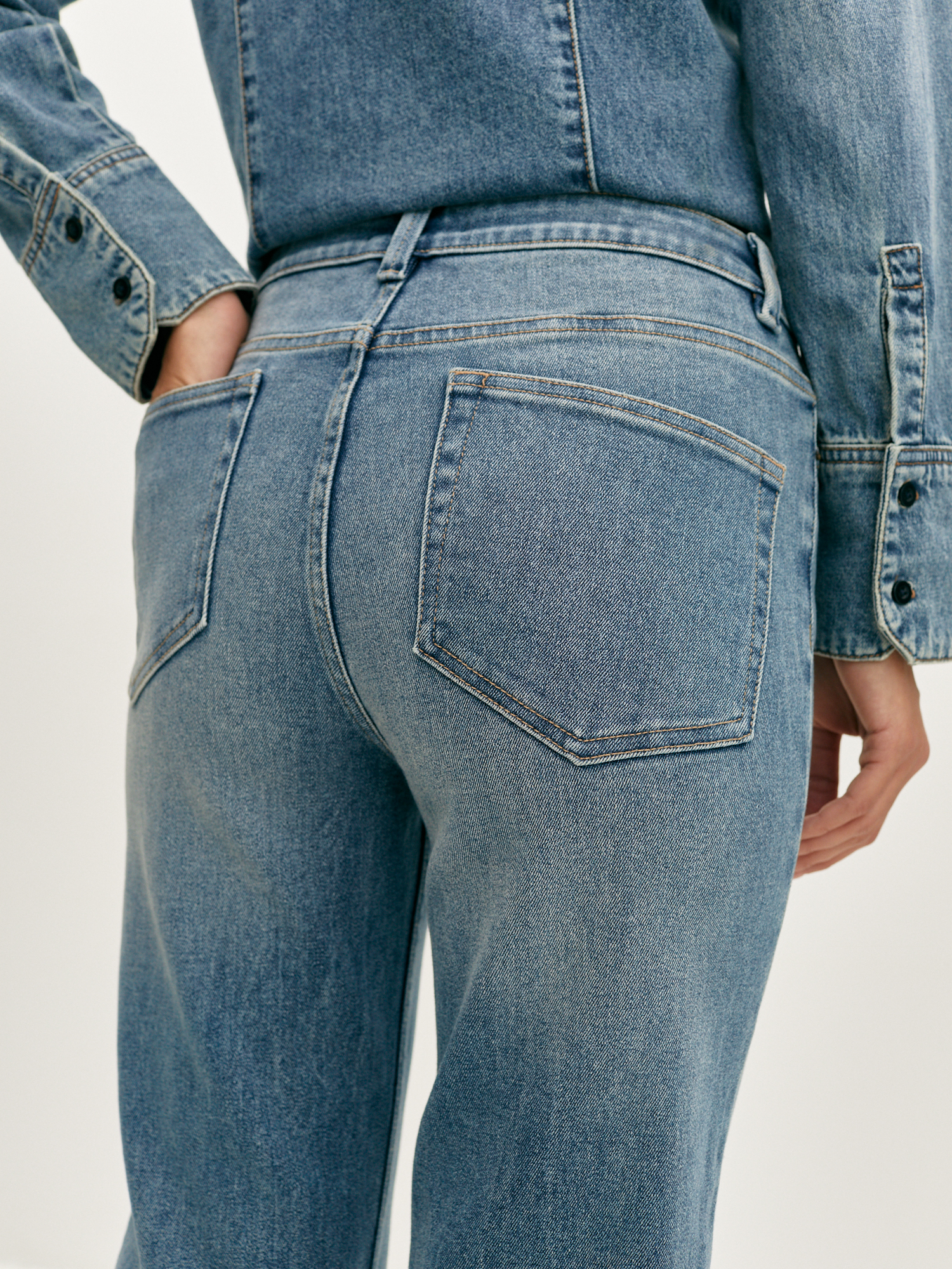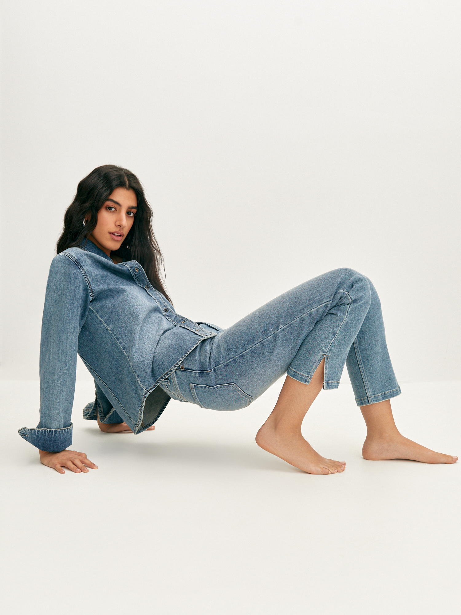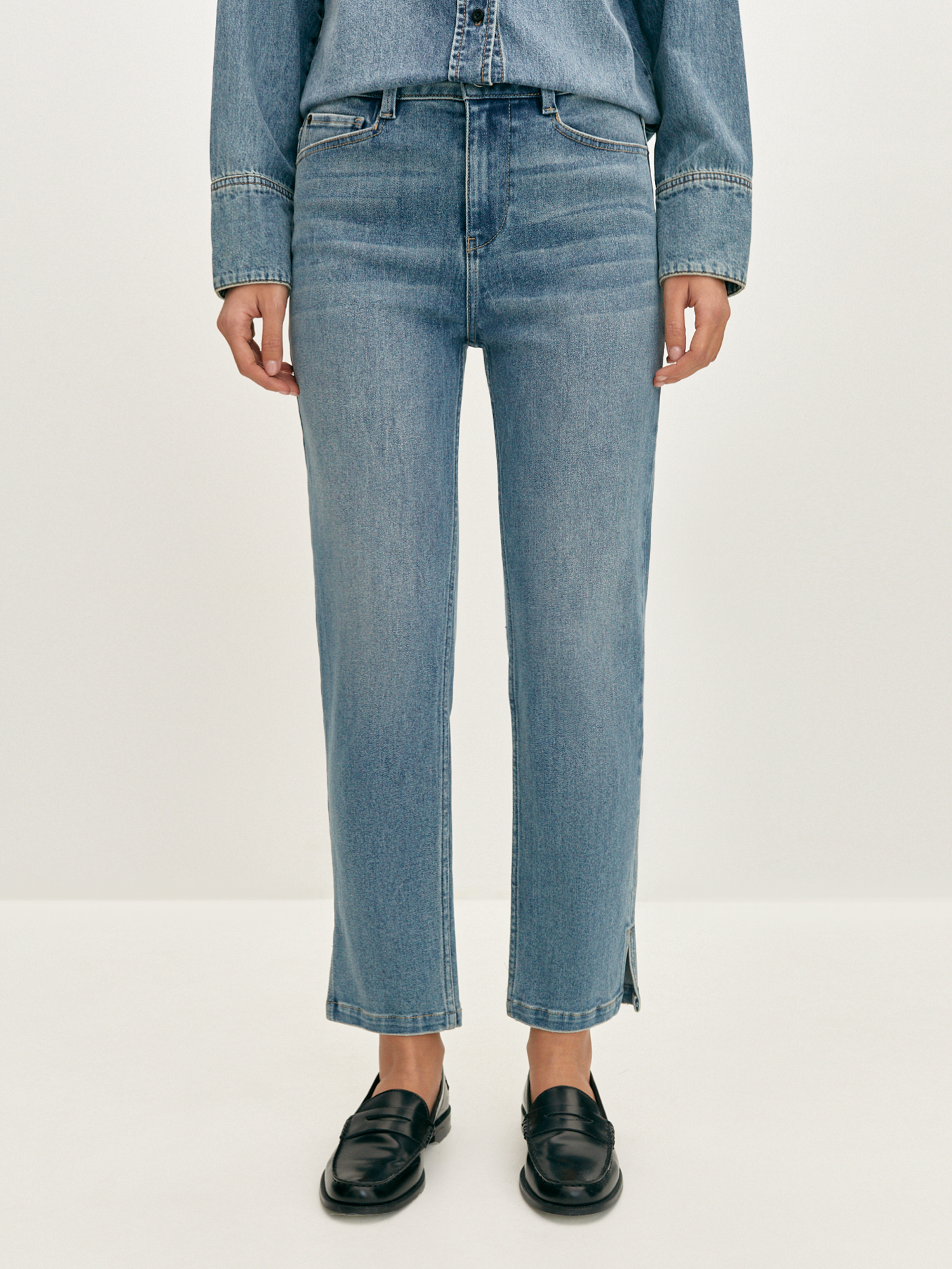 Синие прямые джинсы с завышенной линией талии безупречно садятся по фигуре и не сковывают движения. Хлопковая ткань с добавлением стрейчевых нитей отлично пропускает воздух, а брюки из нее долго сохраняют заданную форму. Модель прямого кроя с небольшим расклешением к низу дополнит ваш неформальный образ. Рекомендуется комбинировтаь с джинсовой рубашкой из комплекта.