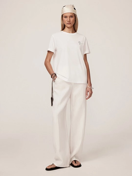 Футболка из тонкого трикотажа дарит ощущение комфорта в жаркий летний день. Модель выполнена из тонкого белого хлопкового трикотажа (100% хлопок), который обеспечивает натуральность, мягкость и приятные тактильные ощущения. Хлопок хорошо пропускает воздух, что делает футболку комфортной для носки в теплое время года. Круглый вырез отделан трикотажем "рибана", который обладает высокой эластичностью и способностью сохранять форму, обеспечивая аккуратность и долговечность выреза. Интересный дизайнерский ход – принт со стилизованным силуэтом лошади, нанесенный на собственном производстве с помощью машины для печати по ткани, становится ключевым акцентом, подчеркивая индивидуальность модели. Полуприлегающий силуэт позволяет комбинировать модель с любыми брюками, джинсами и юбками.
