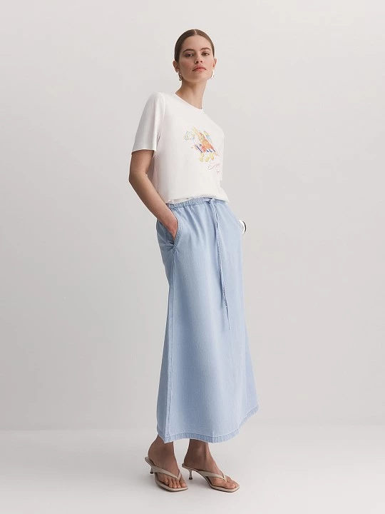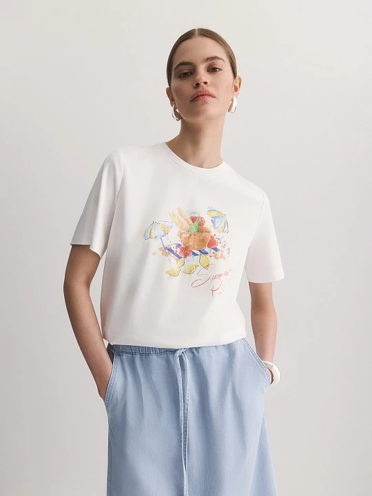 Белая футболка с авторским принтом – стильная вещь на каждый день. Сшитая из хлопкового трикотажа, который приятен к телу и отлично держит форму, эта модель станет незаменимой в гардеробе.