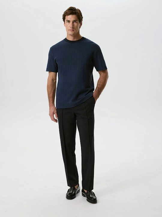Футболка силуэта regular выполнена из уникальной турецкой фактурной ткани, состоящей на 100% из хлопка. Модель изготовлена из высококачественного хлопка, который обеспечивает отличную воздухопроницаемость и мягкость на ощупь. Особенность данной ткани заключается в её фактуре: переплетение нитей формирует рисунок, напоминающий классическую клетку, что придаёт изделию оригинальный и современный вид. Такой дизайн позволяет легко сочетать футболку с различными предметами гардероба, будь то джинсы, шорты или брюки. Аккуратный круглый вырез декорирован подвязом в тон основной ткани, выполненным на японской плосковязальной машине Shima Seiki. Эта технология обеспечивает идеальную посадку и долговечность изделия. Подвяз из хлопковой пряжи в тон основному темно-синему цвету характеризуется 12-м классом вязки, что говорит о высоком качестве и прочности материала. Такой уровень обработки возможен благодаря полному циклу собственного производства, что гарантирует контроль на каждом этапе создания футболки. Эта футболка не только стильная, но и практичная. Она отлично подходит для повседневной носки, активного отдыха или встреч с друзьями. Вы можете легко комбинировать её с различными стилями одежды, создавая как непринужденные, так и более элегантные образы. Выбирая эту футболку, Вы получаете качественный и комфортный элемент гардероба, который будет радовать Вас своим внешним видом и долговечностью на протяжении долгого времени. Это идеальный выбор для современных мужчин, стремящихся к удобству и стилю в повседневной жизни.