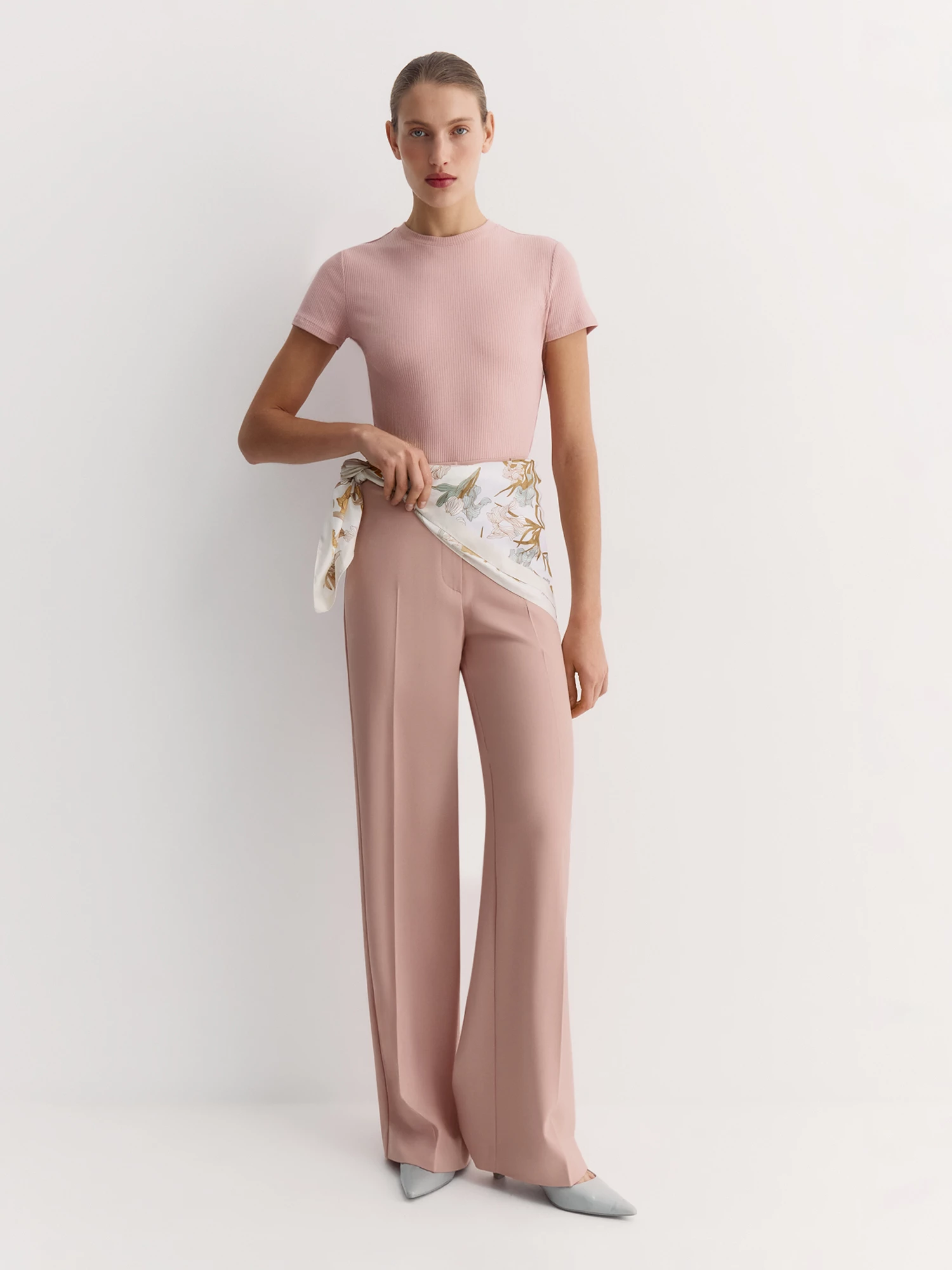 Актуальный розовый оттенок делает футболку комплементарной костюму с перестегивающимся жакетом JC0206.