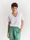 Футболка свободного кроя в бежевом оттенке. Мягкое полотно из 100% хлопка приятно к телу, хорошо пропускает воздух и слегка тянется, не мешая активному движению. V-образный вырез визуально удлиняет шею и придает образу женственности и элегантности. Лаконичная футболка отлично сочетается с любыми брюками, шортами или джинсами, что делает ее идеальным выбором для создания городского образа любой сложности.