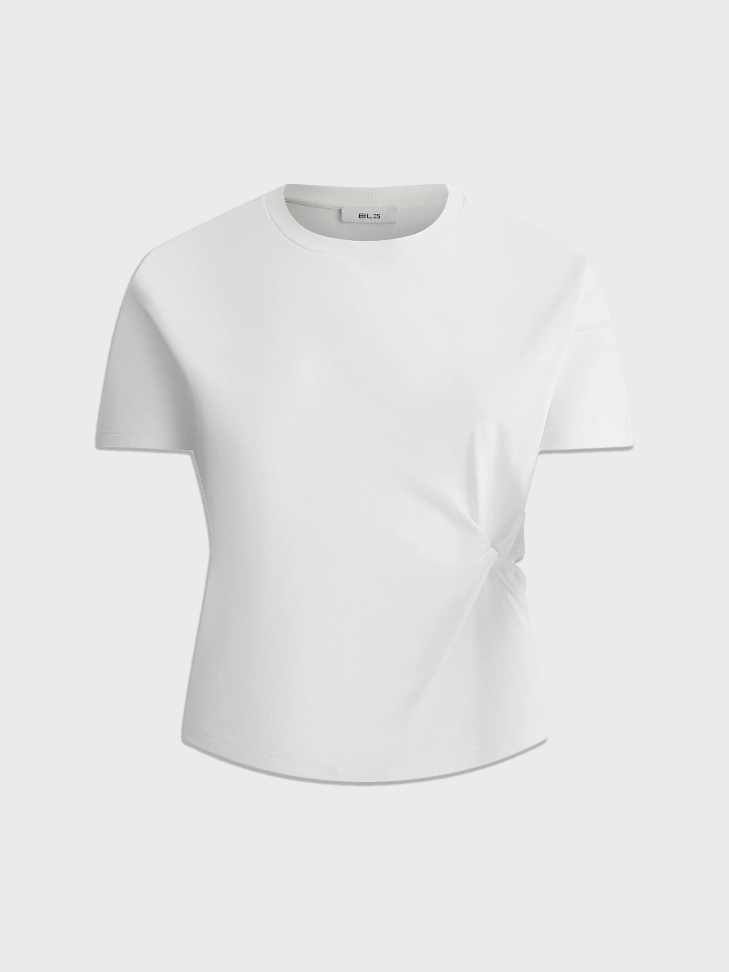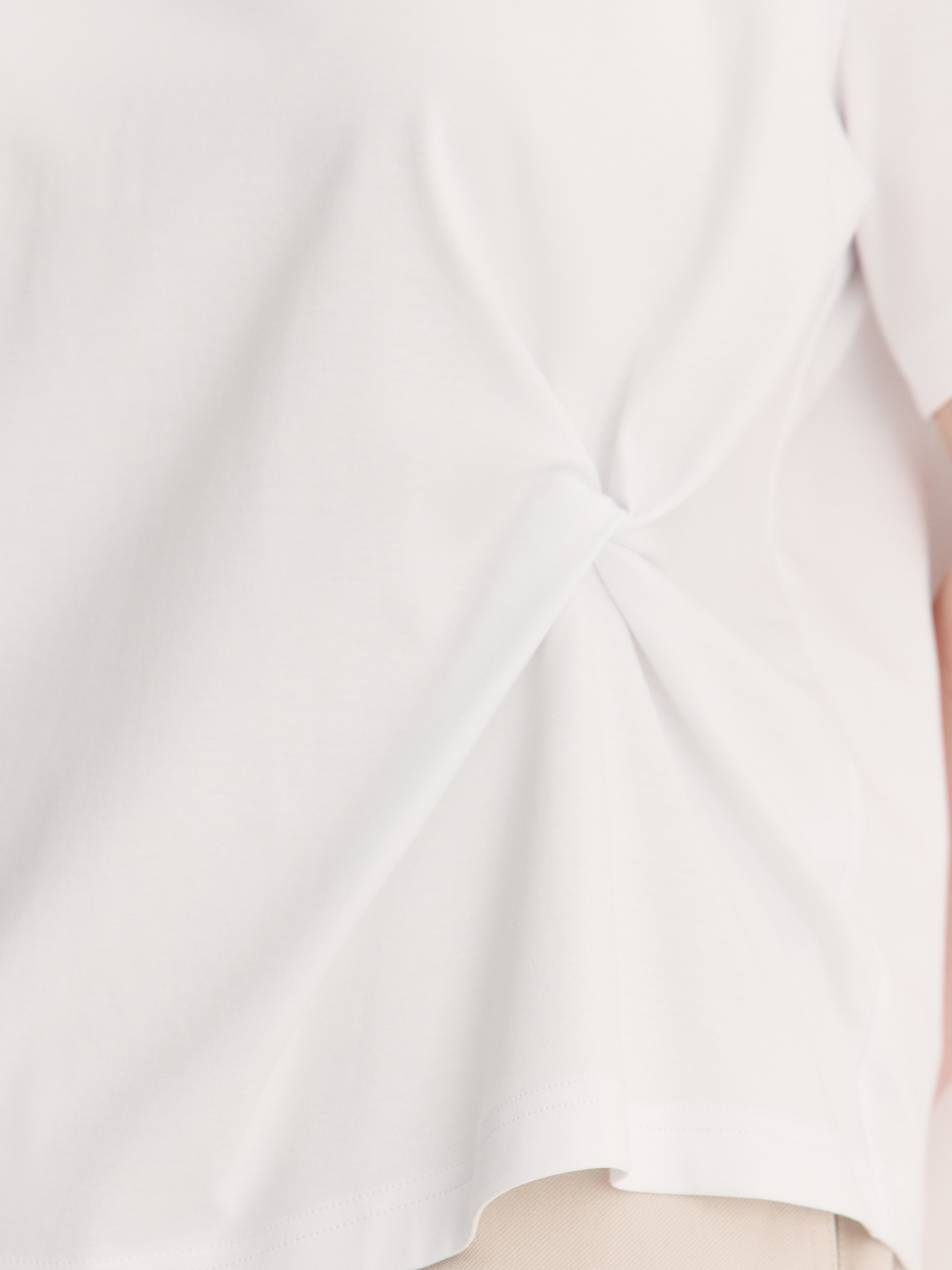Круглый вырез с отделкой в рубчик сохраняет форму, а спущенное плечо и короткий рукав создают расслабленный силуэт. Эффектный перекрут спереди добавляет образу изюминку.