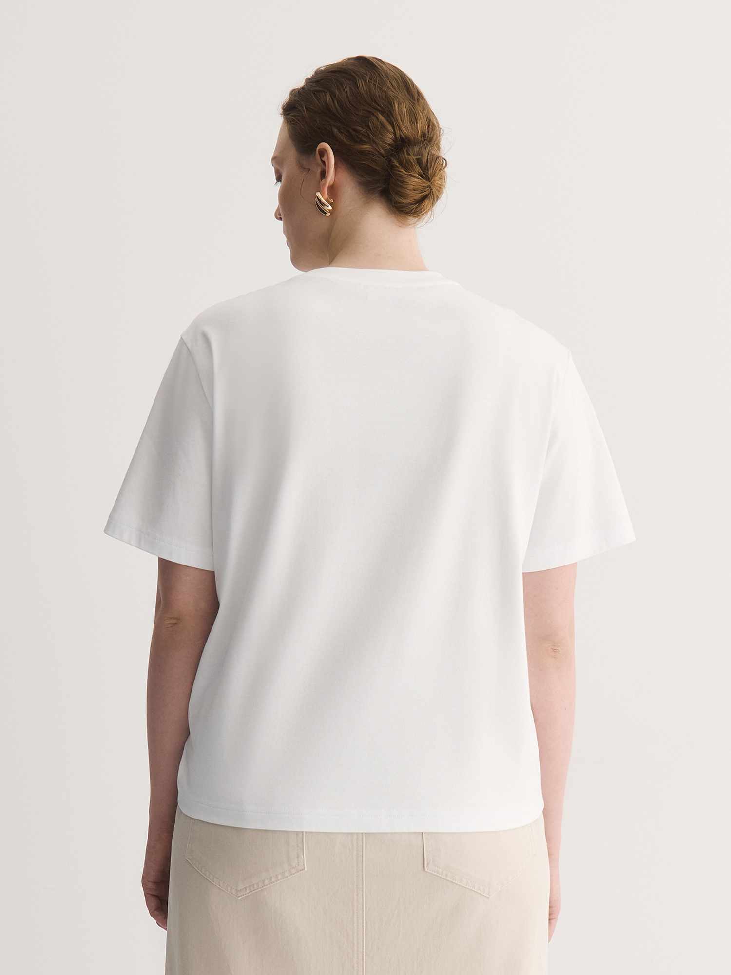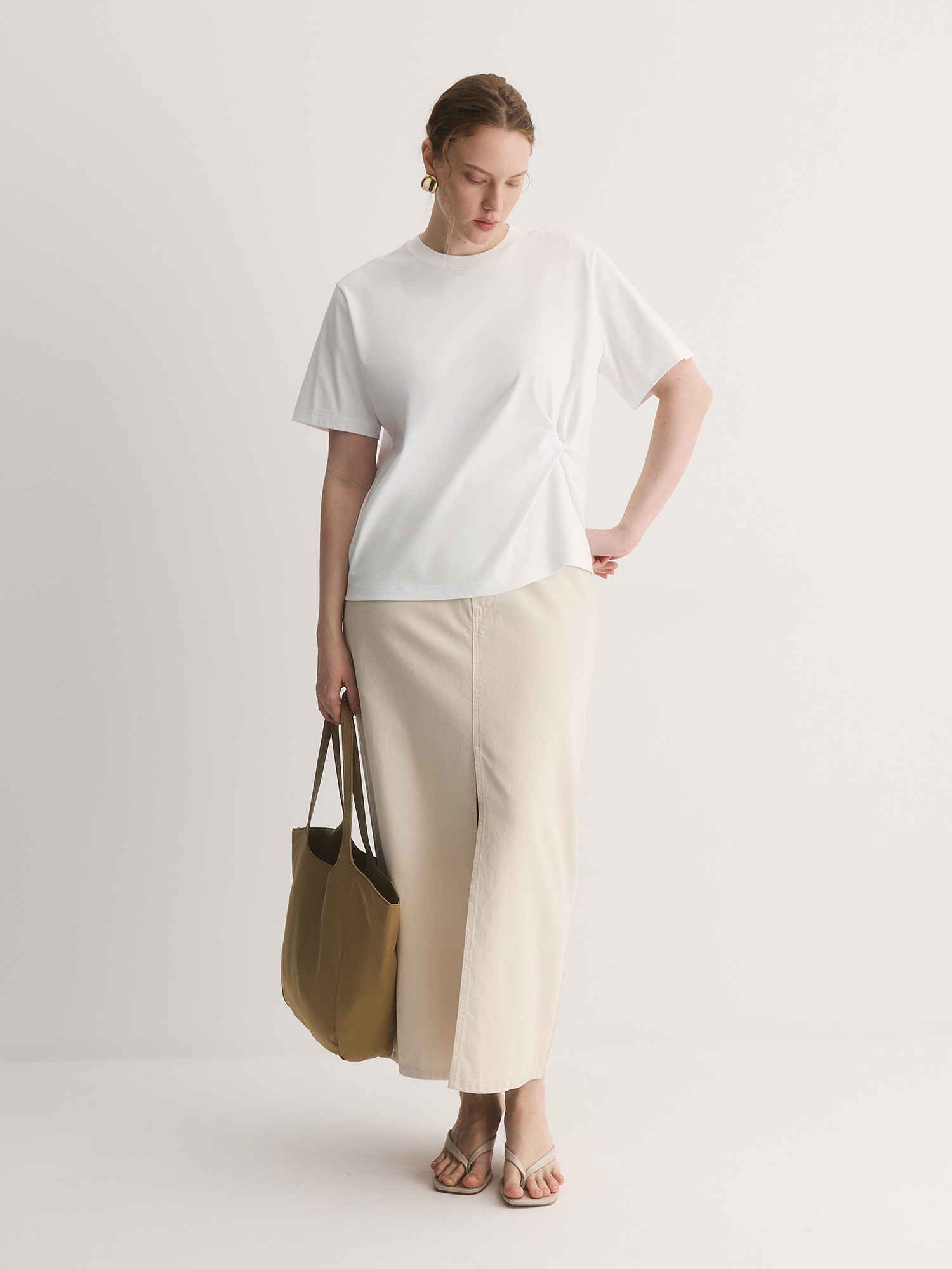 Белая хлопковая футболка с перекрутом – свежий взгляд на базовую модель. Сшитая из 100% натурального хлопка, она мягкая, дышащая и приятная к телу, обеспечивает комфорт весь день.