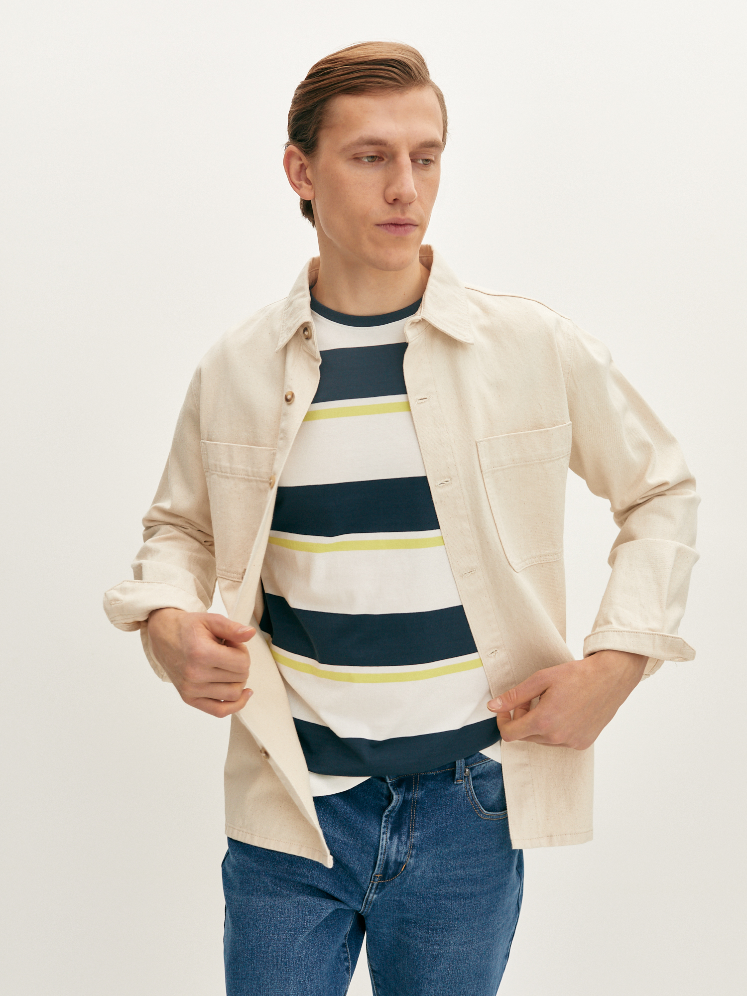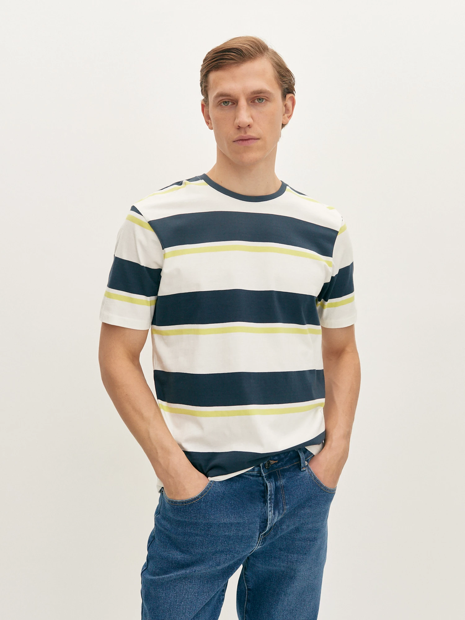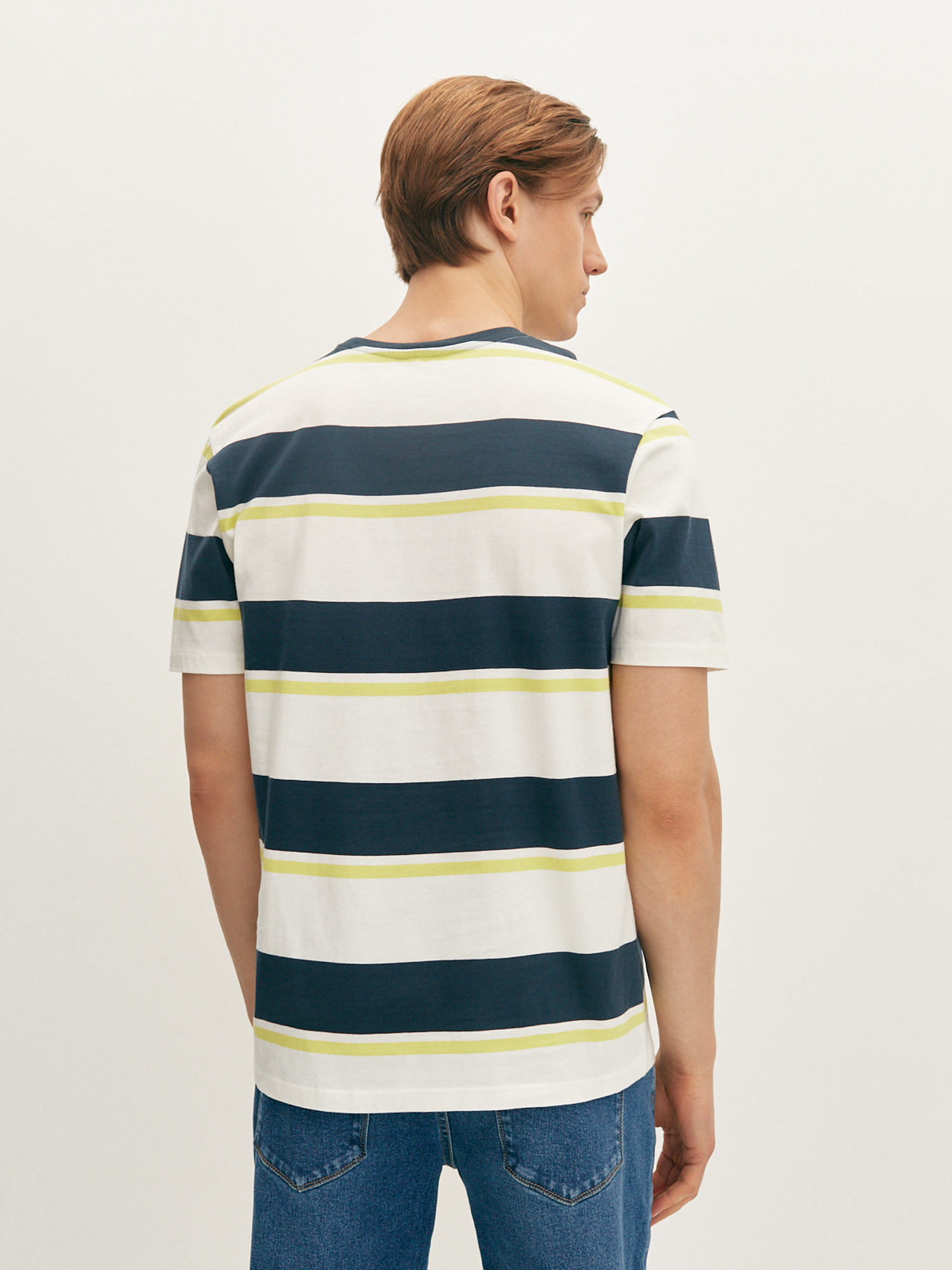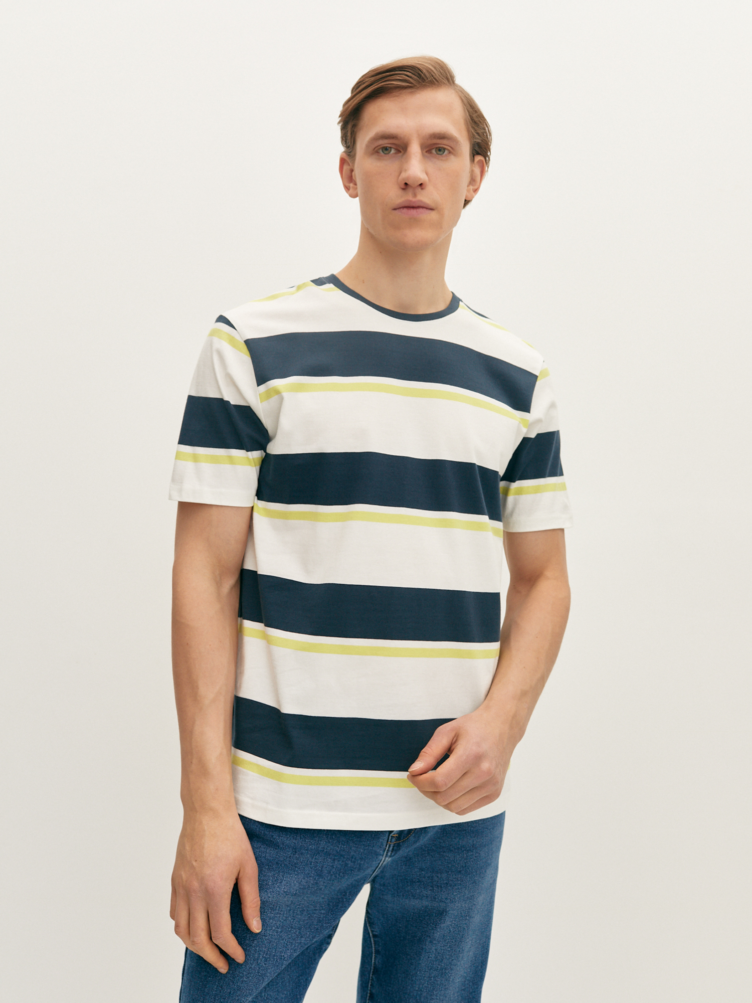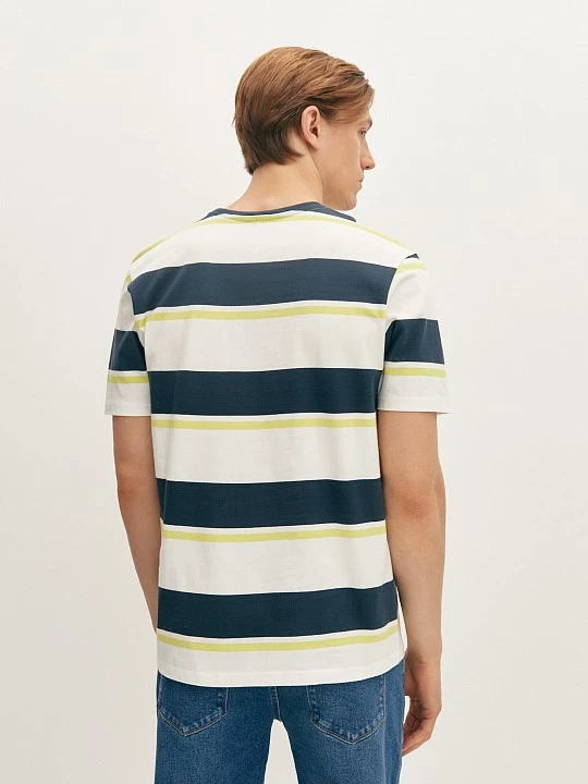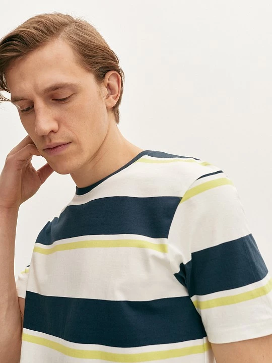 Белая футболка свободного кроя с контрастными полосками синего и лаймового оттенка подходит для любого типа фигуры. Модель из гладкого хлопка, со спущенной линией плеча, коротким рукавом и круглой горловиной обеспечивают удобную посадку. Футболка идеально подходит для расслабленных повседневных образов с джинсами и свободными брюками.