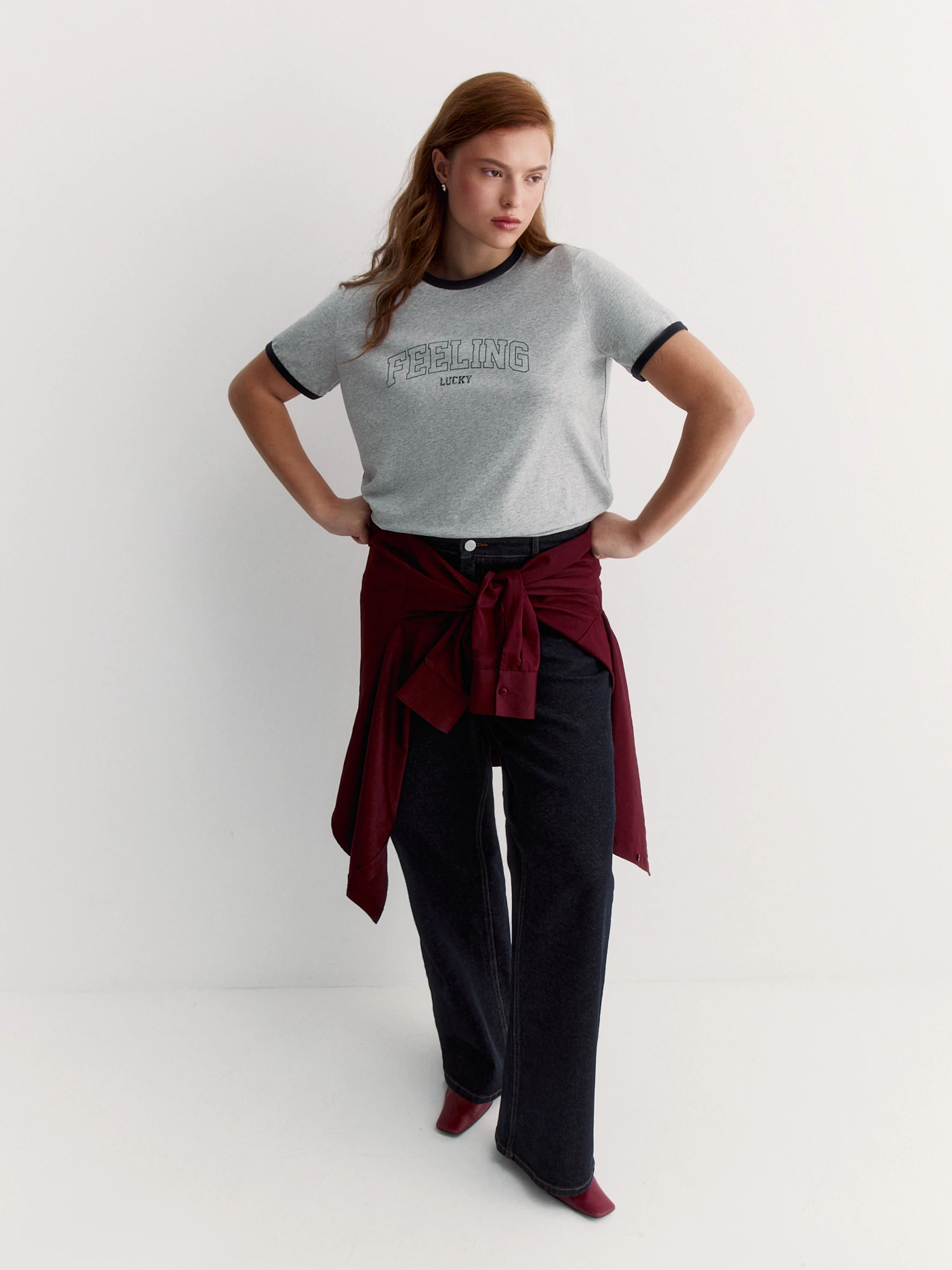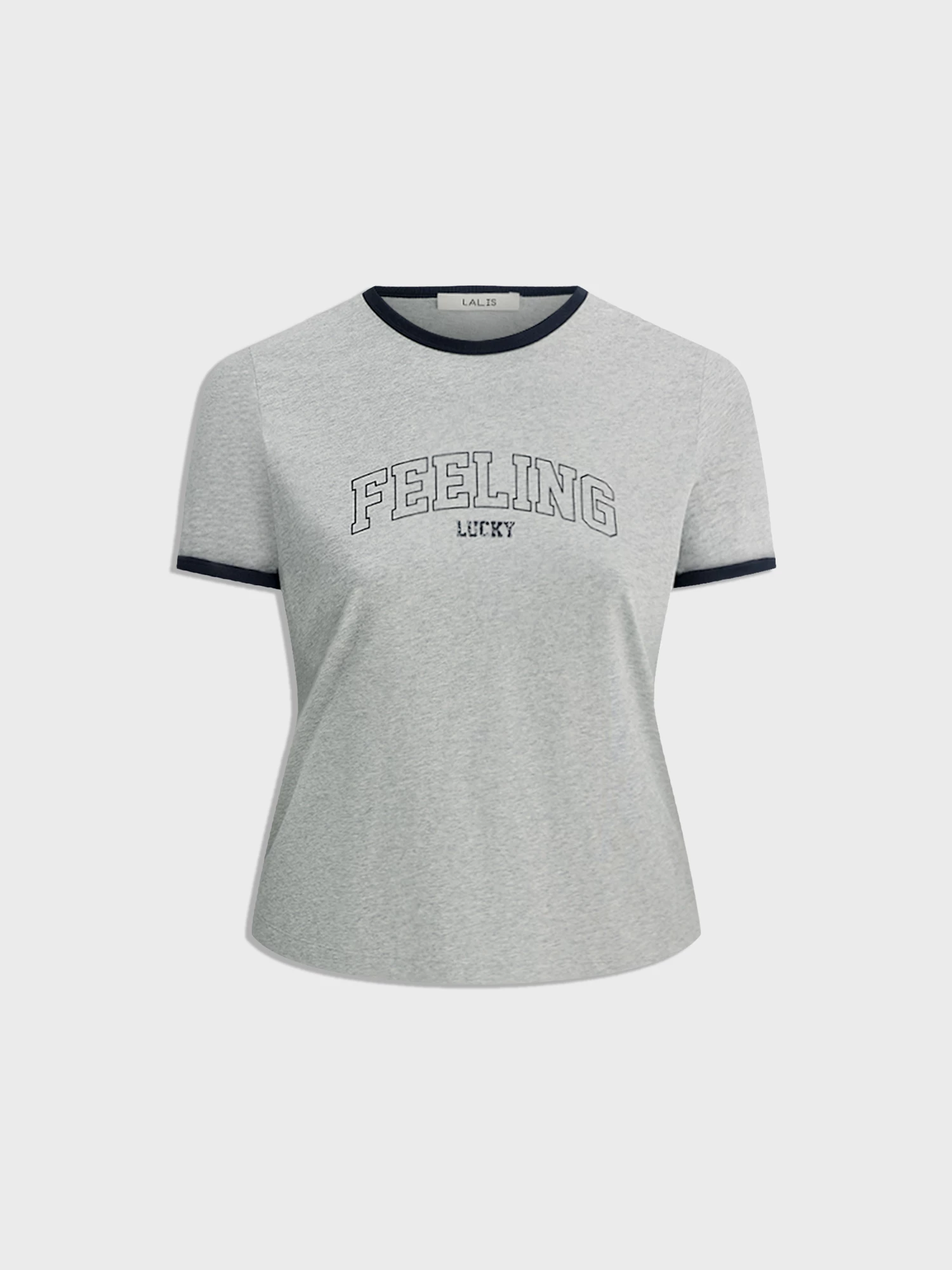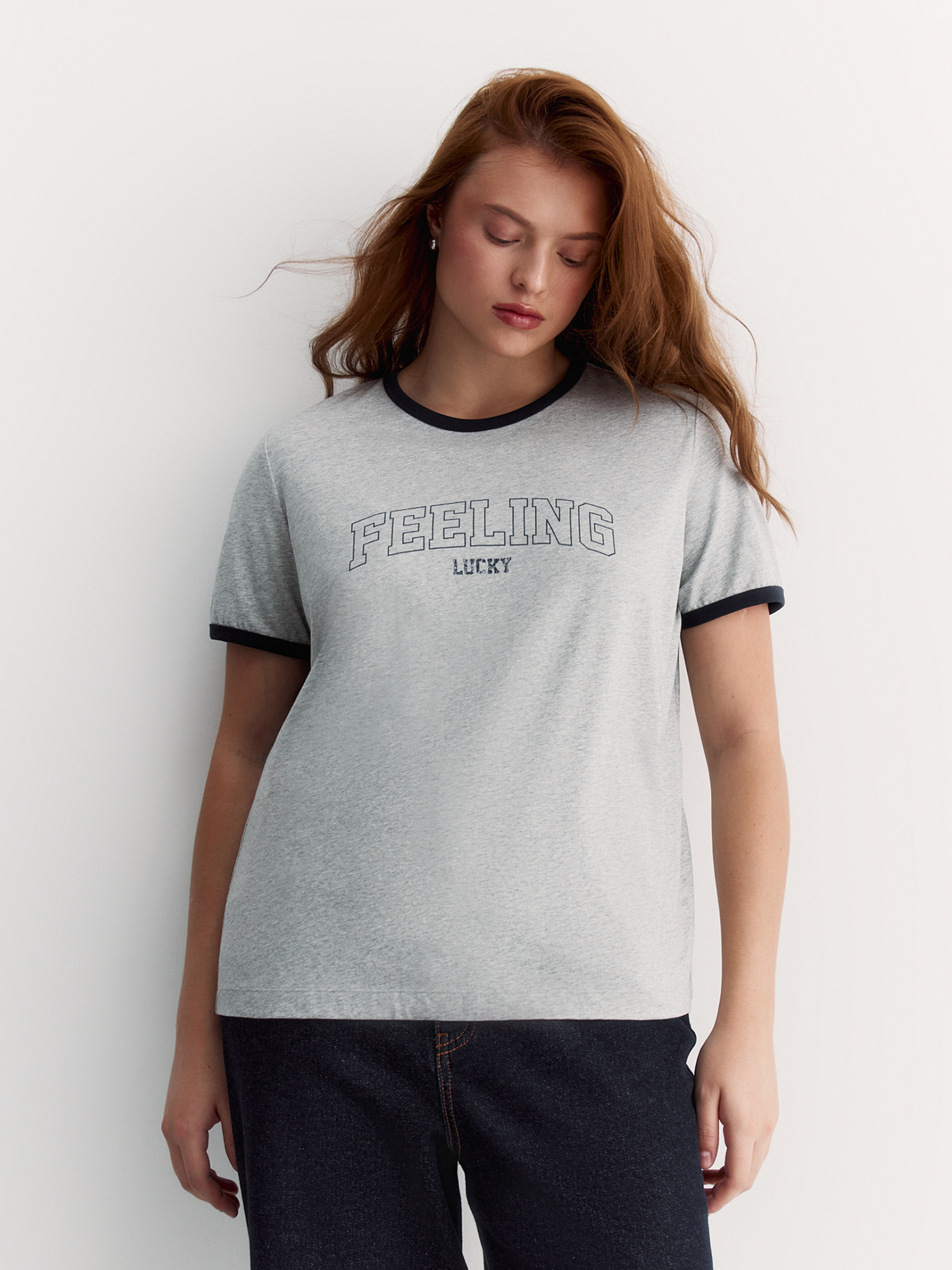 Круглый вырез и короткие рукава со слегка спущенным плечом создают комфортный силуэт. Контрастный кант по горловине и рукавам добавляет стильную изюминку. Мотивирующий принт FEELING LUCKY (рус. "ЛОВЛЮ УДАЧУ") - это позитивный настрой на весь день.