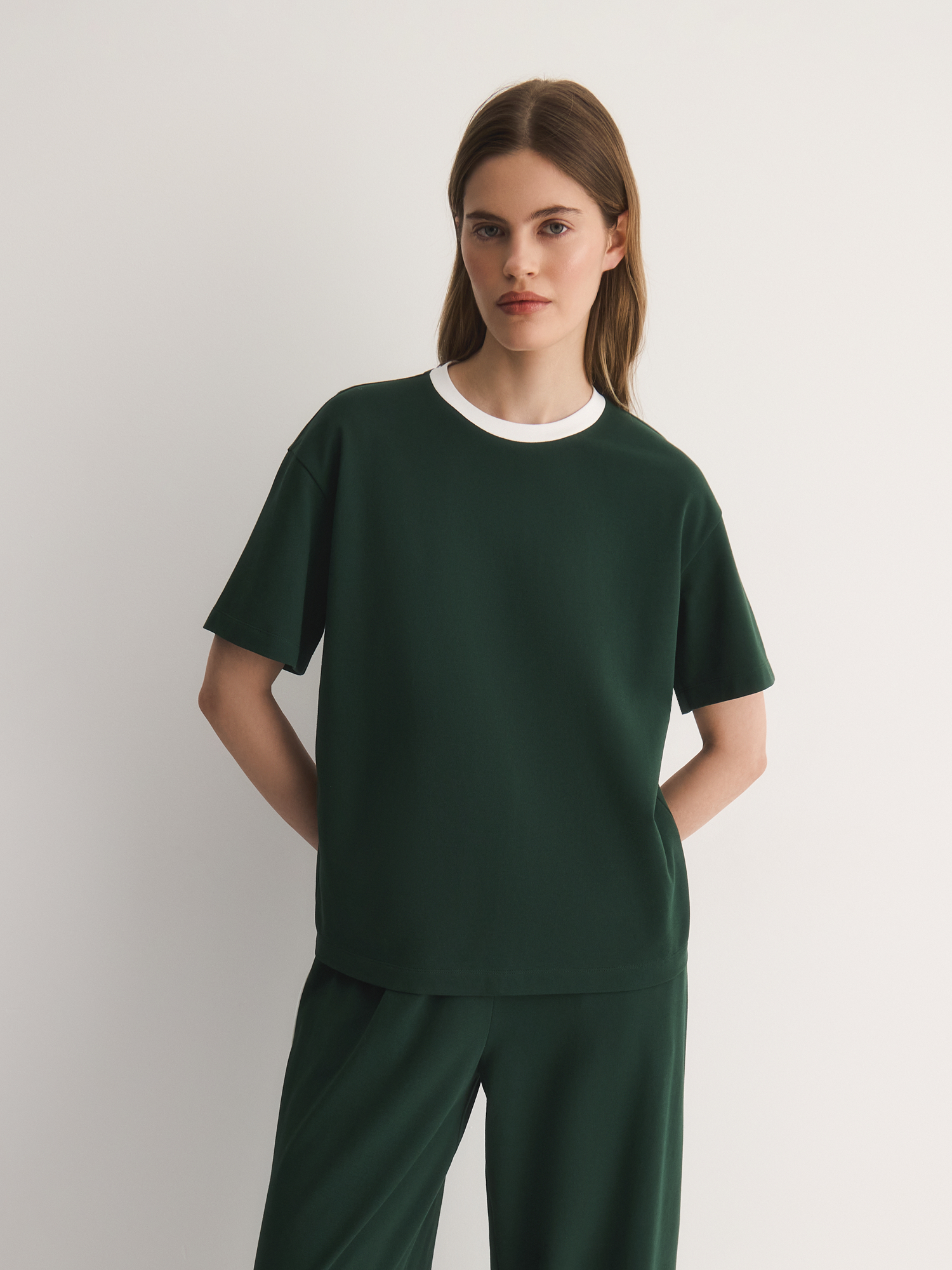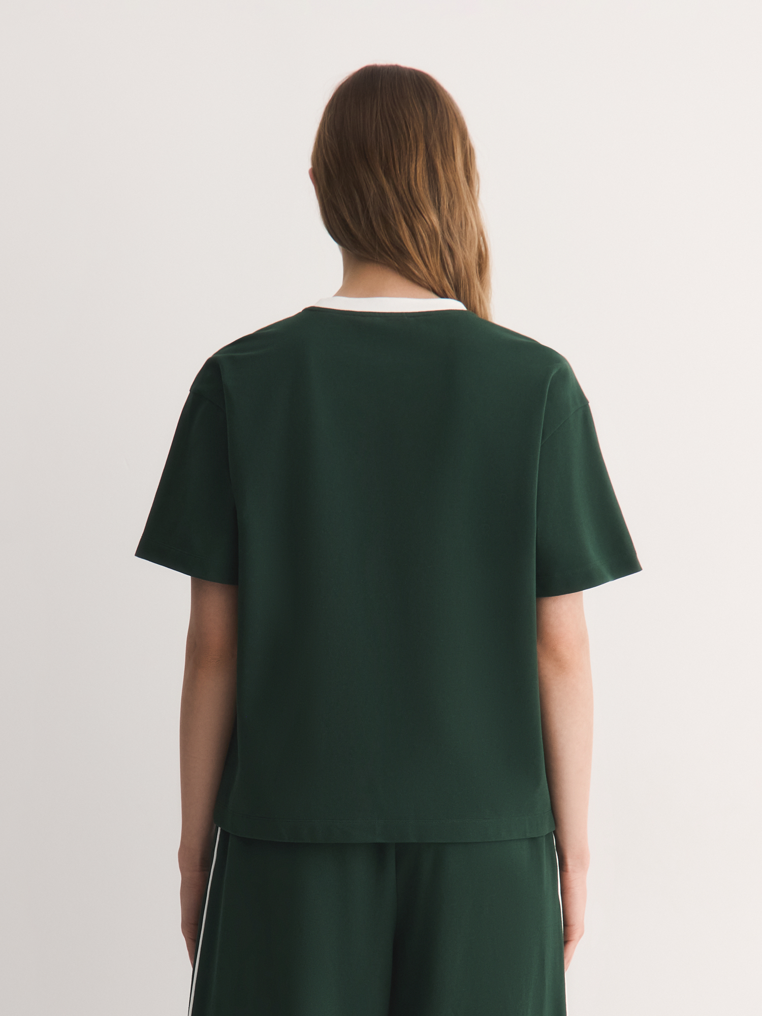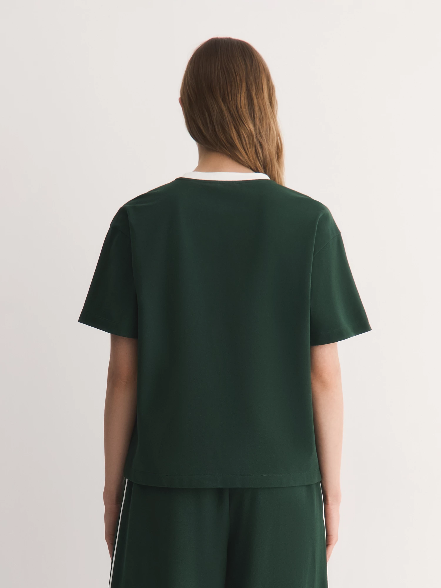 Актуальный темно-зеленый оттенок добавляет образу актуальности и выразительности. Белый кант по горловине создает гармоничный акцент, подчеркивая спортивный стиль и динамичность образа.