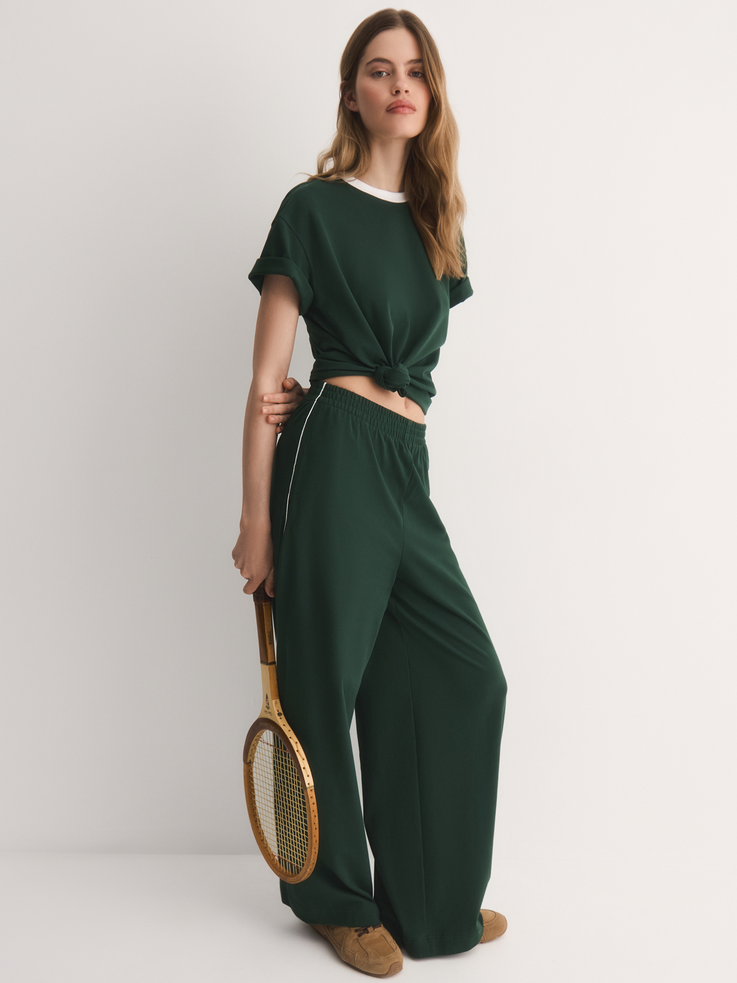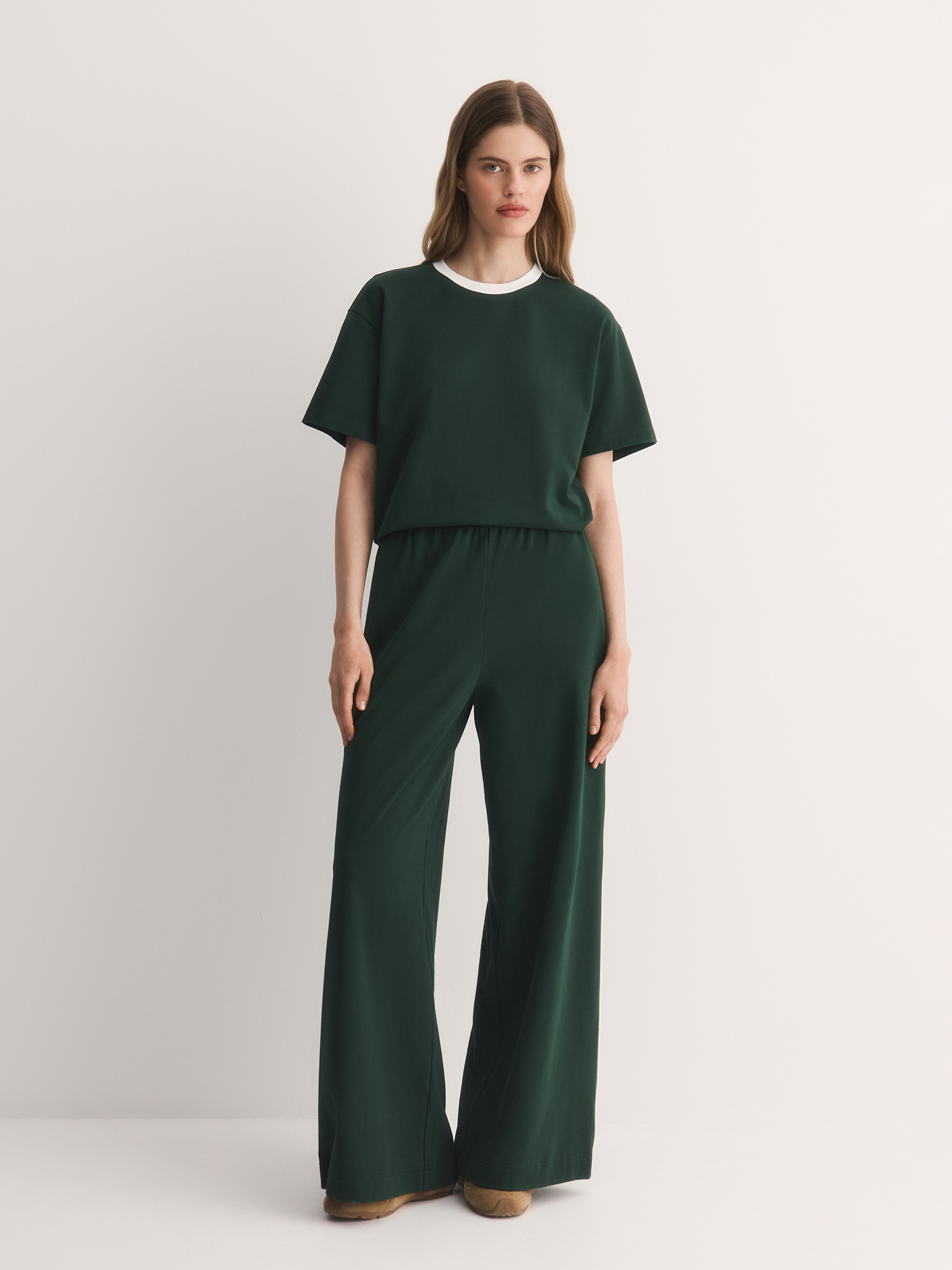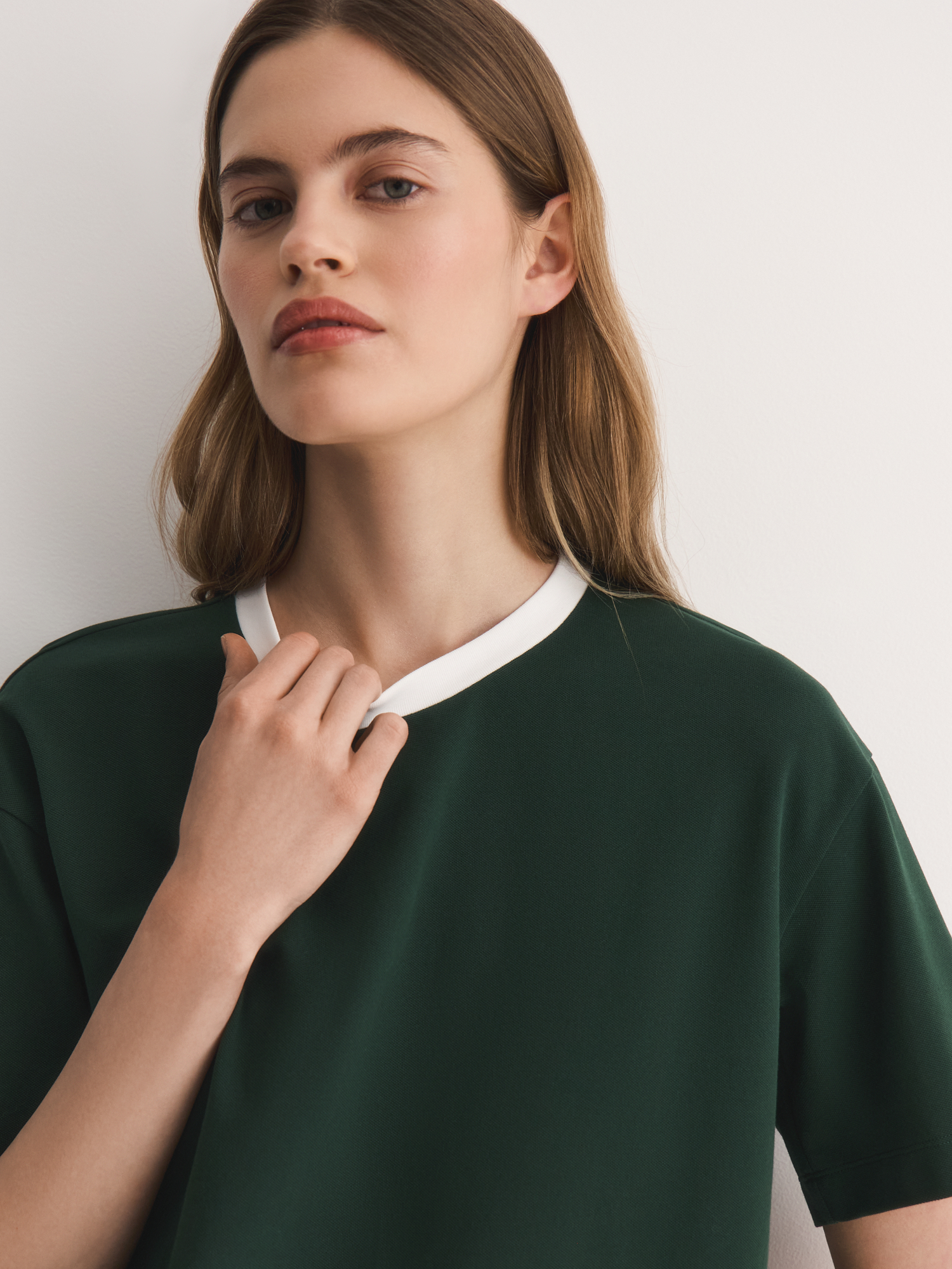 Актуальный темно-зеленый оттенок добавляет образу актуальности и выразительности. Белый кант по горловине создает гармоничный акцент, подчеркивая спортивный стиль и динамичность образа.