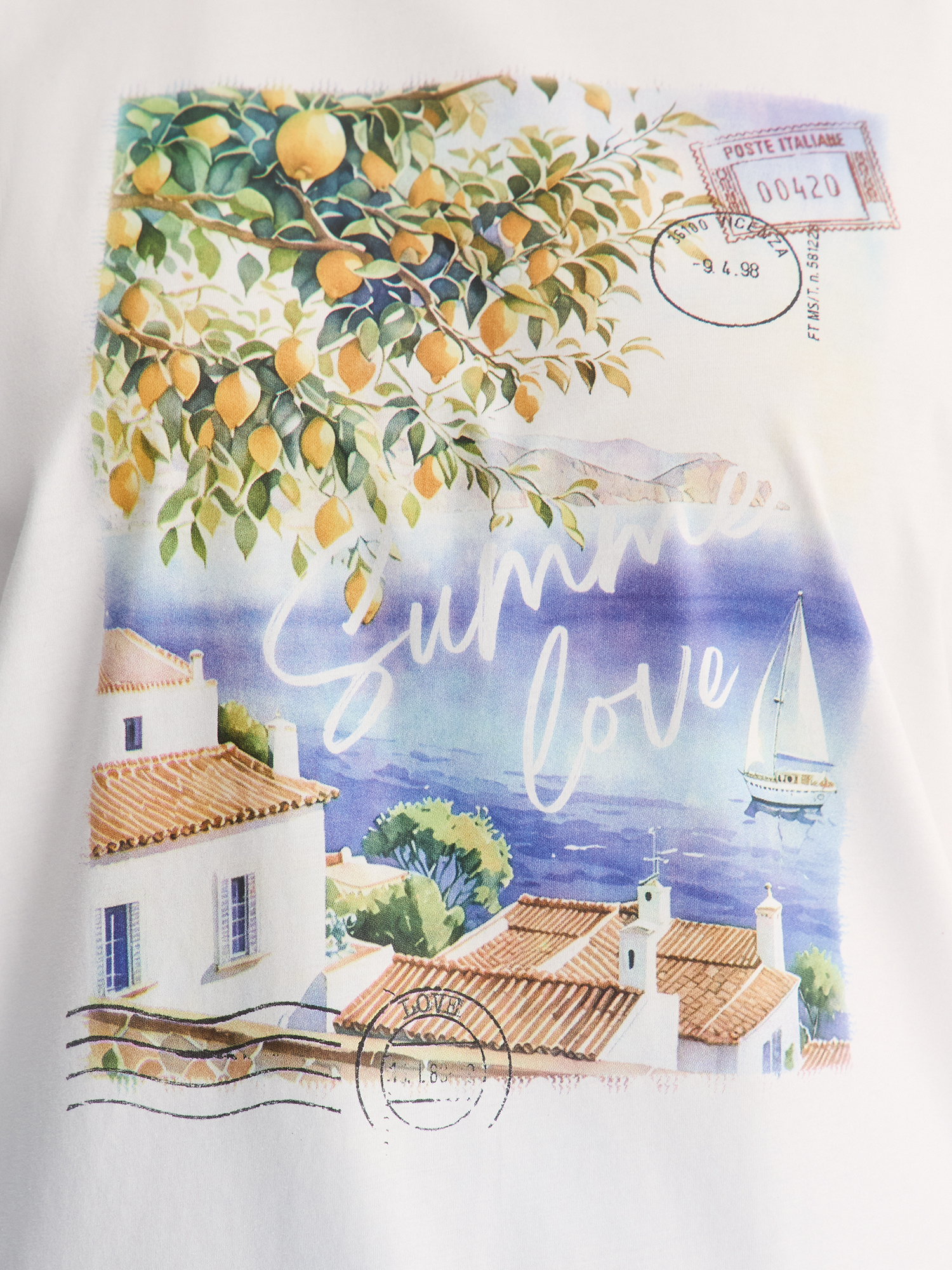 Короткие рукава со спущенным плечом и прямой силуэт создают расслабленный образ, а уникальный принт в эстетике курортного шика добавляет индивидуальности.