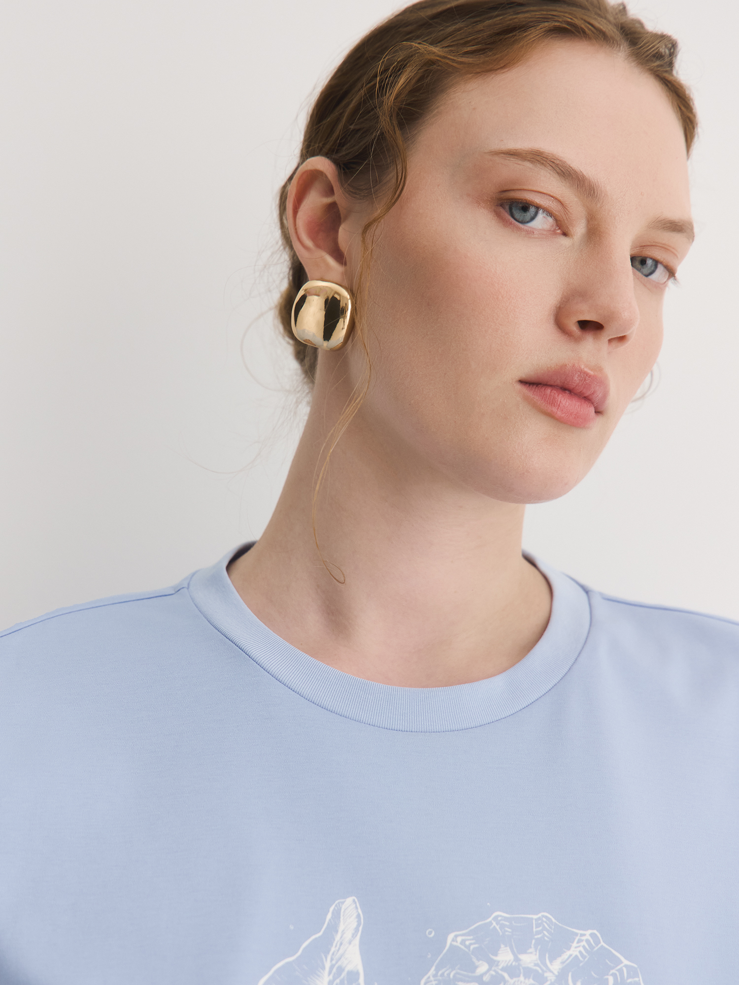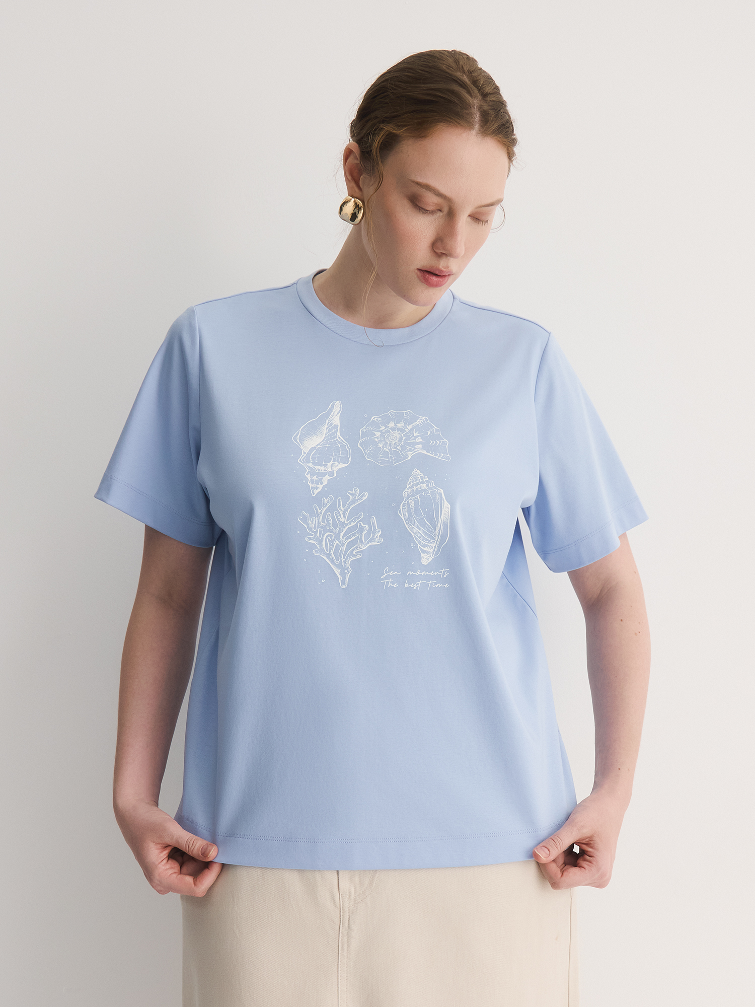Голубая футболка с авторским принтом – стильная вещь на каждый день. Сшитая из хлопкового трикотажа, который приятен к телу, обладает шелковистым блеском и отлично держит форму — не мнётся и сохраняет аккуратный вид даже после долгого дня.