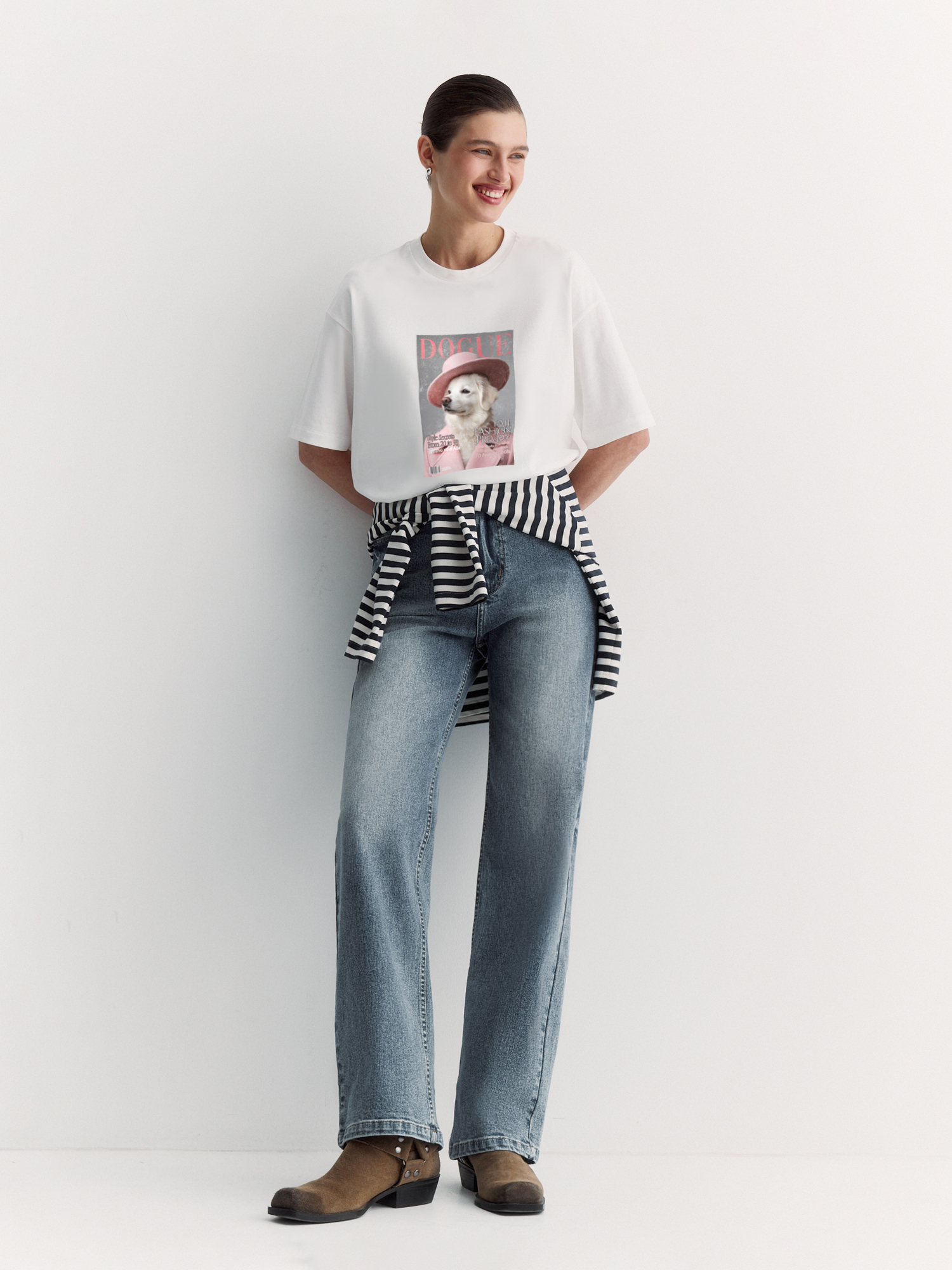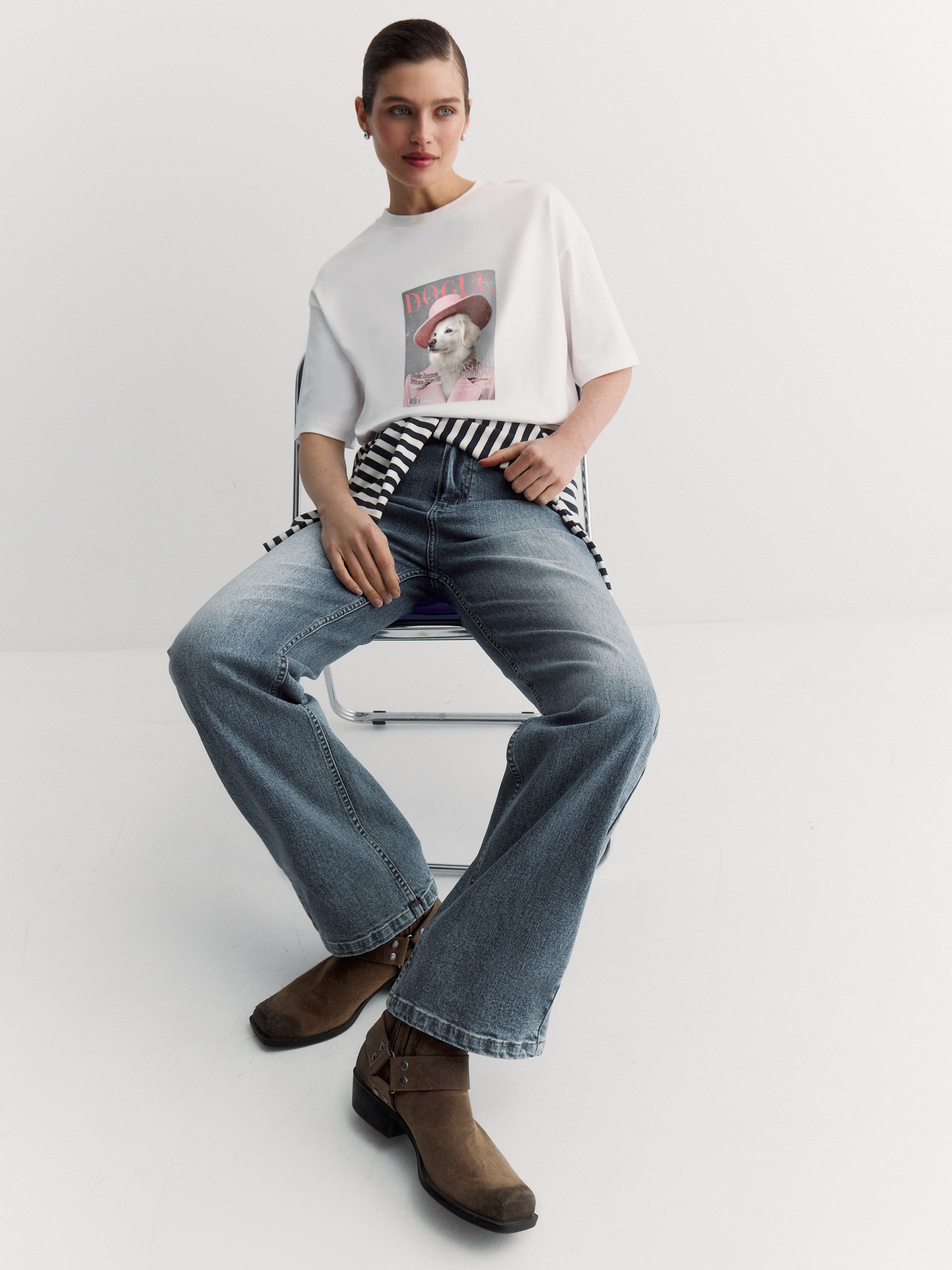 Слегка увеличенный силуэт со спущенным плечом и втачными рукавами создаёт непринуждённый вид. Авторский рисунок добавляет образу индивидуальности.