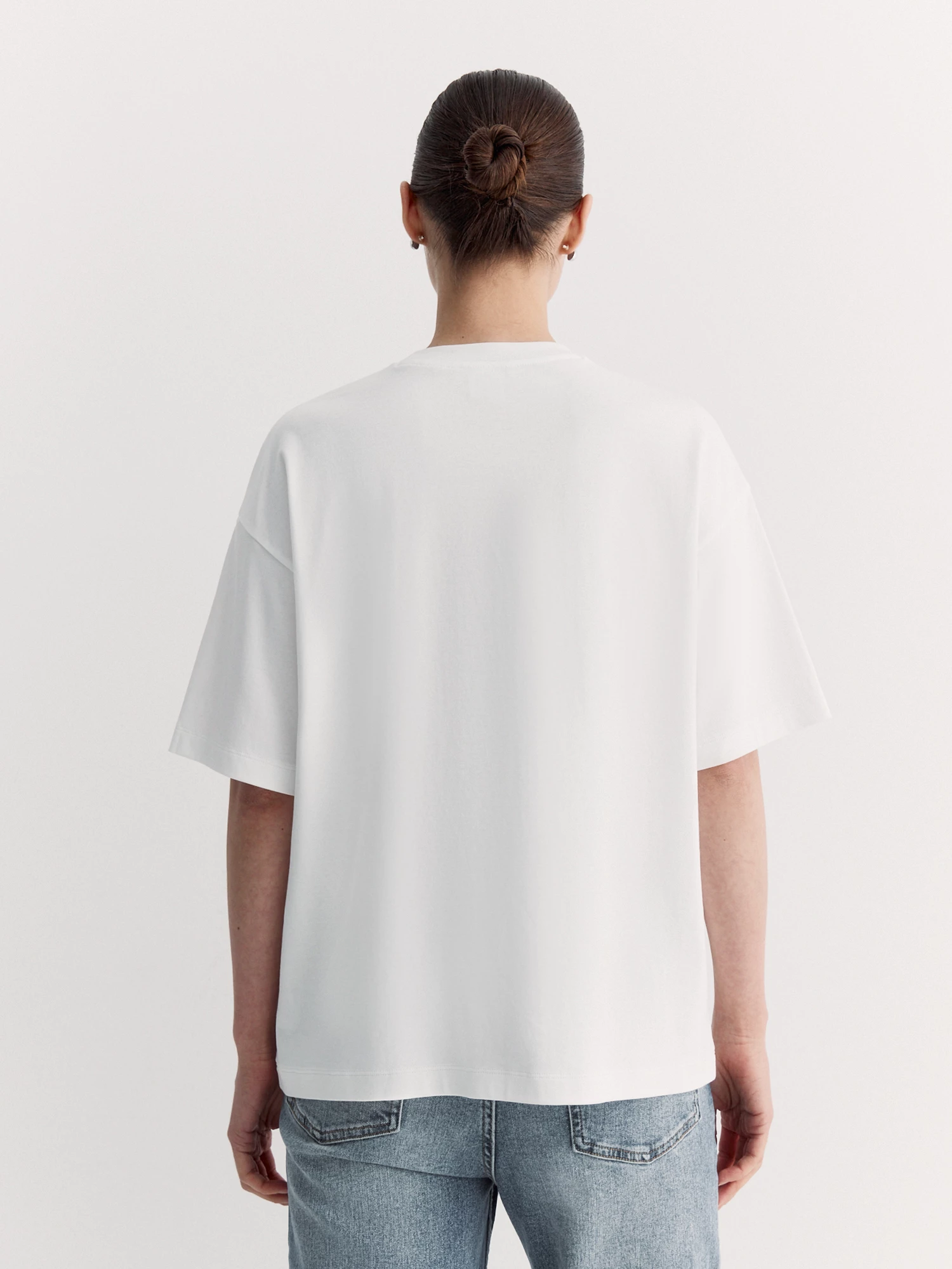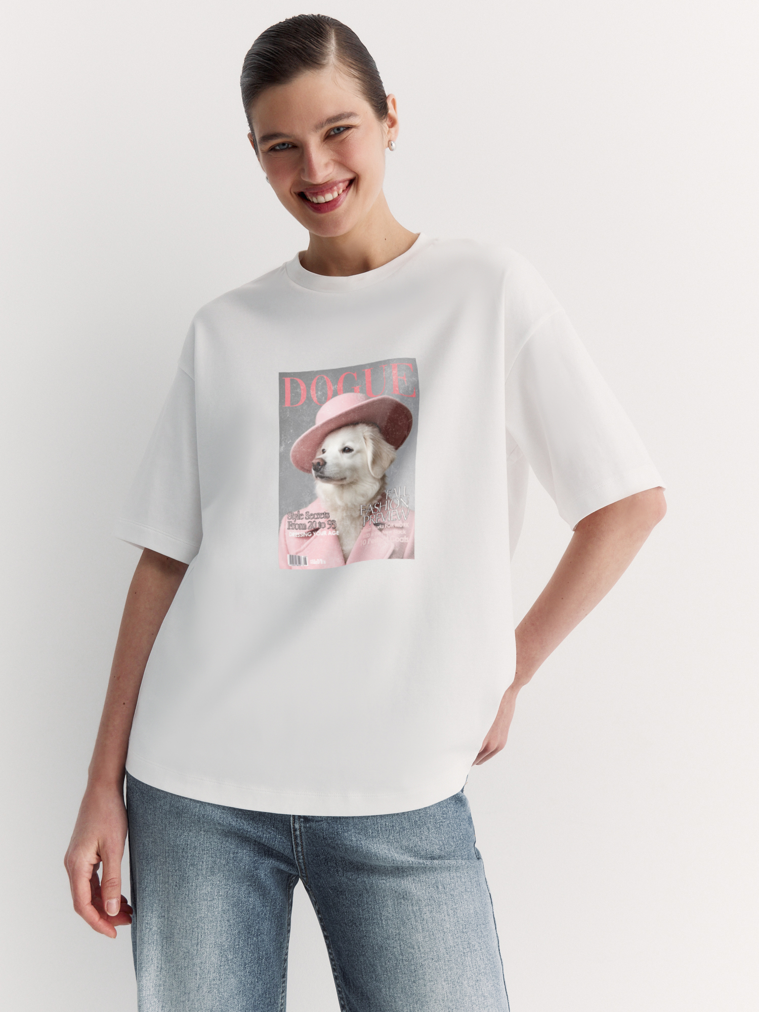 Футболка свободного кроя с дизайнерским рисунком – стильная база для повседневных образов. Сшита из мягкого мерсеризованного хлопка, который приятен к телу и сохраняет яркость цвета после множества стирок.