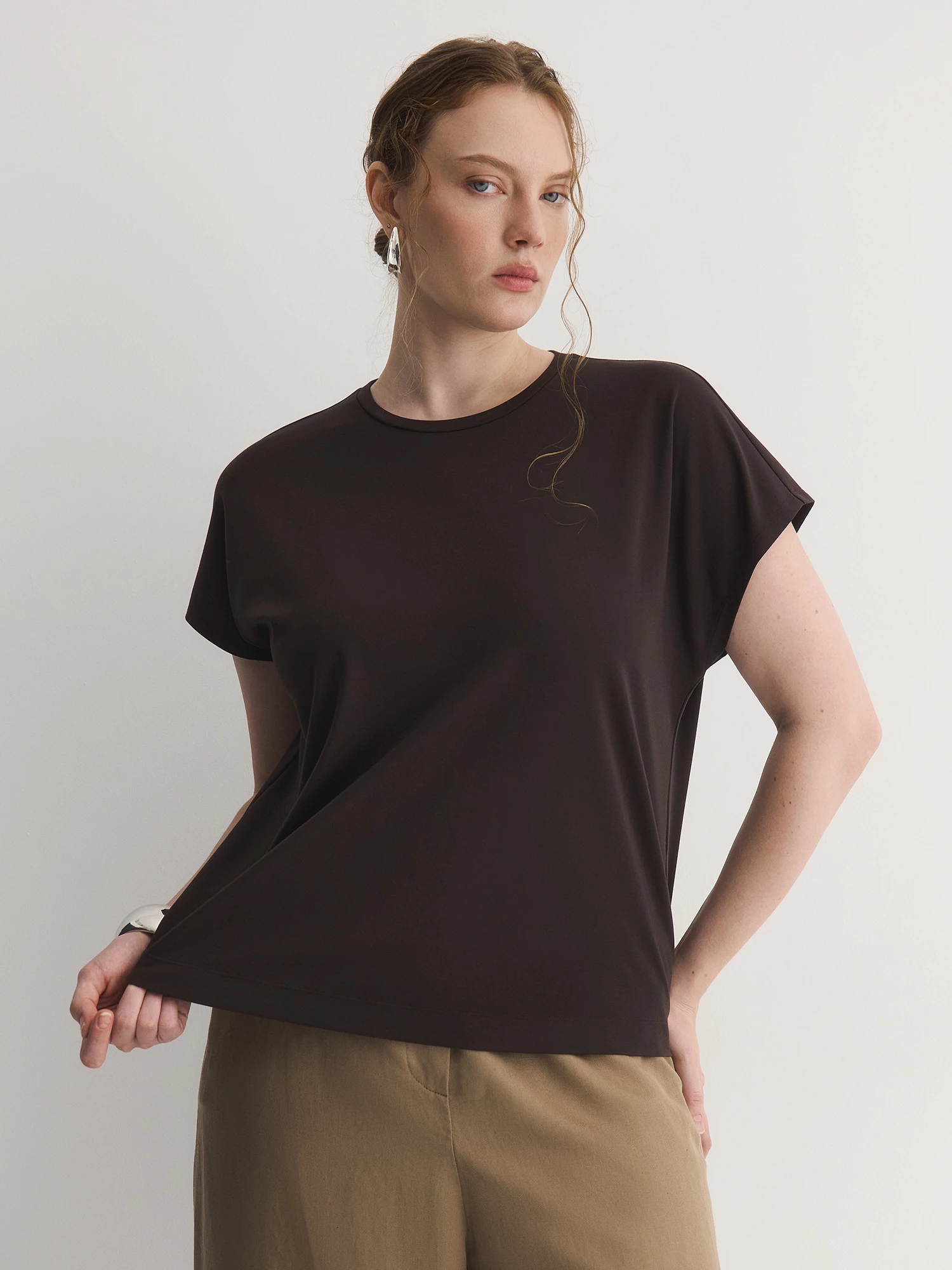 Футболка из вискозного трикотажа с добавлением нейлона и спандекса приятно облегает фигуру, не сковывая движений. Круглый вырез и спущенное плечо, образующее короткий рукав, создают расслабленный, но аккуратный силуэт.