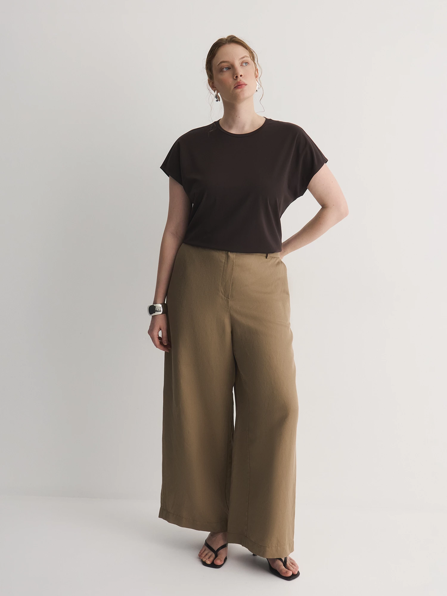 Ткань мягкая, тянется и отлично пропускает воздух — в ней будет комфортно даже в теплую погоду. Насыщенный шоколадный вкусный цвет добавит образу теплоты и легко сочетается с джинсами, юбками или шортами.