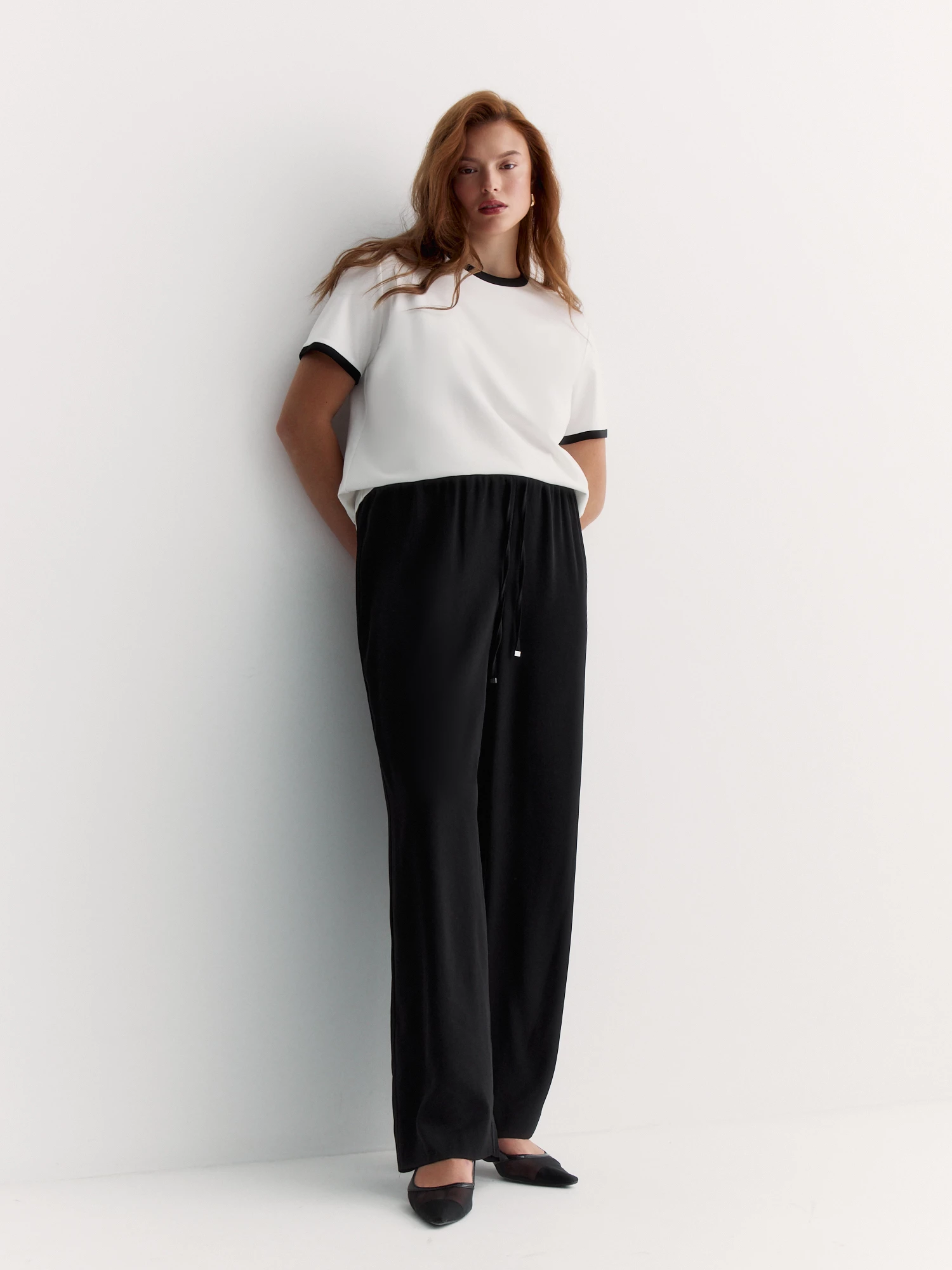 Черный кант придает белой футболке четкость, а классическое бело-черное сочетание всегда актуально.