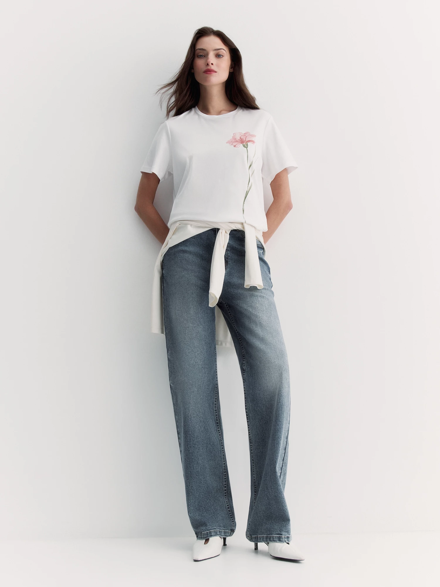 Модель базового белого цвета хорошо сочетается с джинсами и повседневными брюками.