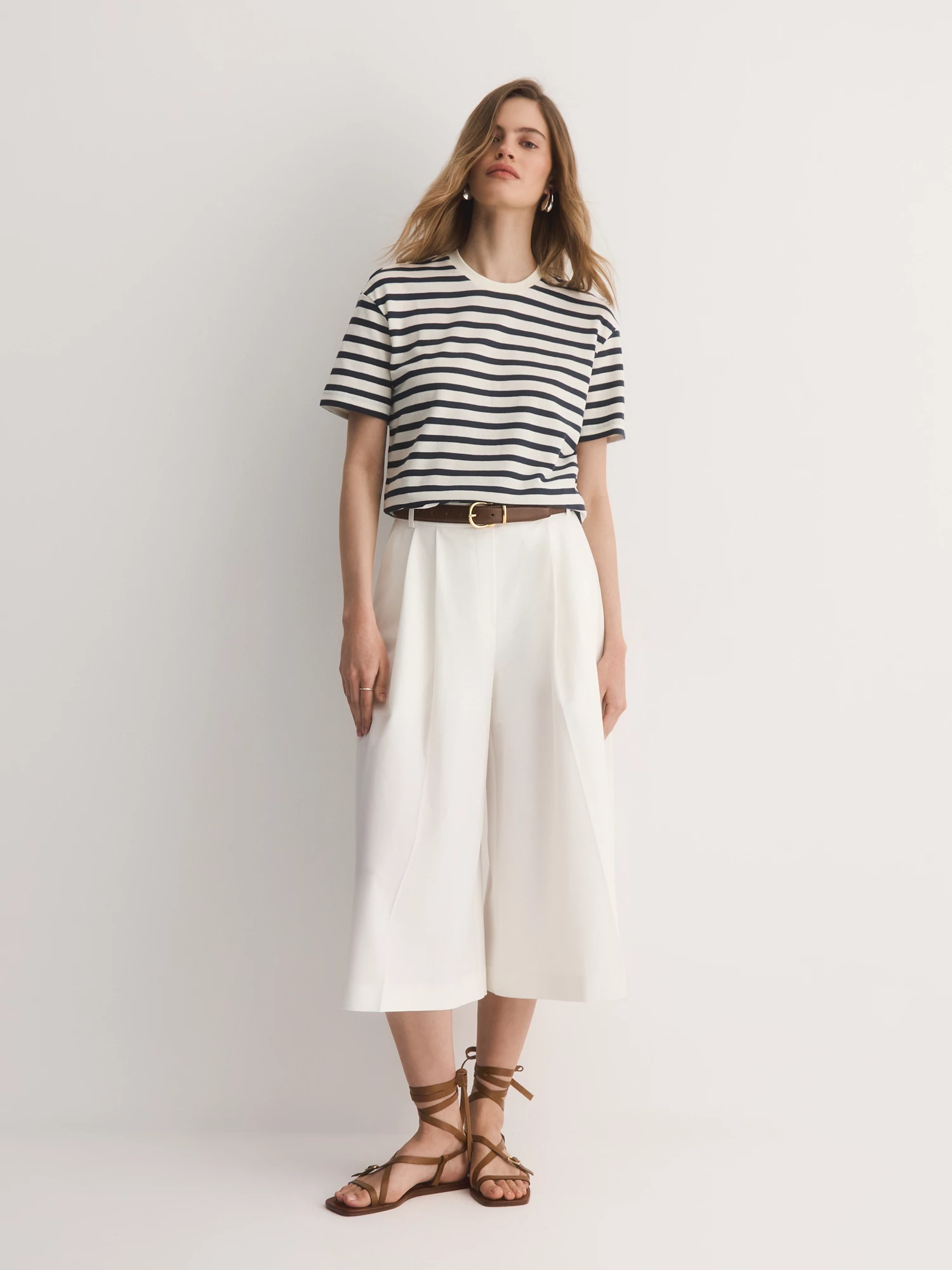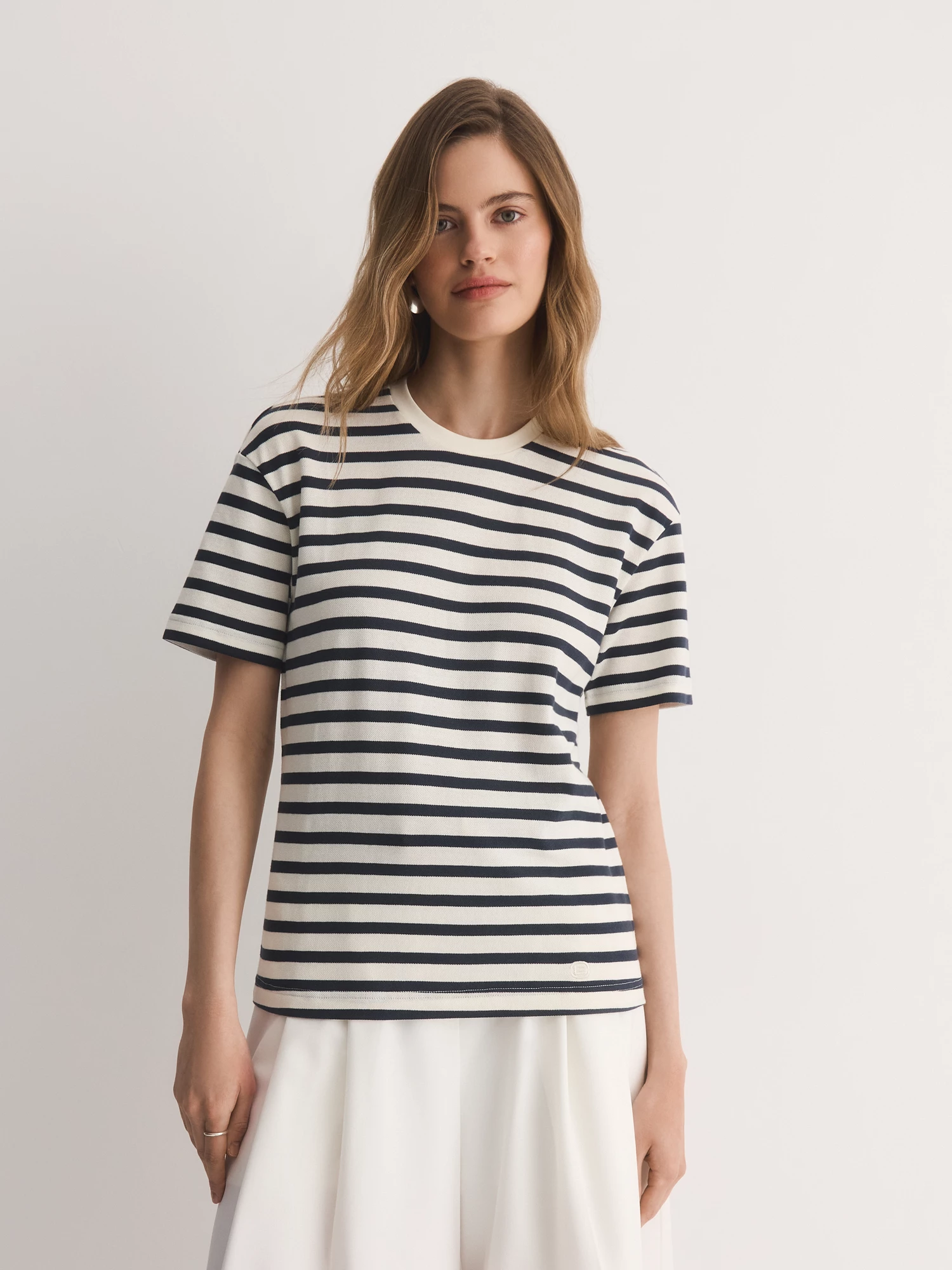 Полосатая футболка слегка увеличенного объема – обязательный элемент этого сезона для расслабленных образов. Сшитая из тонкого вискозного трикотажа в бело-синюю полоску, она мягкая, приятная к телу и отлично дышит.