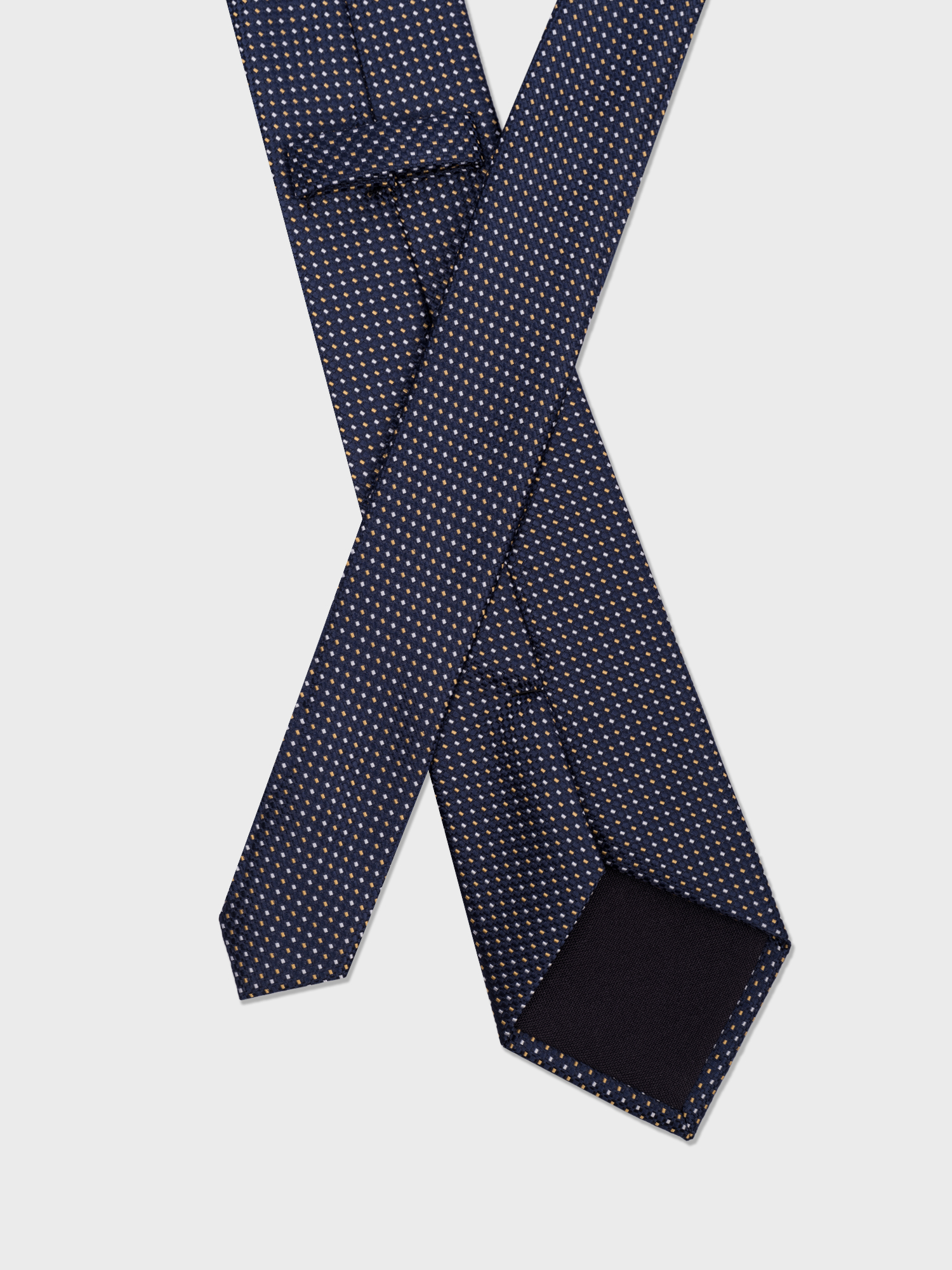 Галстук выполнен из темно-синего искусственного шелка с точечным узором. Подчеркнет индивидуальный стиль современного делового мужчины