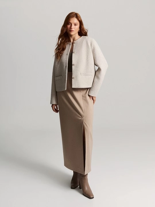 Классический бежевый цвет делает жакет универсальным. Его можно носить с брюками, юбкой из вареной шерсти SK0588K или джинсами для офиса, встреч или повседневных образов.