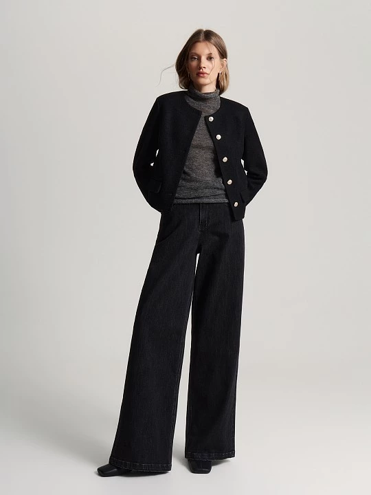 Короткий прямой жакет сшит из тёплой и прочной вареной шерсти. Такая ткань приятна на ощупь, хорошо держит форму и имеет аккуратный внешний вид. Внутри — удобная подкладка для комфорта и лучшей посадки.