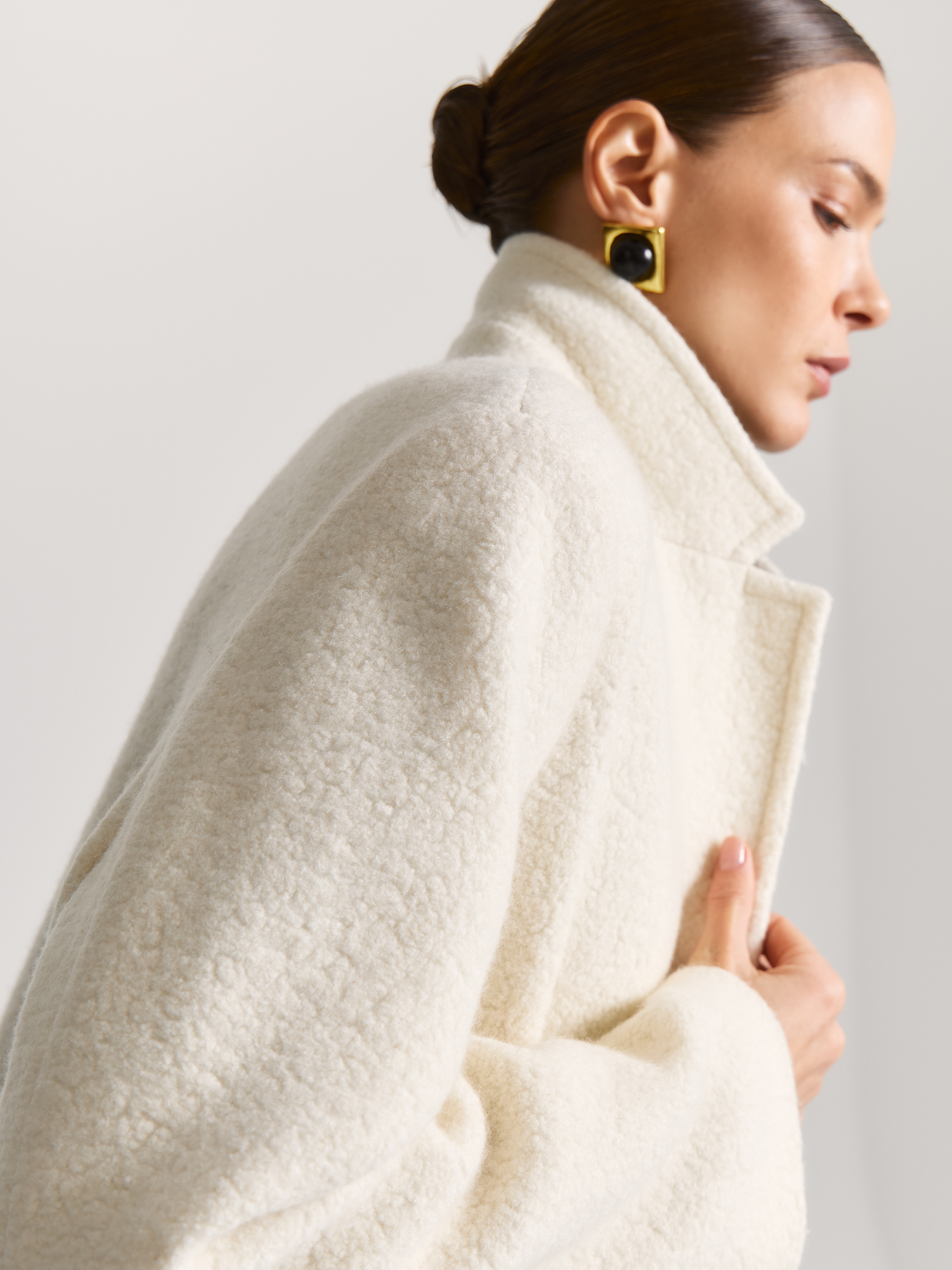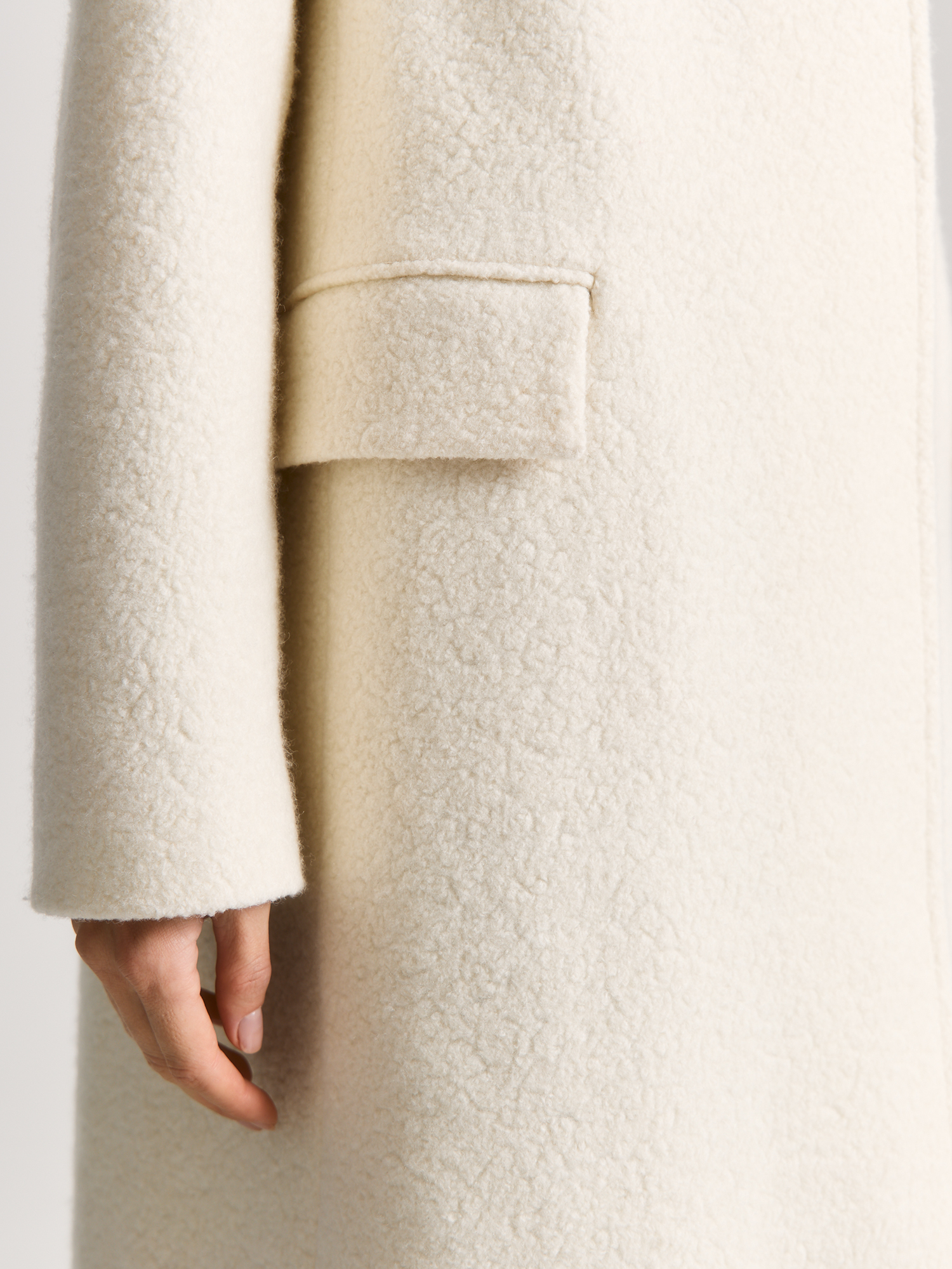 Ткань с текстурой букле придает модели особый шарм, а поливискозная подкладка добавляет комфорта и долговечности. Пальто с аккуратным отложным воротником и лацканами застегивается на незаметные кнопки, чтобы подчеркнуть фактуру ткани.