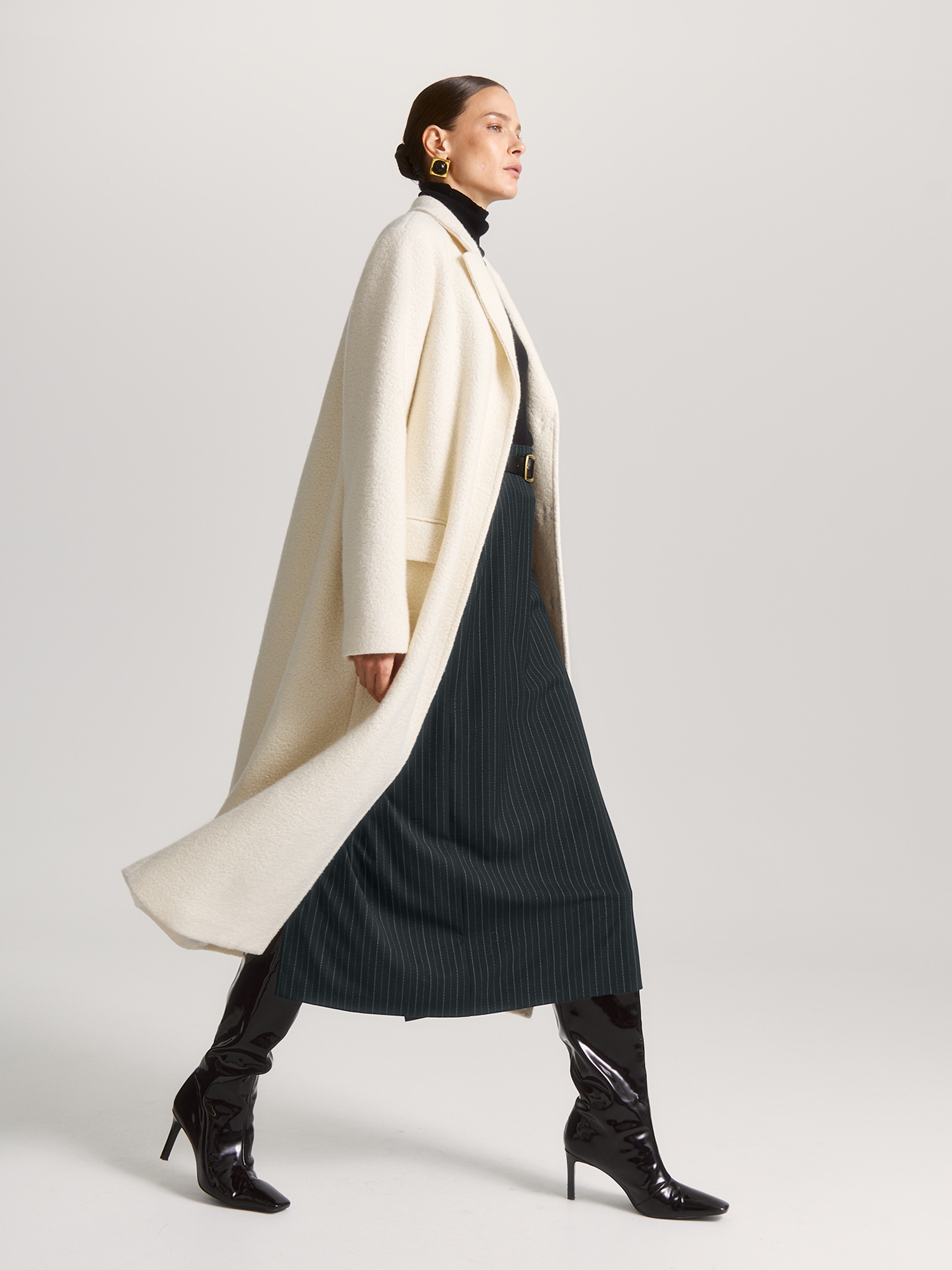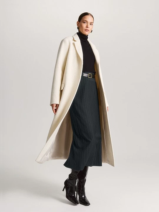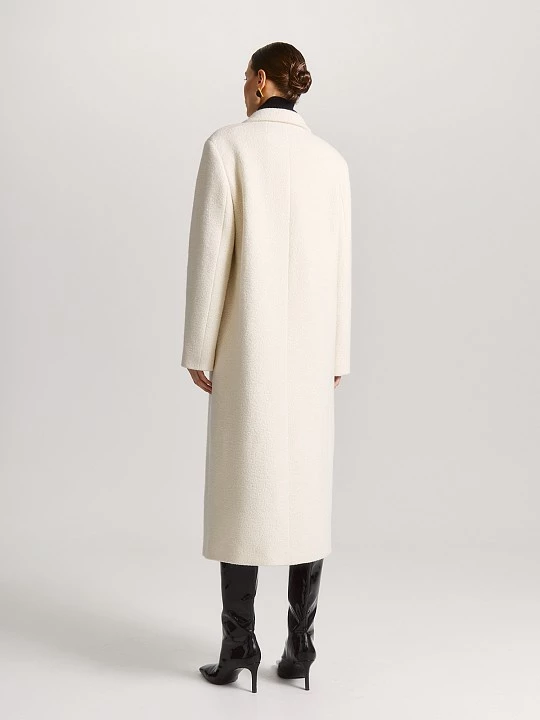 Однобортное пальто классического кроя сшито из шерстяной ткани-букле в нежном молочном оттенке. Тёплое, уютное и универсальное — оно подойдет как для повседневной носки, так и для парадного выхода.