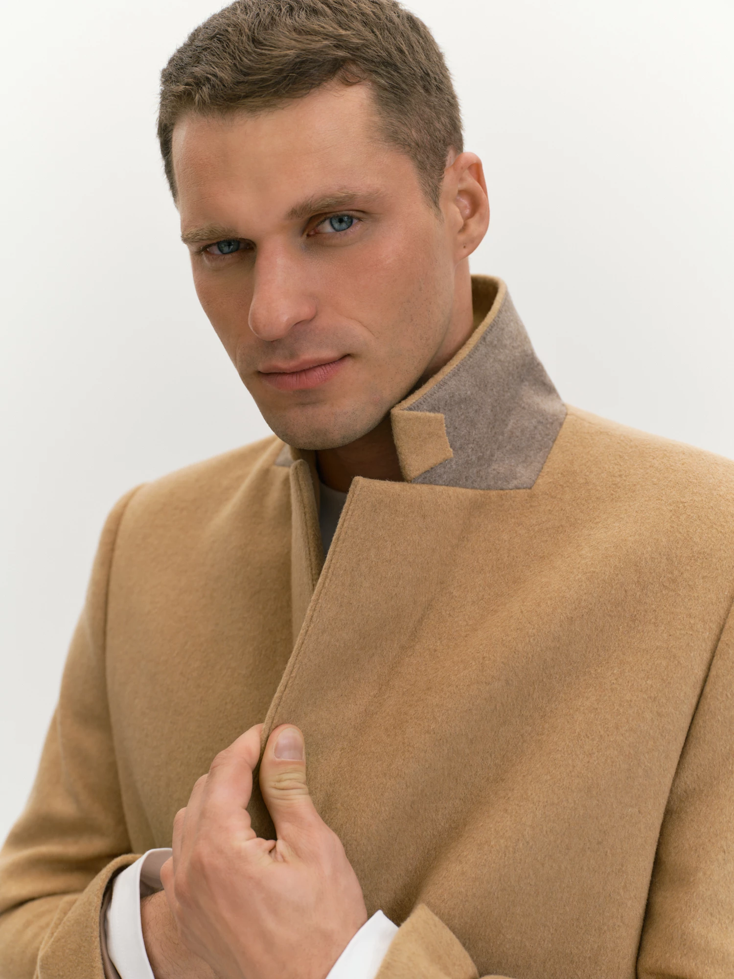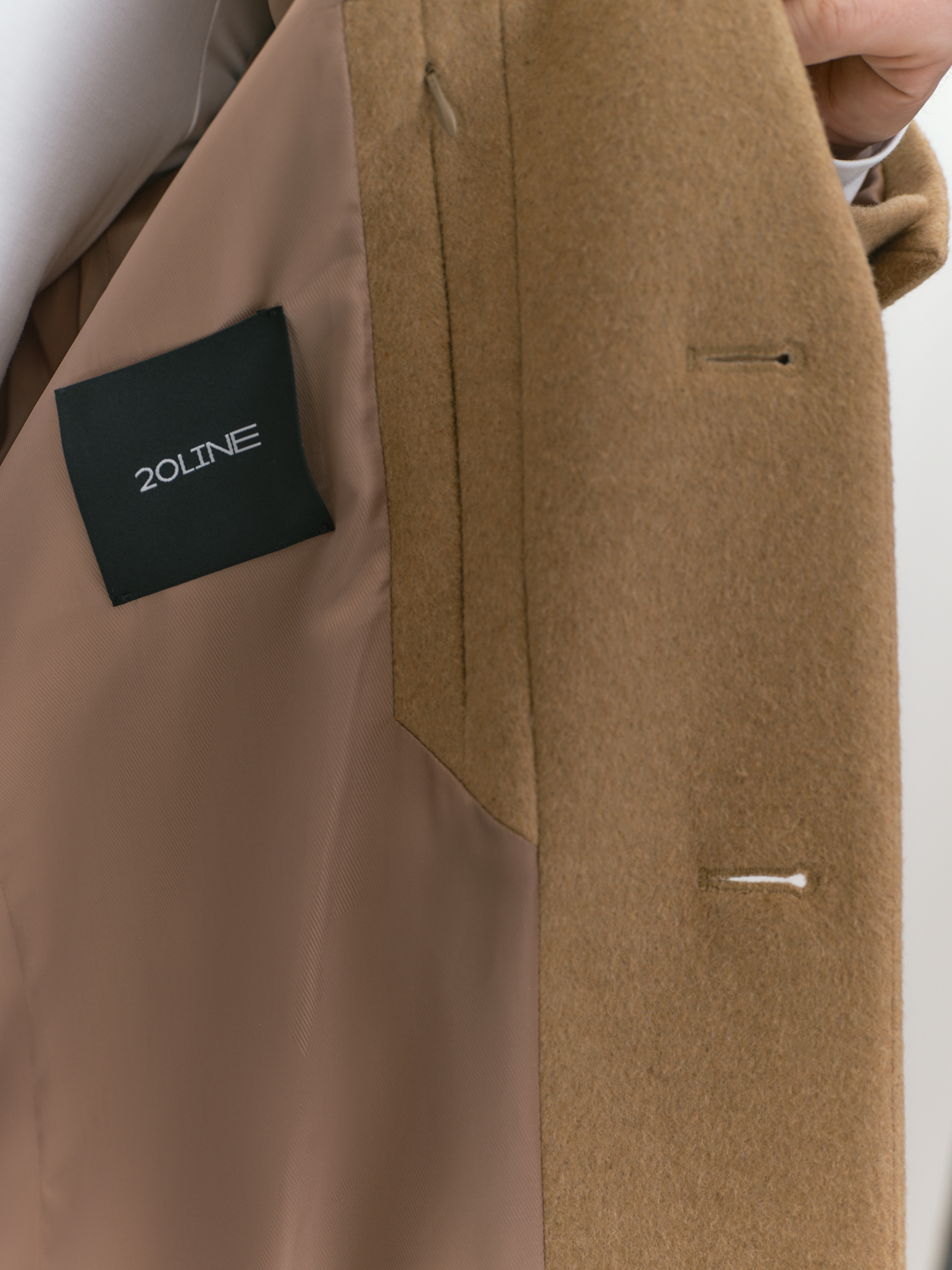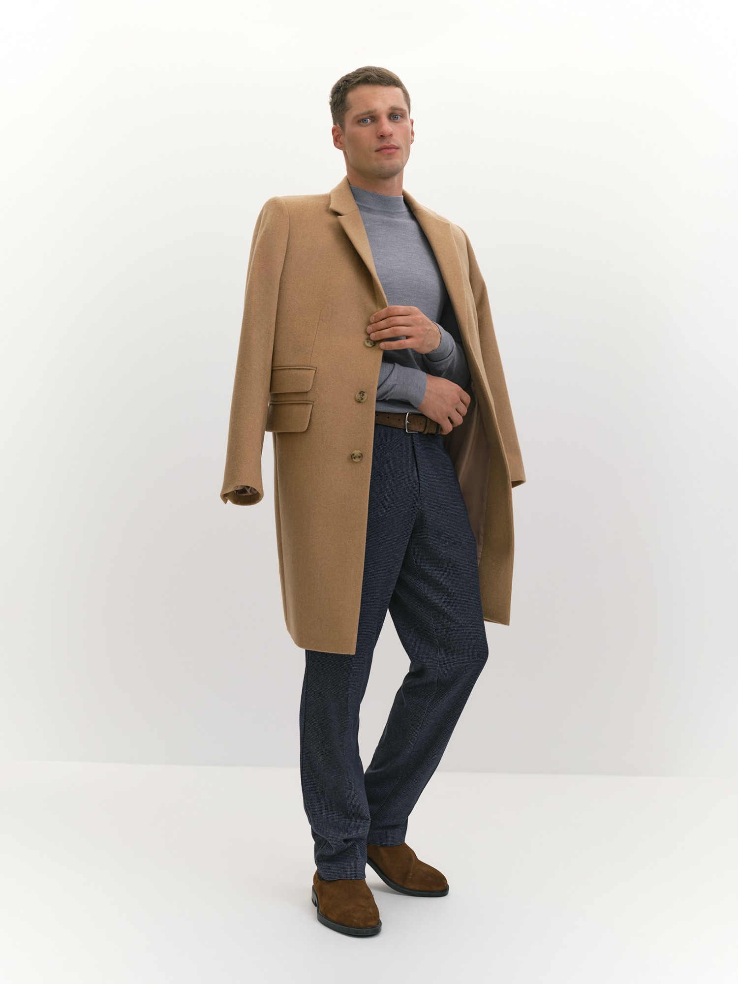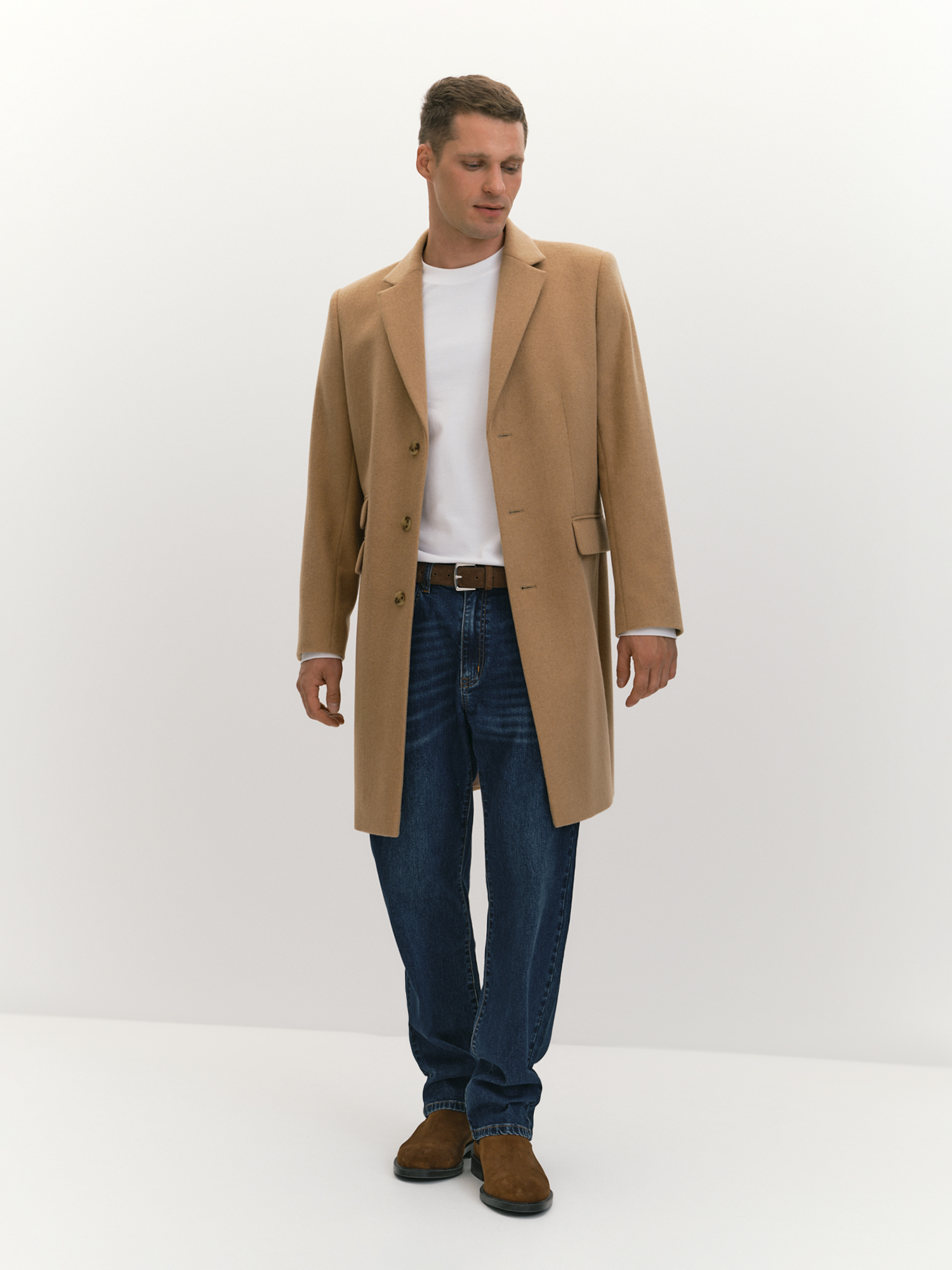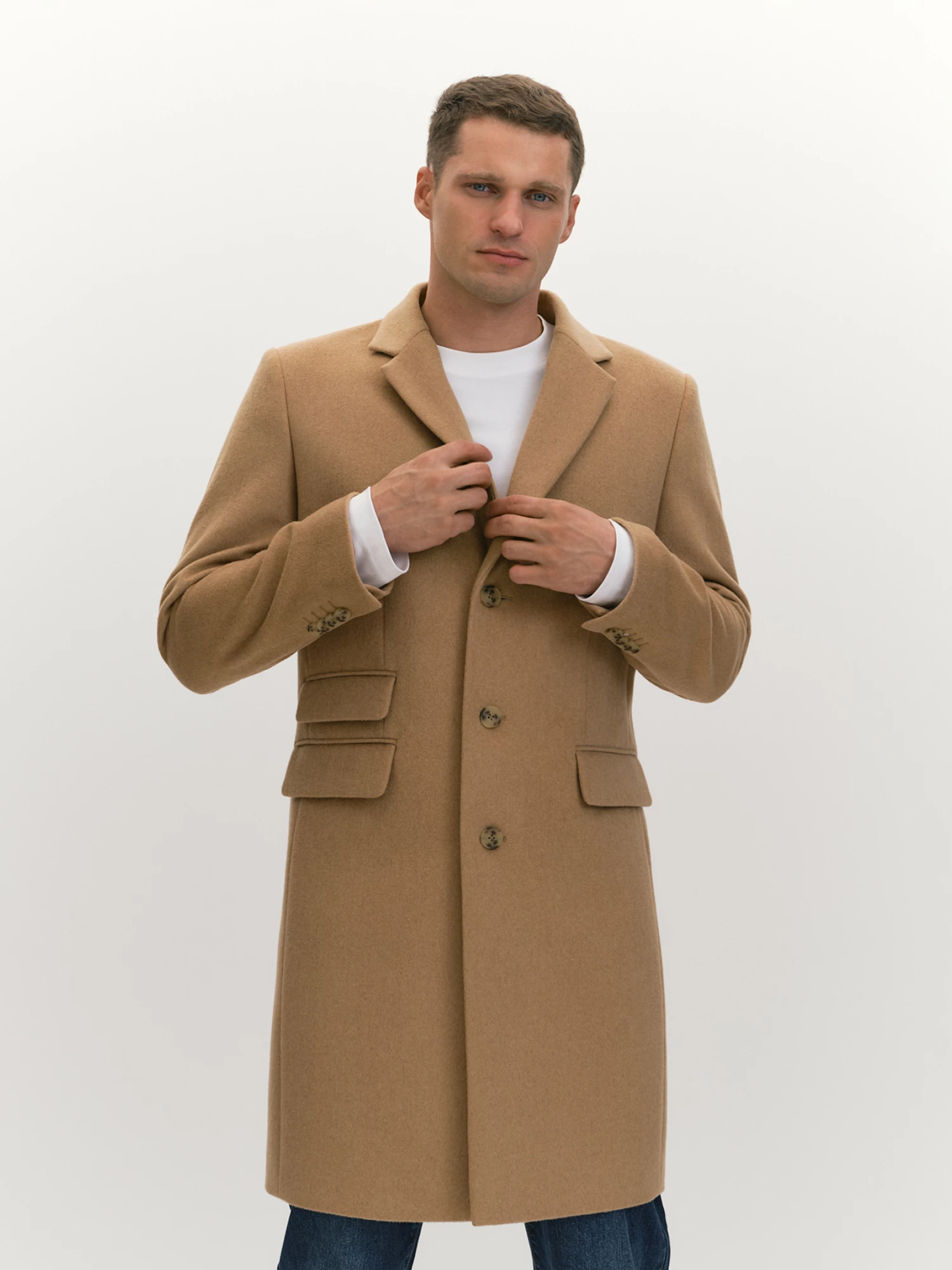 Классическое пальто универсального бежевого цвета - участник базового гардероба, подойдет и к деловым образам, и логично завершит комплект в стиле casual. Выбрали для однобортной модели V-образный вырез, оформленный отложным воротником с лацканами, и втачной двухшовный рукав, хорошо держащий форму. Функциональные боковые карманы с клапанами поддерживают общий стиль изделия, а дополнительный карман с клапаном добавляет актуальности базовой модели. Пальто средней длины дополнено высокой шлицей, обеспечивающей Вам уверенный шаг. Вертикальные вытачки и рельефы, а также полная подкладка, для стилизации выполненная с бордовой окантовкой, гарантируют лучшую посадку. Модель является полноценной демисезонной, а также подходит для европейской зимы, ведь овечья шерсть хорошо согревает. Вы можете завершить таким пальто костюмный образ, надеть его с джинсами и джемпером, или даже с худи, ведь качественная шерстяная ткань, классический крой и природный бежевый оттенок делают модель универсальной, подходящей для офиса, вечернего выхода, повседневной носки, прогулок.