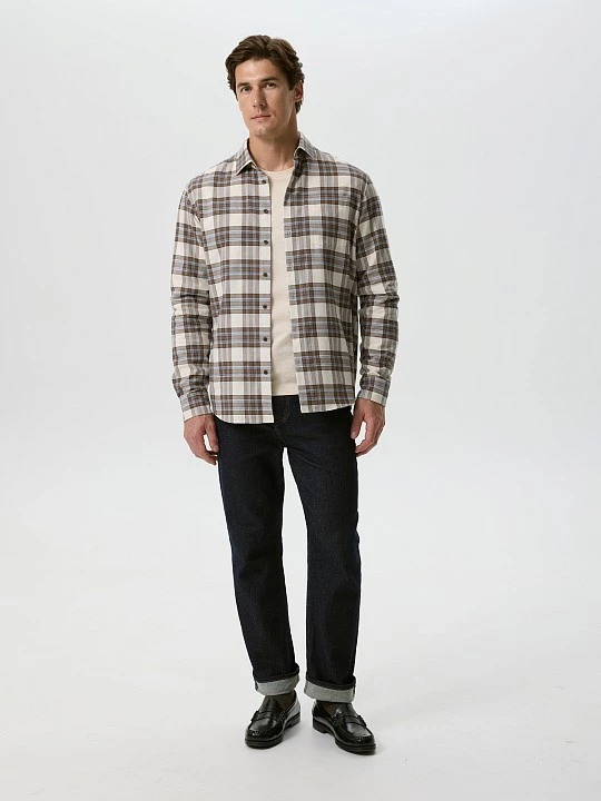 Рубашка в классическую бежево-коричневую клетку выполнена из мягкой хлопчатобумажной фланели. Модель комфортного силуэта regular fit, с длинным рукавом, лаконичного кроя: отложной воротник на отрезной стойке, центральная застежка на пуговицы, закругленный низ. Узкая кокетка и бантовая складка обеспечивают хорошую посадку по спине и плечам. Декоративная петля добавлена в поддержку стиля. Привлекает внимание нагрудный карман со скошенным углом. Хлопок гипоаллергенен, хорошо дышит, удобен в эксплуатации. Фланель при стирке не садится и не линяет, если температура воды не превышает рекомендованную. Теплая сорочка будет востребована как неформальная офисная, школьная, повседневная. Наши дизайнеры рекомендуют носить ее в паре с футболкой или водолазкой, чтобы создать модную многослойность.