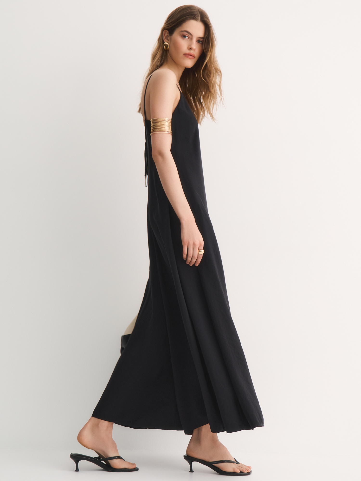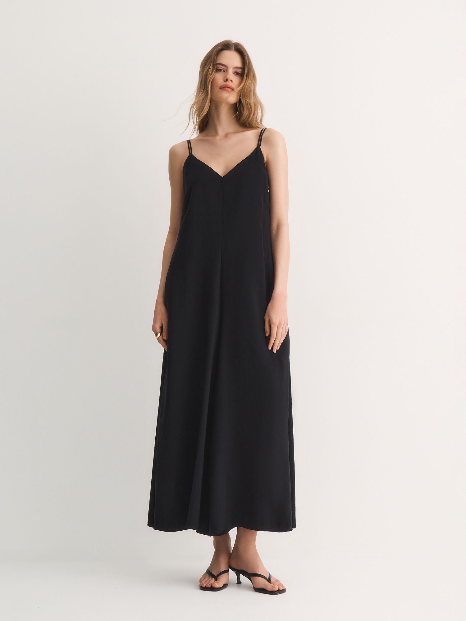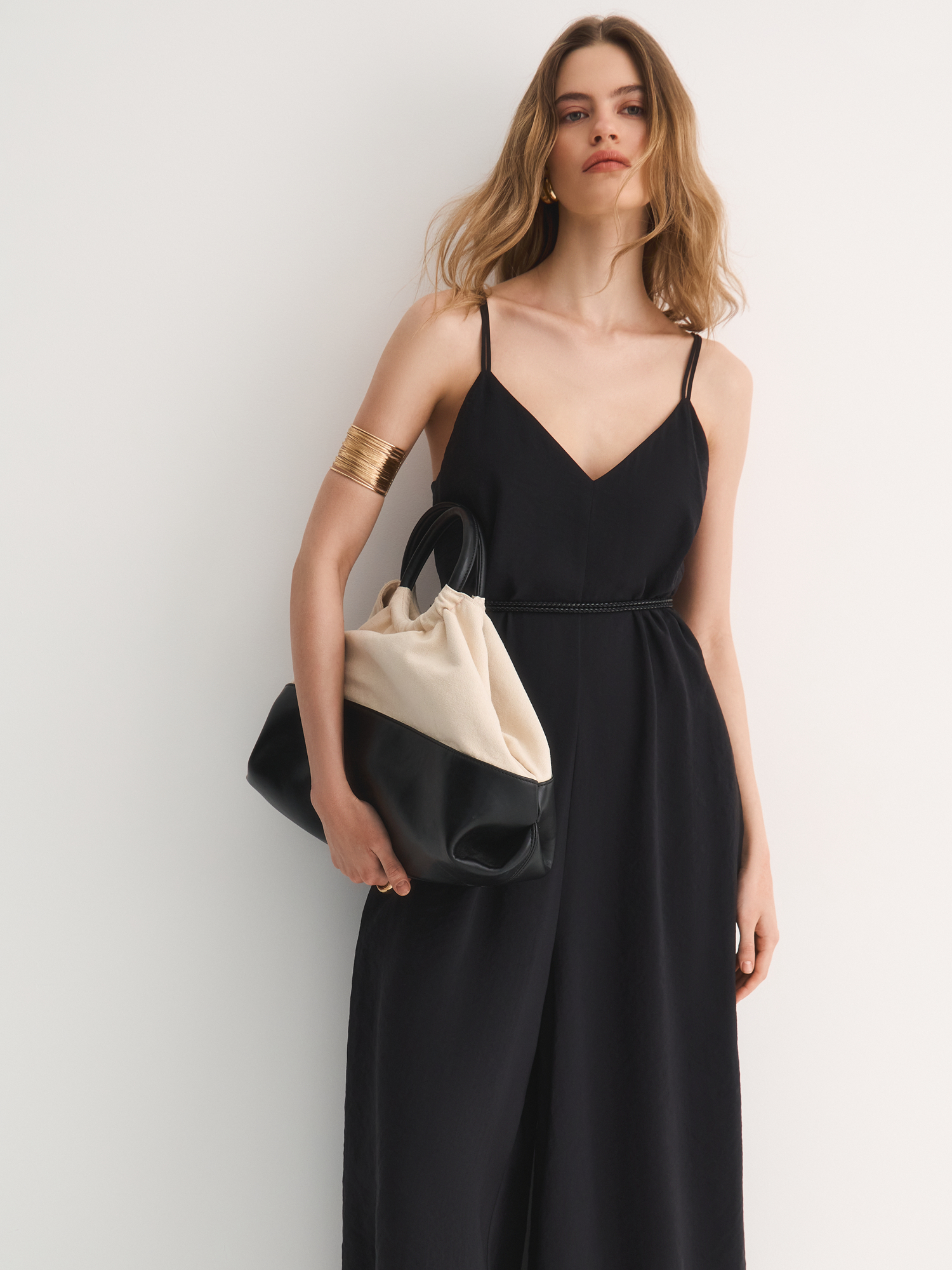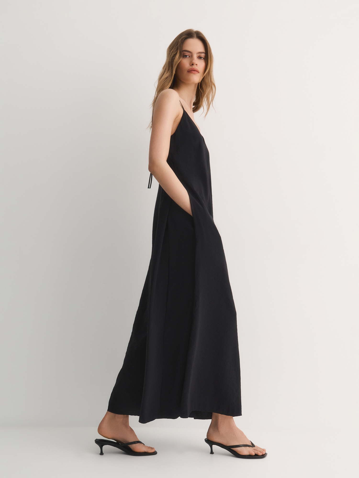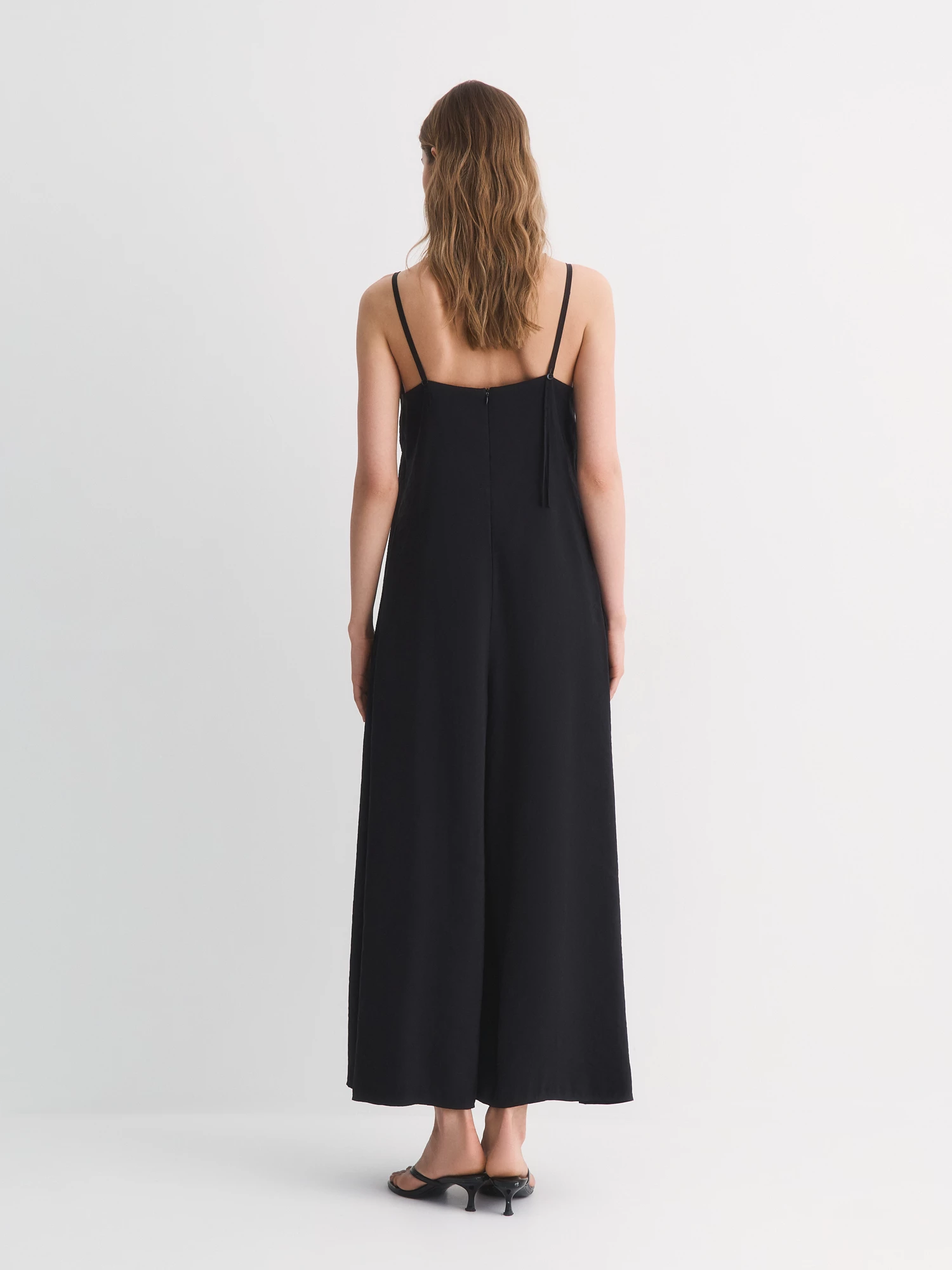 У модели широкий V-вырез и регулируемые бретели, которые помогают подобрать идеальную длину. Полуприлегающий силуэт подчеркивает фигуру, но не сковывает движений, а потайная молния сзади делает комбинезон аккуратным и удобным в носке. Широкие брючины добавляют образу легкости и динамики.
