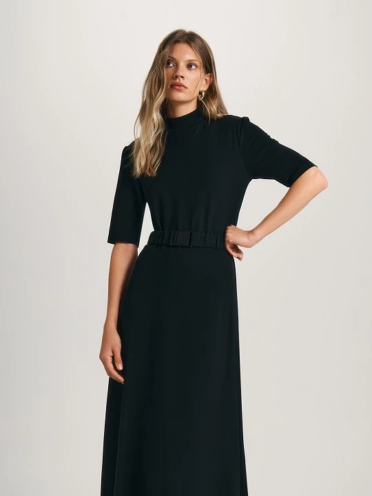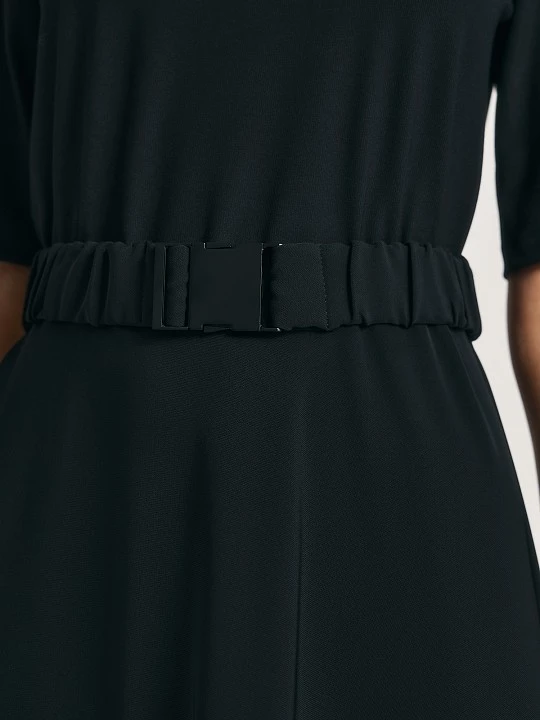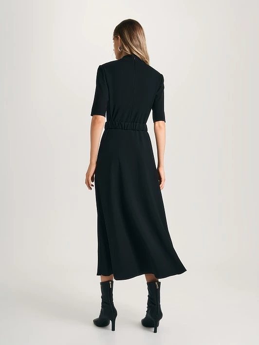 Модель длины миди выполнена с отрезным воротником-стойкой и застежкой сзади на потайную молнию. Втачной короткий рукав позволяет сразу подобрать к платью жакет из широкого ассортимента коллекции. Легкое расклешение нижней части платья, выполненной из высокотехнологичного полиэстера, обеспечивает правильную посадку по бедрам. Пояс из основной ткани с надежной пряжкой-фаст, выполненный на резинке, дополнительно подчеркивает талию. Модель комбинированная, для верха платья выбрали супер-эластичный вискозный трикотаж, для низа - качественный полиэстер с добавлением спандекса. Благодаря такому сочетанию изделие формоустойчиво, долговечно, воздухопроницаемо и тактильно приятно. Таинственный черный притягивает внимание, наши стилисты советуют усилить этот эффект аксессуарами с россыпью кристаллов и сумкой кросс-боди.