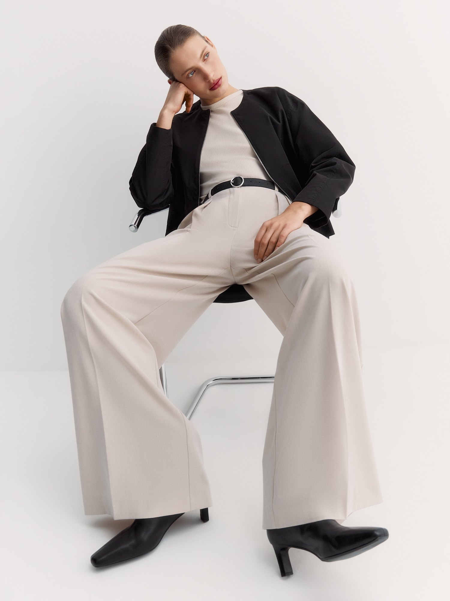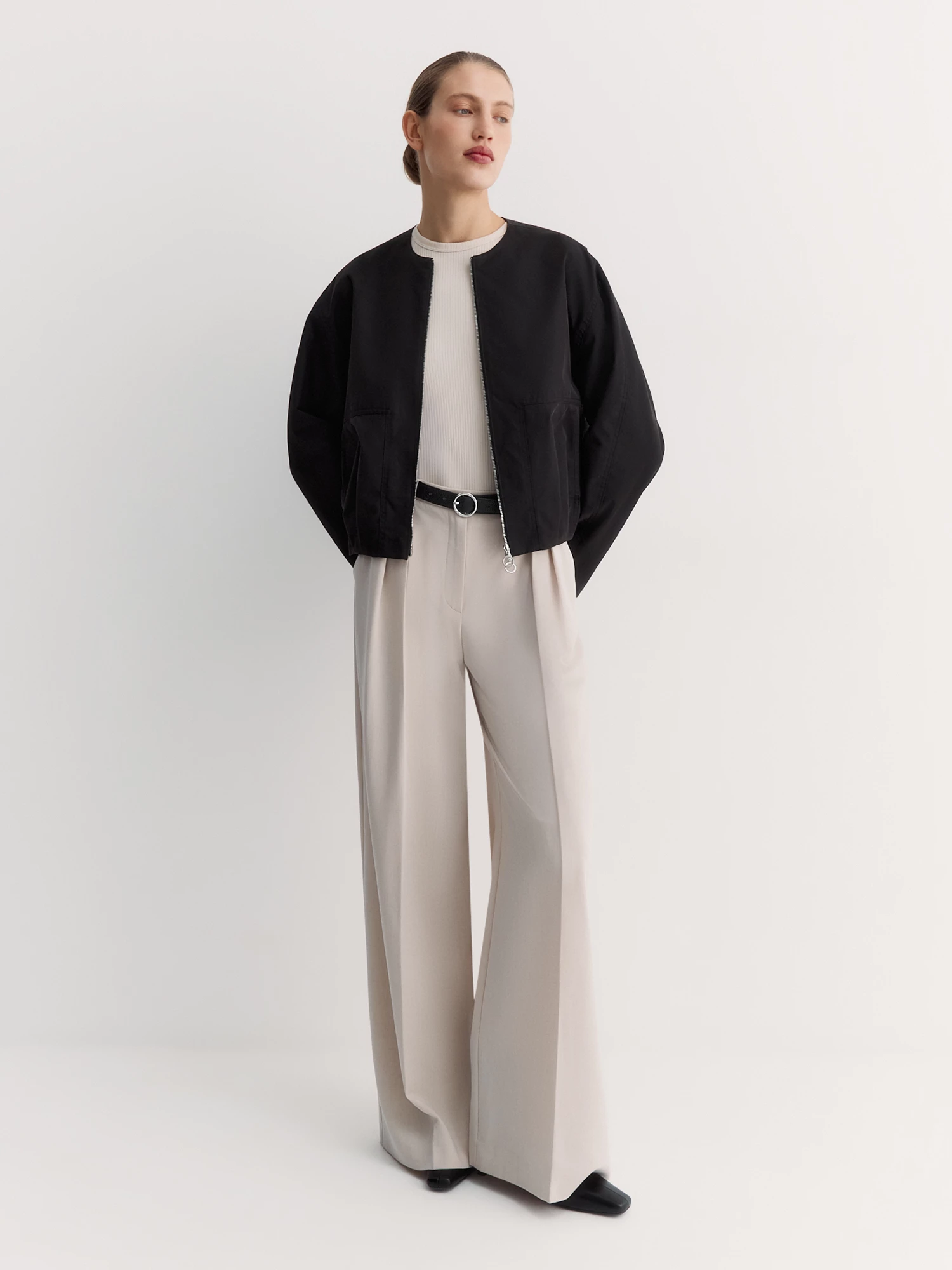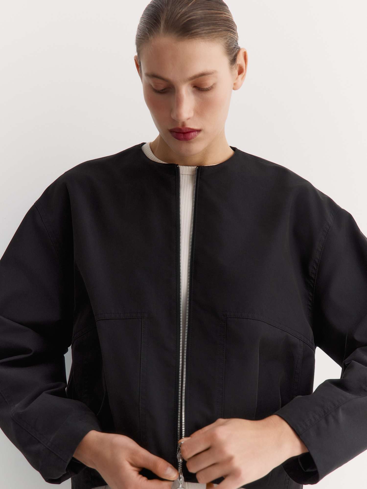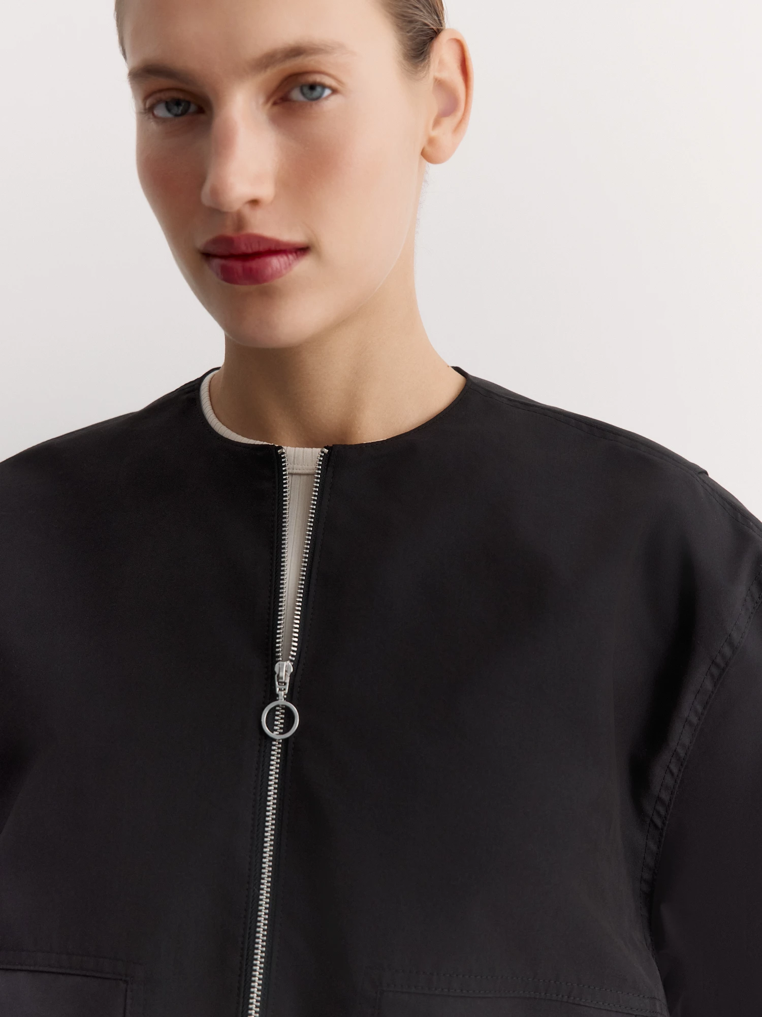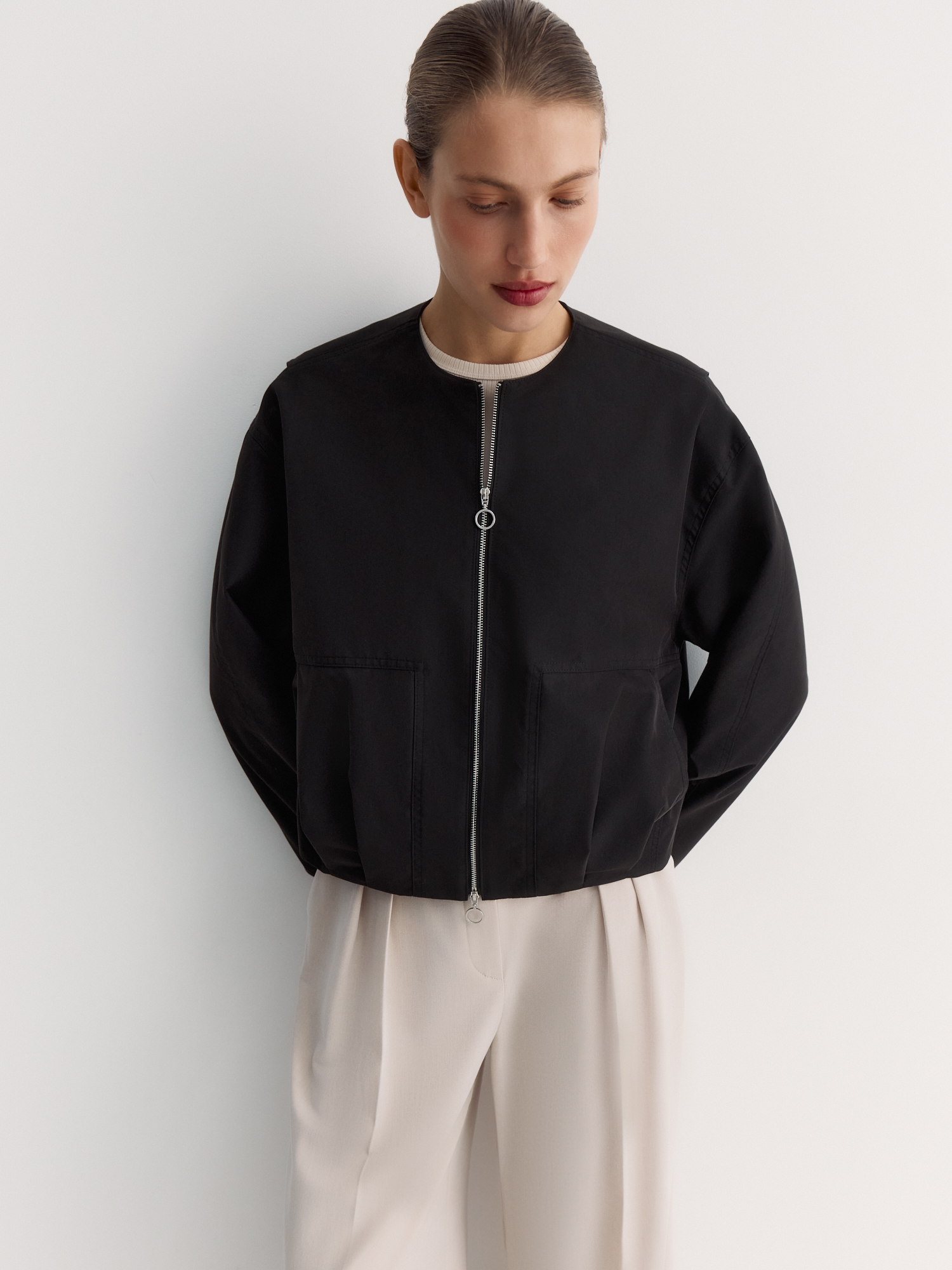 Круглый вырез и застёжка на молнию создают лаконичный вид. Особенность – спинка с эффектом многослойности и встречными складками, а также оригинальные складки спереди, направленные от застежки. Накладные карманы с угловым входом удобны и добавляют стиля.