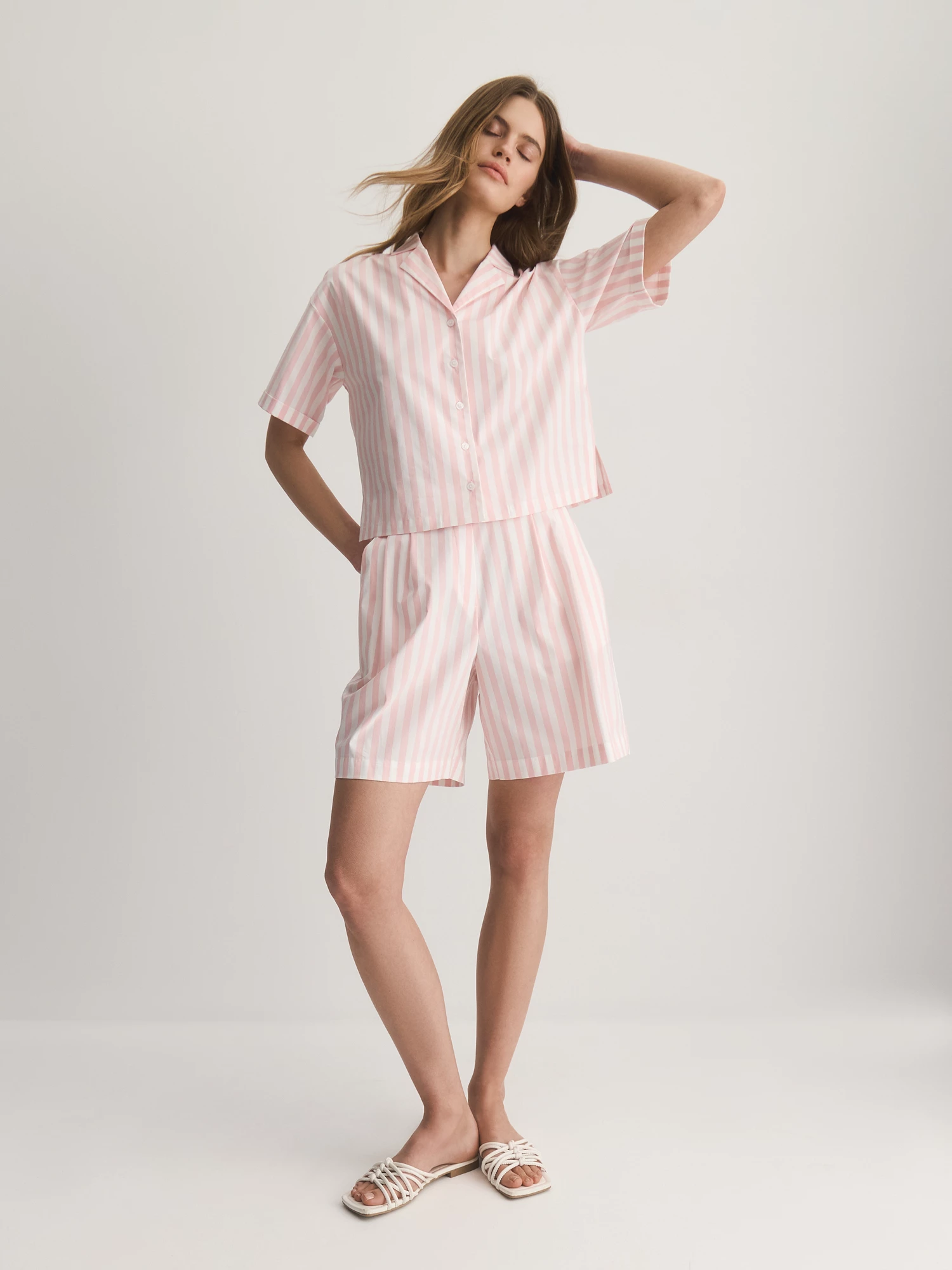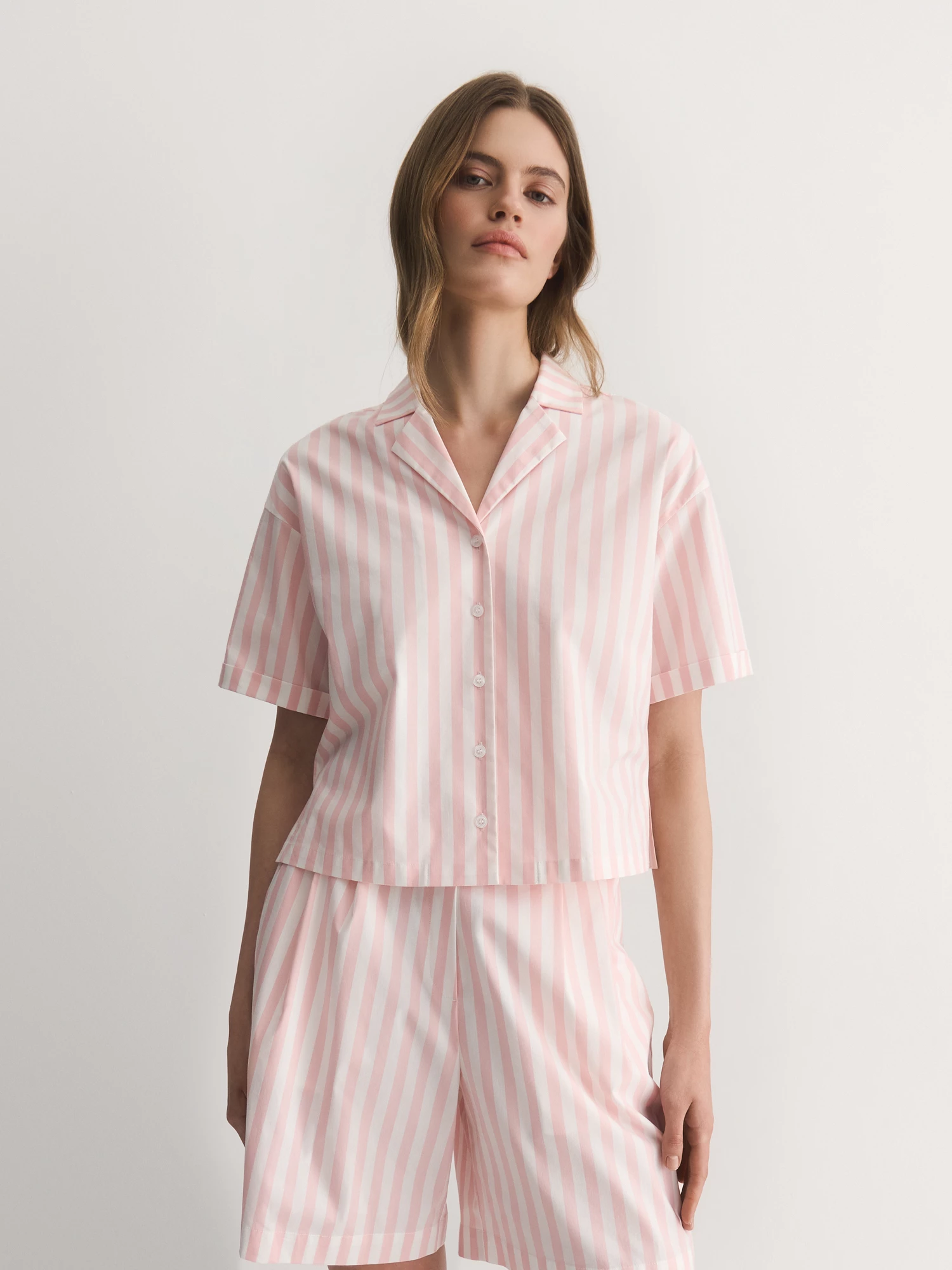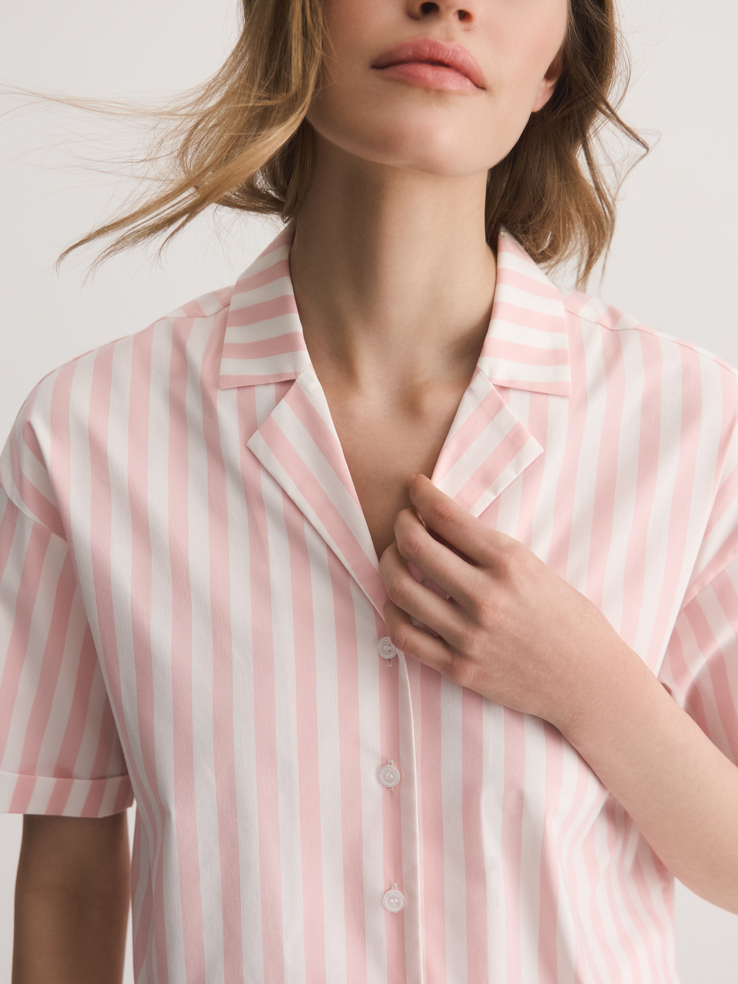 Свободная прямая рубашка в пижамном стиле с бело-розовой полоской.