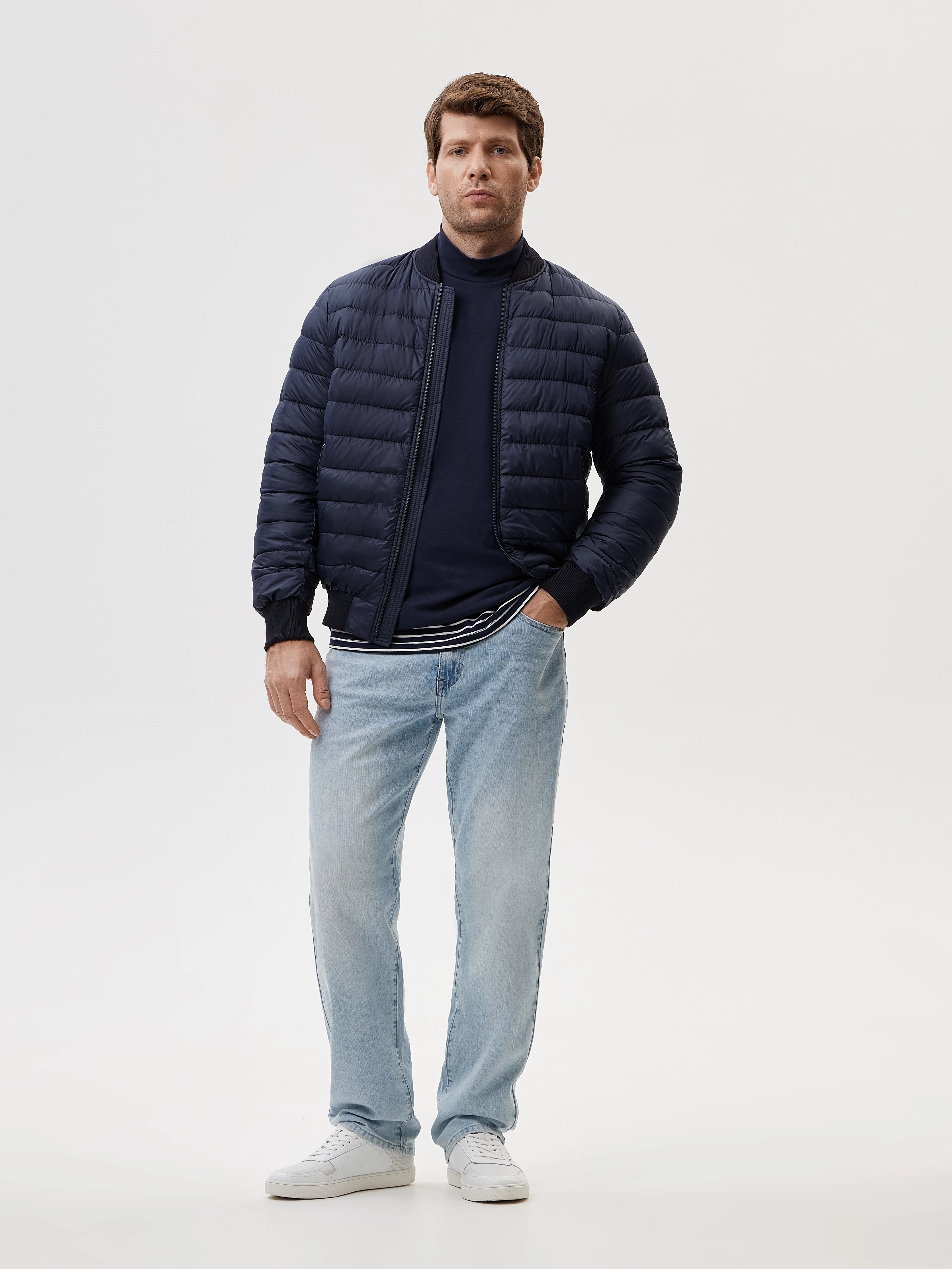 Стильный бомбер силуэта regular с горизонтальной стежкой подойдет для образа в спортивном, кэжуал и смарт кэжуал стиле. Модель хорошо защищает холодного ветра, выполнена с внутренним ветрозащитным клапаном и традиционными для бомбера подвязами по горловине, низу и рукавам. Благодаря полному циклу производства, подвязы созданы на собственной фабрике с помощью японских плосковязальных машин Shima Seiki. Для дополнительной функциональности, куртка дополнена прорезными боковыми карманами с вертикальным входом и внутренним карманом. Для стилизации бомбер декорирован круглым брендированным бейджем и молниями с брендированными пуллерами. Весенний тонкий пуховик выполнен из качественной плащевой ткани с влагозащитной пропиткой и утеплен синтепухом. Синтепух - это современный высокотехнологичный наполнитель, отличающийся легкостью, упругостью и хорошими теплоизоляционными свойствами. Благодаря горизонтальной стежке, выполненной на собственном производстве, наполнитель правильно распределен внутри изделия и надежно зафиксирован. Глубокий, контрастный и строгий темно-синий хорошо сочетается с денимом, моделями из костюмной ткани и из трикотажного полотна капсулы PERFECT BASE.