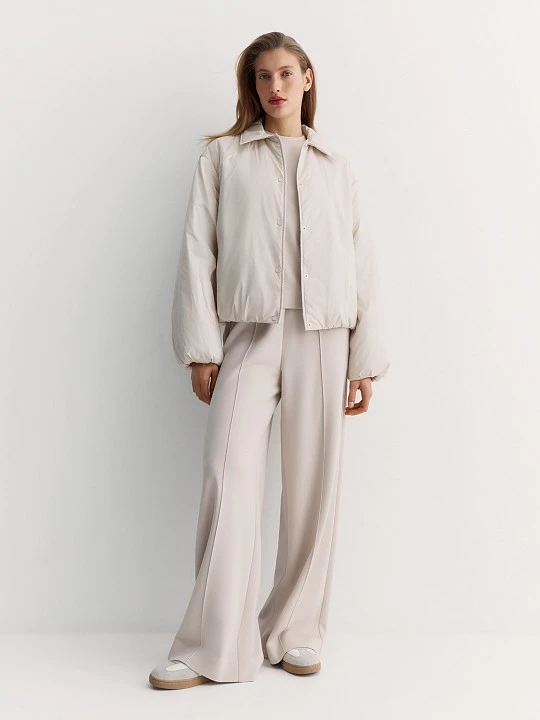 Модель с отложным воротником и спущенным плечом выглядит современно. Длинные рукава мягко фиксируются внутренней резинкой у запястья, чтобы не мешать движению. Лаконичные кнопки в тон ткани надежно застегиваются, а карманы на молнии в боковых швах сохранят Ваши вещи в безопасности. Сборка по низу на резинке добавляет куртке удобный объём и современный О-силуэт.